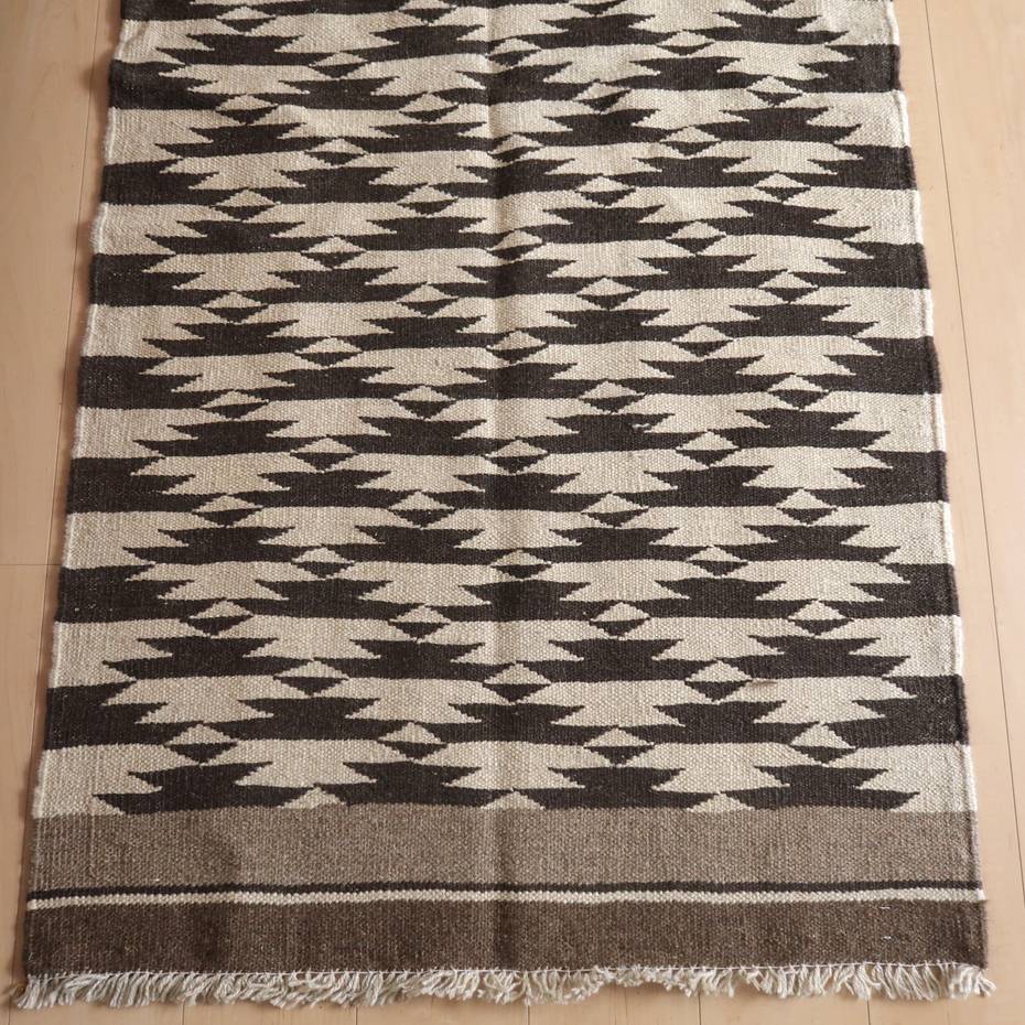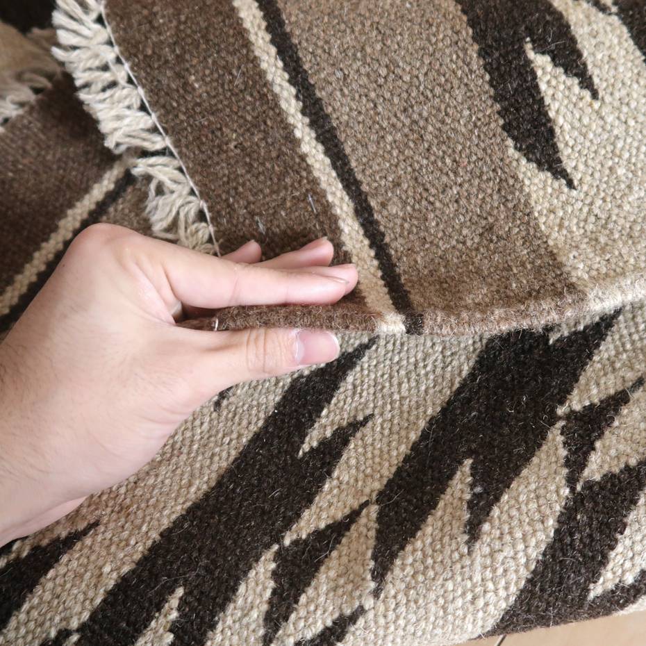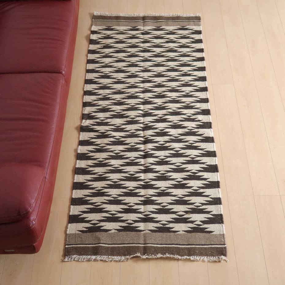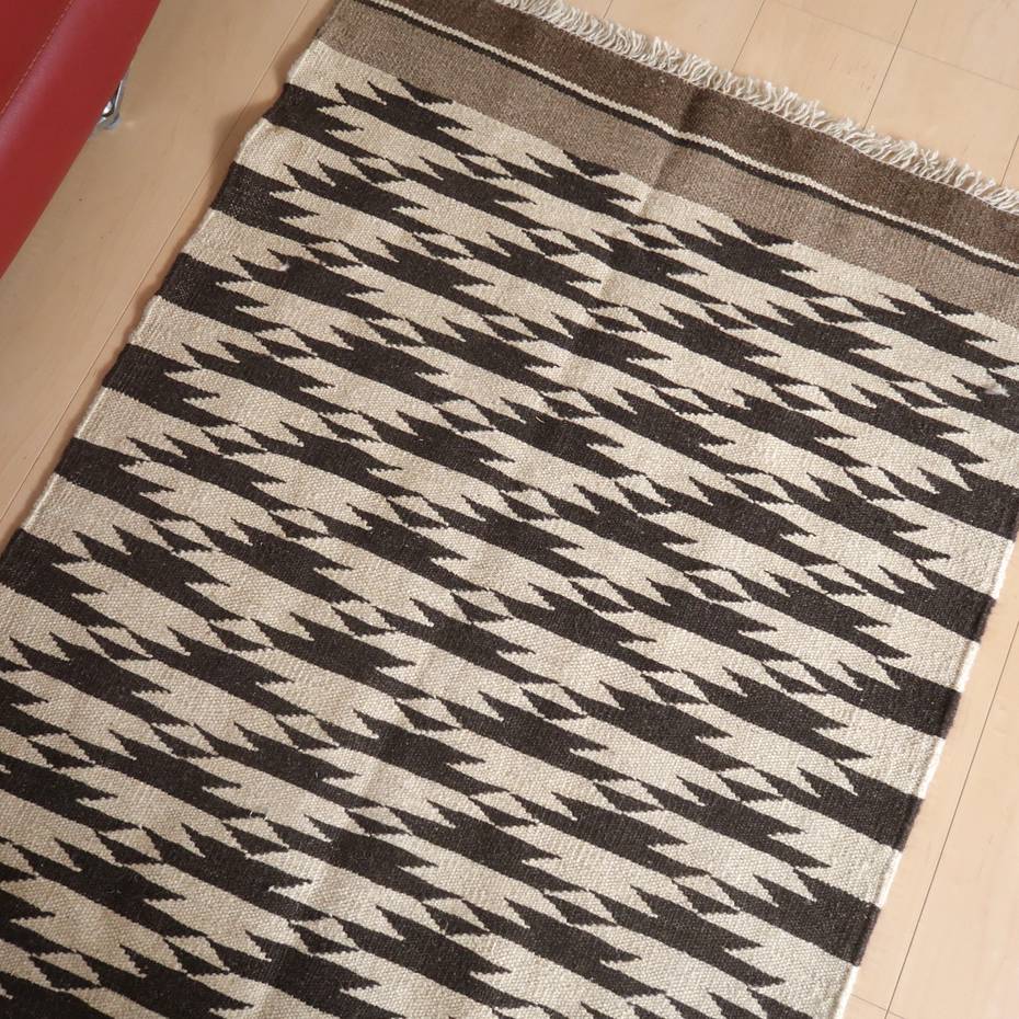 ギャッベでお馴染みのシラーズ地方カシュガイ族に伝わるキリムです。生成りや茶、グレーなどの元々の羊の毛色をそのまま活かした無染色のウールを使用したナチュラルカラーなので、敷く場所を選ばず、落ち着いた雰囲気で馴染みます。幾何学やギザギザ文様のシンプルな中にもリズムのあるモダンなデザイン。カシュガイの女性が昔ながらに織り上げたキリムなので、よく締まった丈夫な織り目で、早く仕上げる為、ゆるく粗く織られる商用生産のキリムには無い、誠実さと愛着が感じられる味わい深さがあります。作りは、平織り(ひらおり)という裏表の無い、両面を使える織り方。カシュガイ・キリムは遊牧のテント生活用の為、丈夫に織られ、洗濯も簡単、普段使いのラグとして扱いやすいキリムです。