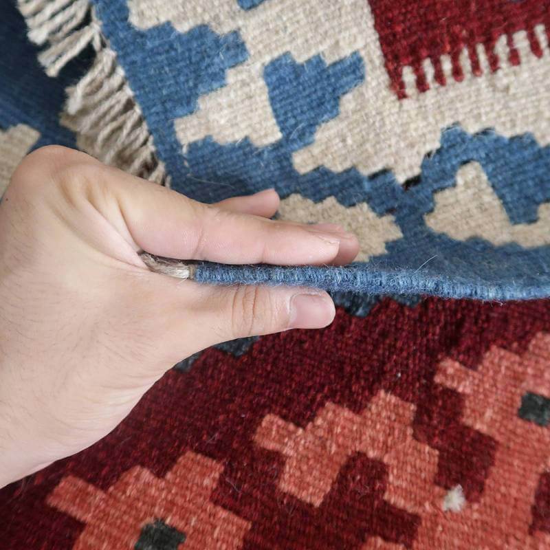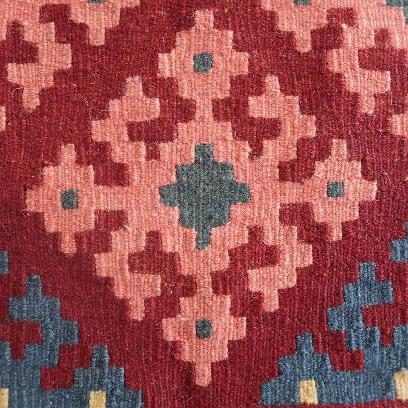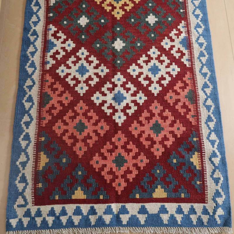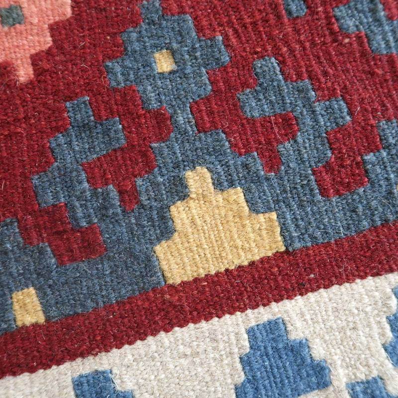 イラン南部シラーズ地方のキリムです。いくつかの色を使用した幾何学柄やギザギザ文様はリズムのある明るい雰囲気。使用している色はどれも、くすみのある落ち着いた色なので、目立たずインテリアに馴染みます。カシュガイの女性が昔ながらに織り上げたキリムなので、よく締まった丈夫な織り目で、早く仕上げる為、ゆるく粗く織られる商用生産のキリムには無い、誠実さが伝わってくる一枚です。また、平織り(ひらおり)という裏表の無い織り方で両面使えます。カシュガイ・キリムは遊牧のテント生活用の為、丈夫に織られ、洗濯も簡単、普段使いのラグとして扱いやすいキリムです。