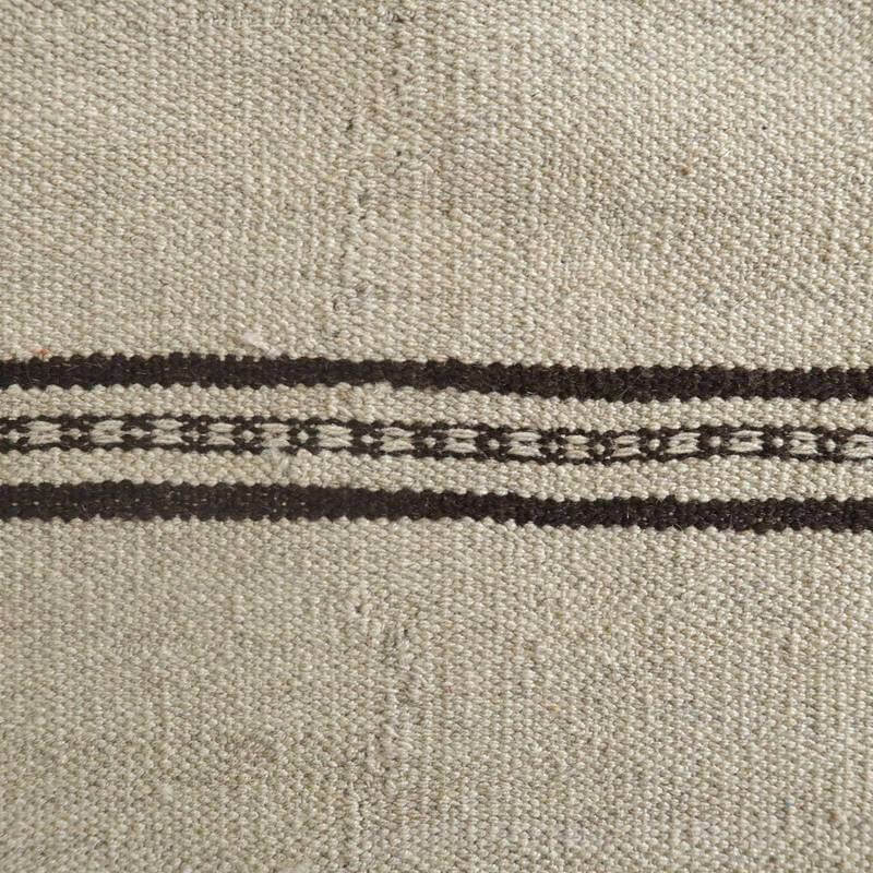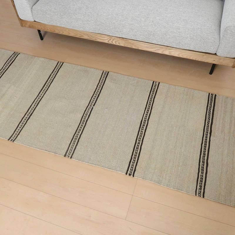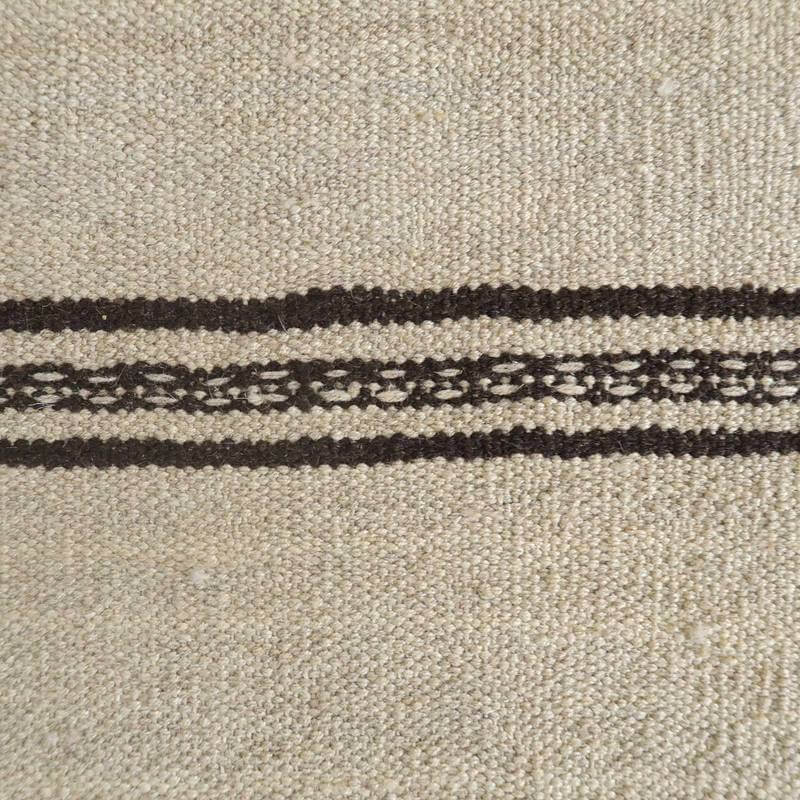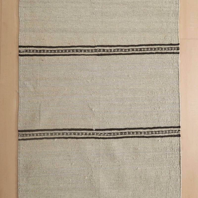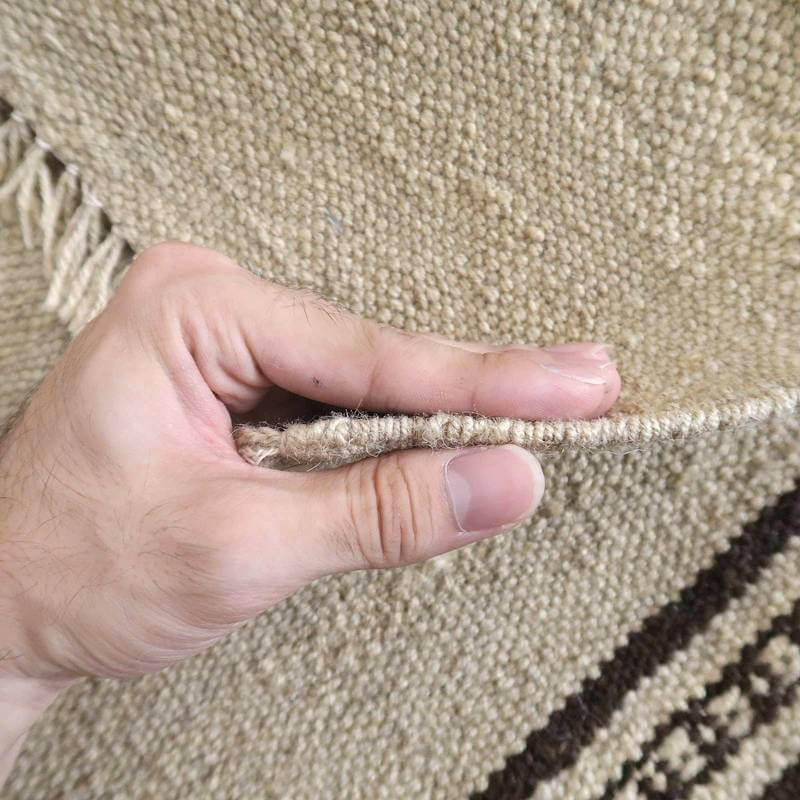 ギャッベでお馴染みのシラーズ地方カシュガイ族に伝わるキリムです。生成りや茶、グレーなどの元々の羊の毛色をそのまま活かした無染色のウールを使用したナチュラルカラーなので、敷く場所を選ばず、落ち着いた雰囲気で馴染みます。幾何学やギザギザ文様のシンプルな中にもリズムのあるモダンなデザイン。カシュガイの女性が昔ながらに織り上げたキリムなので、よく締まった丈夫な織り目で、早く仕上げる為、ゆるく粗く織られる商用生産のキリムには無い、誠実さが伝わってくる一枚です。また、平織り(ひらおり)という裏表の無い織り方で両面使えます。カシュガイ族の遊牧のテント生活用の為、丈夫に織られ、洗濯も簡単、床なじみの良い適度な厚さで、普段使いのラグとして大変使いやすいキリムです。