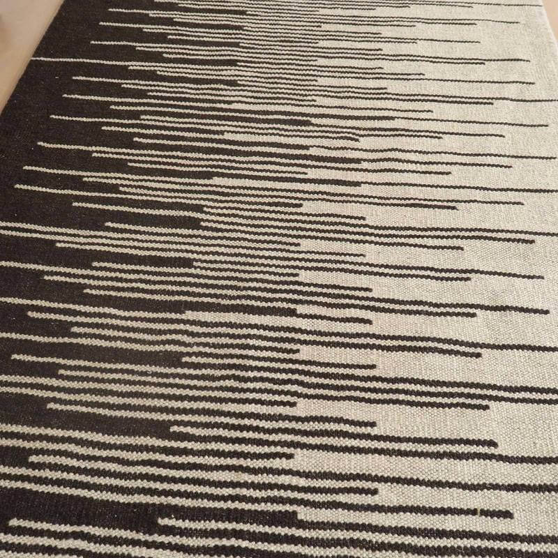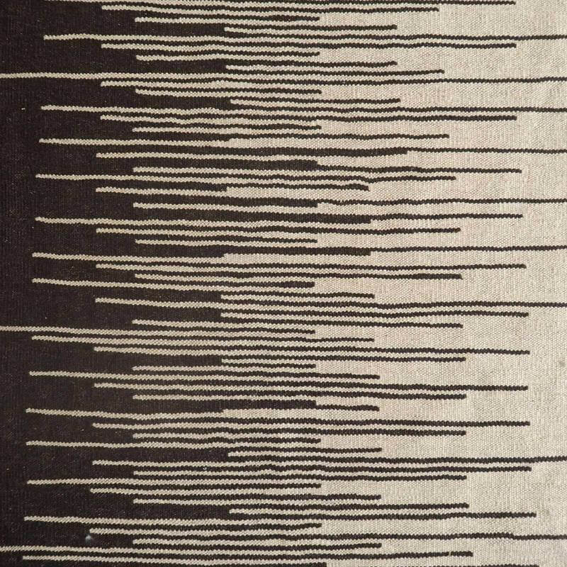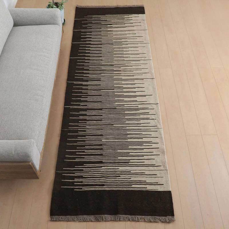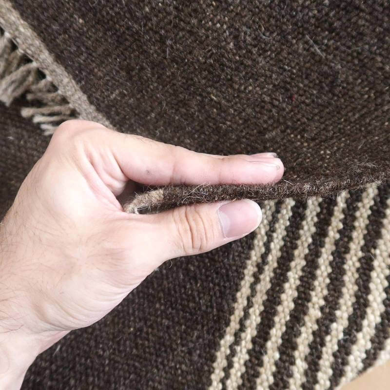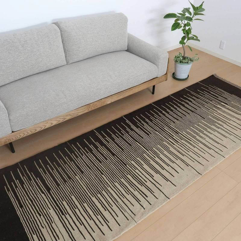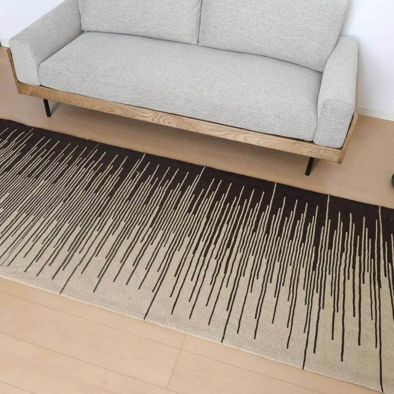 ギャッベでお馴染みのシラーズ地方カシュガイ族に伝わるキリムです。生成りや茶、グレーなどの元々の羊の毛色をそのまま活かした無染色のウールを使用したナチュラルカラーなので、敷く場所を選ばず、落ち着いた雰囲気で馴染みます。幾何学やギザギザ文様のシンプルな中にもリズムのあるモダンなデザイン。カシュガイの女性が昔ながらに織り上げたキリムなので、よく締まった丈夫な織り目で、早く仕上げる為、ゆるく粗く織られる商用生産のキリムには無い、誠実さが伝わってくる一枚です。また、平織り(ひらおり)という裏表の無い織り方で両面使えます。カシュガイ族の遊牧のテント生活用の為、丈夫に織られ、洗濯も簡単、床なじみの良い適度な厚さで、普段使いのラグとして大変使いやすいキリムです。