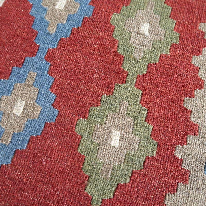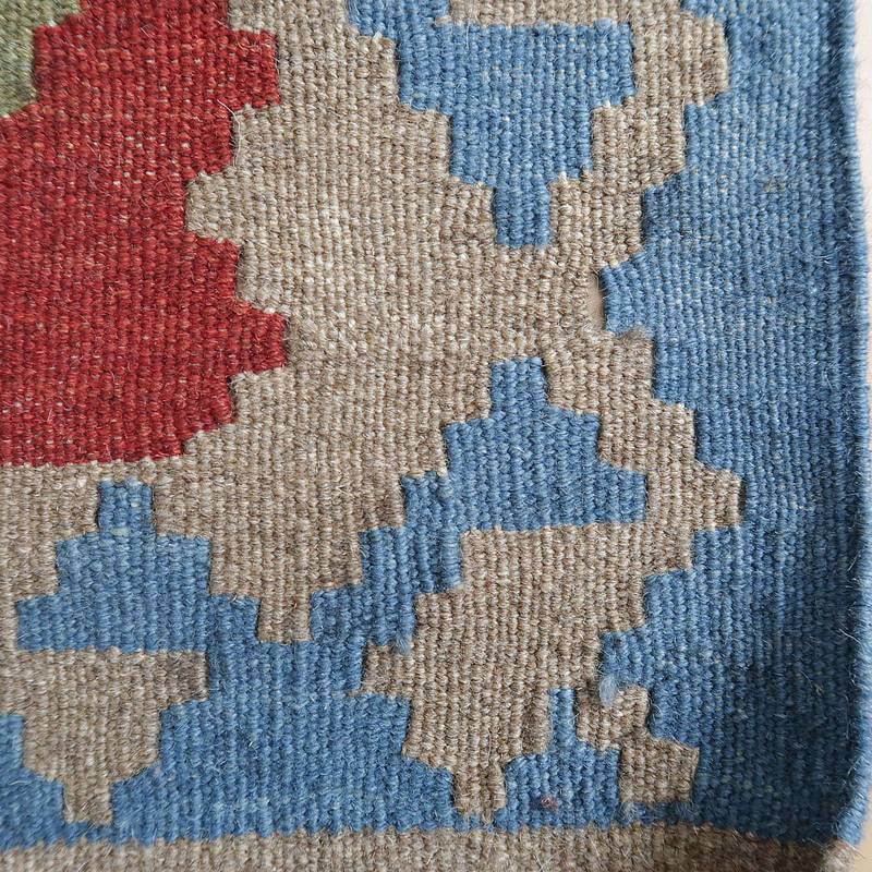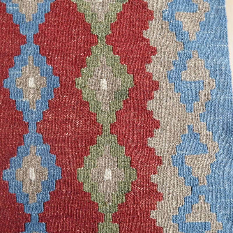 イラン南部シラーズ地方のキリムです。いくつかの色を使用した幾何学柄やギザギザ文様はリズムのある明るい雰囲気。使用している色はどれも、くすみのある落ち着いた色なので、目立たずインテリアに馴染みます。カシュガイの女性が昔ながらに織り上げたキリムなので、よく締まった丈夫な織り目で、早く仕上げる為、ゆるく粗く織られる商用生産のキリムには無い、誠実さが伝わってくる一枚です。また、平織り(ひらおり)という裏表の無い織り方で両面使えます。カシュガイ・キリムは遊牧のテント生活用の為、丈夫に織られ、洗濯も簡単、価格以上の価値を感じて頂けるキリムです。