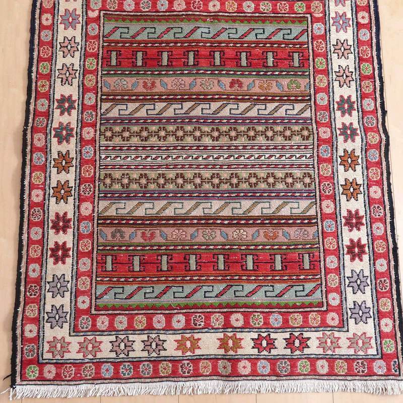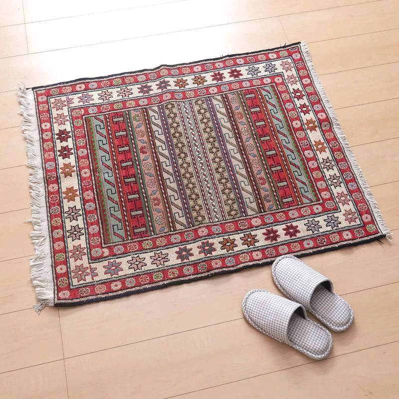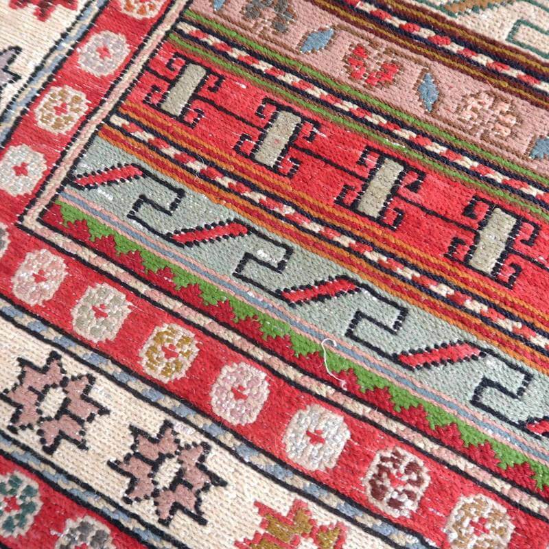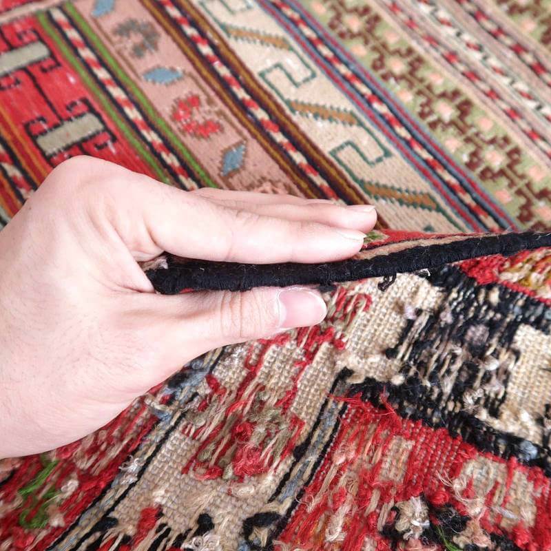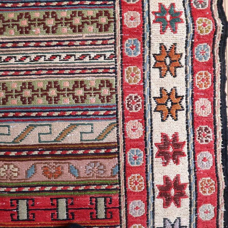刺繍のように細かな文様が全面に施された美しいスマック織りのキリム。赤を基調に様々な色で文様が入った多色使いですが柄が細かいので落ち着きもあります。一目一目の模様をじっくり眺めて味わえるキリムでたいへん上質感があります。スマック織りは裏面に模様の糸を渡してあるので片面使いのキリムになります。