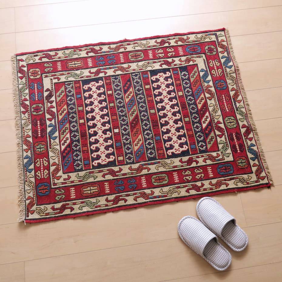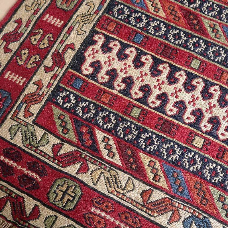 刺繍のように細かな文様が全面に施された美しいスマック織りのキリム。赤を基調に薄ベージュの部分は茶渋がかったような渋みがあって多色使いながら落ち着きもあります。一目一目の模様をじっくり眺めて味わえるキリムでたいへん上質感があります。スマック織りは裏面に模様の糸を渡してあるので片面使いのキリムになります。