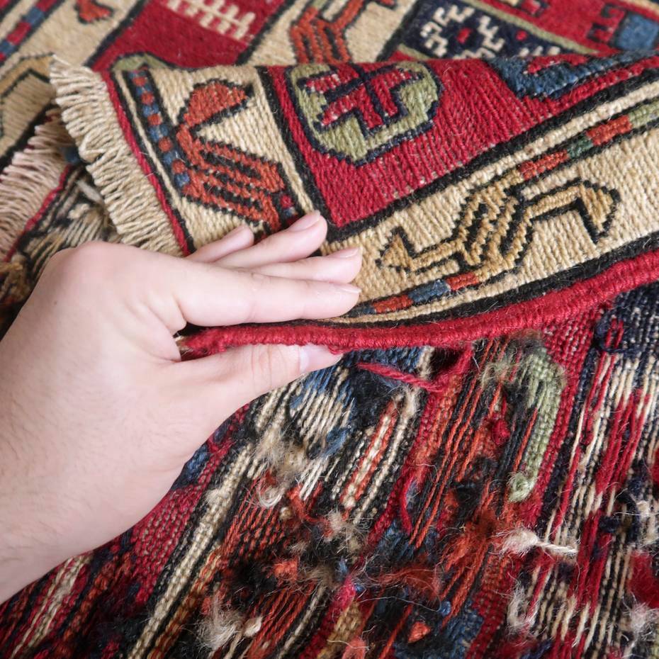 スマック織りとは、イランのキリムの織り方の技法です。生地は刺繍のような仕上がりですが、これは後から刺したものではなく、土台の縦糸と横糸の上にもう一本横糸を絡めるように巻き込んで織っていく高度なテクニックで、生地を二重に織るため通常の平織りのキリムより倍の手間ひまが掛かる分高価になりますが、非常に堅固で丈夫、また普通より細かなデザインを描けるという長所がありますので、価格以上の価値を感じて頂けるキリムです。