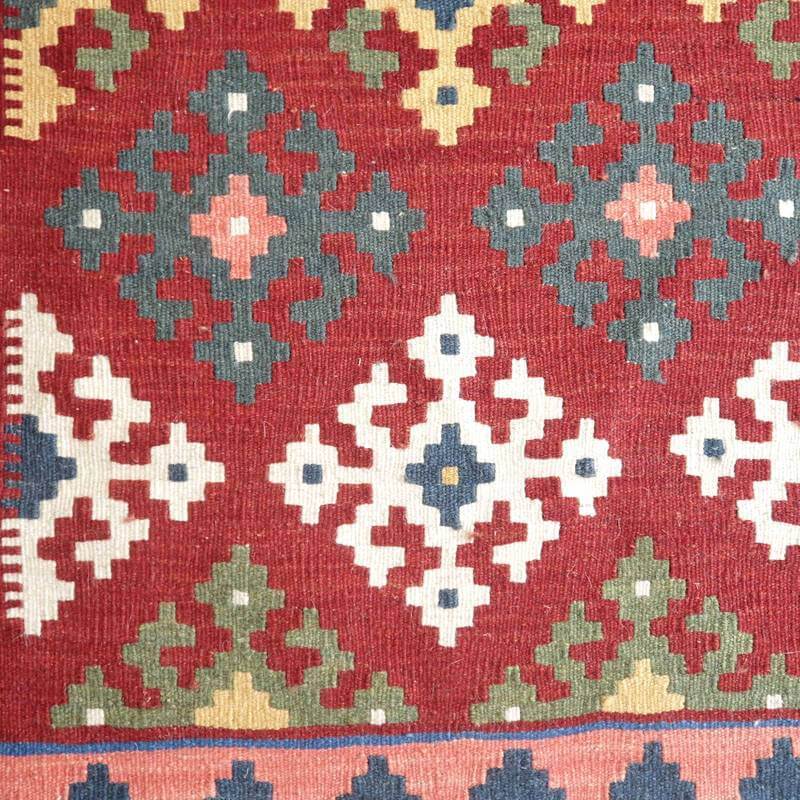 イラン南部シラーズ地方のキリムです。いくつかの色を使用した幾何学柄やギザギザ文様はリズムのある明るい雰囲気。使用している色はどれも、くすみのある落ち着いた色なので、目立たずインテリアに馴染みます。カシュガイの女性が昔ながらに織り上げたキリムなので、よく締まった丈夫な織り目で、早く仕上げる為、ゆるく粗く織られる商用生産のキリムには無い、誠実さが伝わってくる一枚です。また、平織り(ひらおり)という裏表の無い織り方で両面使えます。カシュガイ・キリムは遊牧のテント生活用の為、丈夫に織られ、洗濯も簡単、普段使いのラグとして扱いやすいキリムです。