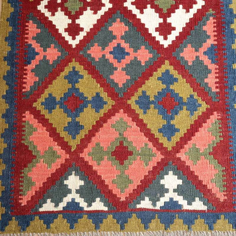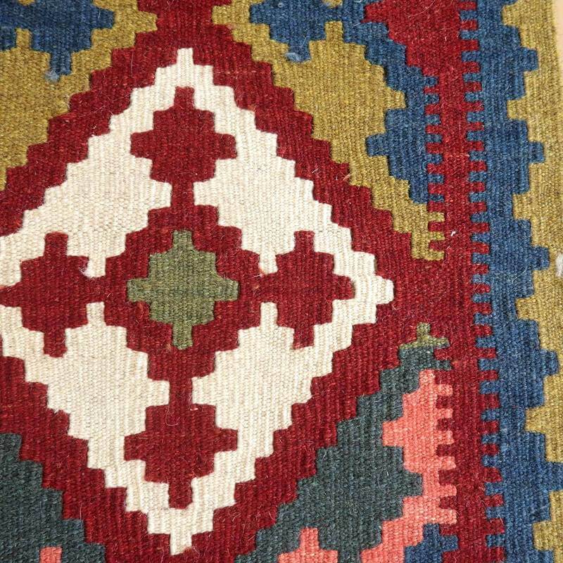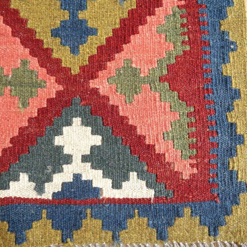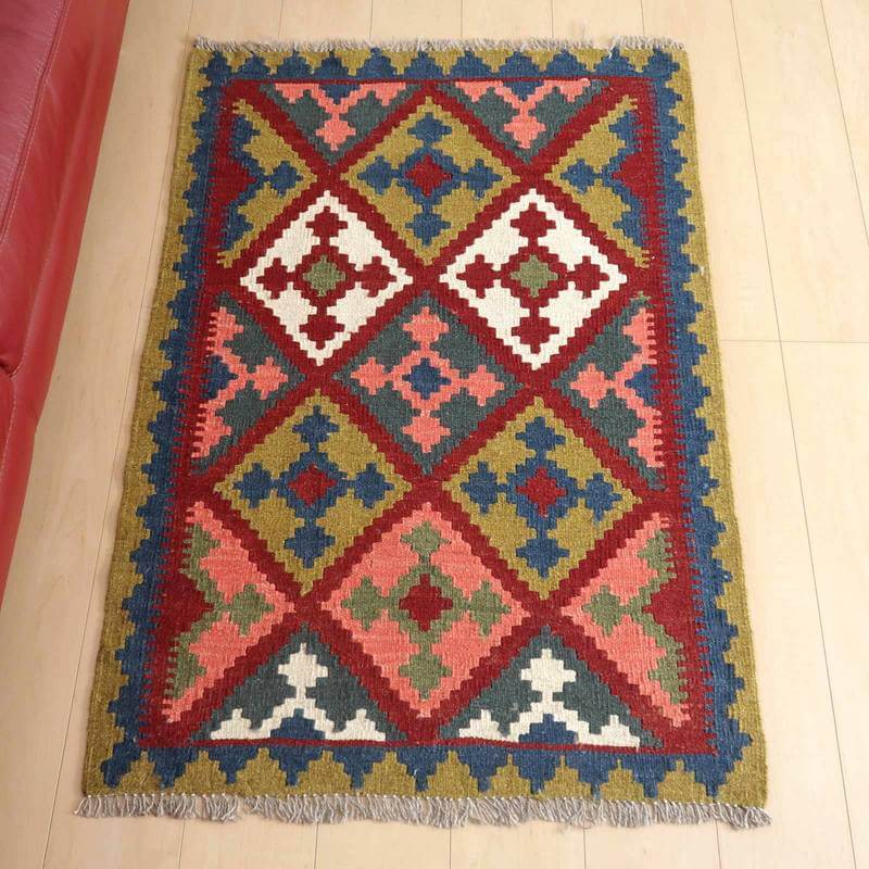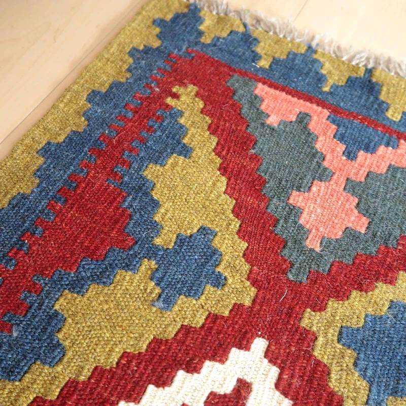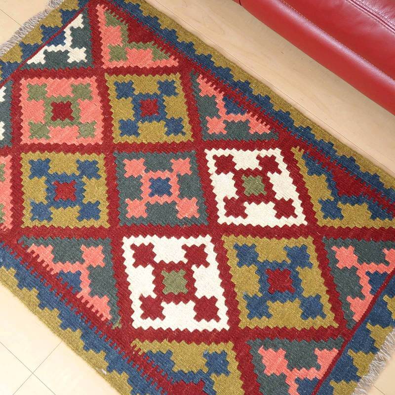 イラン南部シラーズ地方のキリムです。いくつかの色を使用した幾何学柄やギザギザ文様はリズムのある明るい雰囲気。使用している色はどれも、くすみのある落ち着いた色なので、目立たずインテリアに馴染みます。カシュガイの女性が昔ながらに織り上げたキリムなので、よく締まった丈夫な織り目で、早く仕上げる為、ゆるく粗く織られる商用生産のキリムには無い、誠実さが伝わってくる一枚です。また、平織り(ひらおり)という裏表の無い織り方で両面使えます。カシュガイ・キリムは遊牧のテント生活用の為、丈夫に織られ、洗濯も簡単、普段使いのラグとして扱いやすいキリムです。