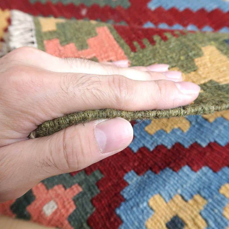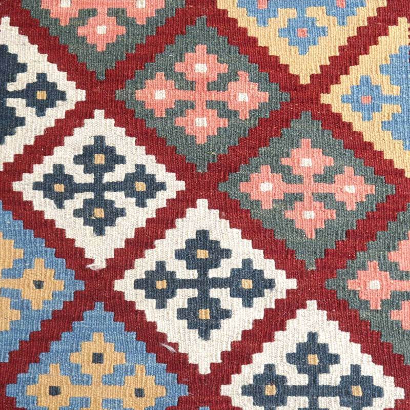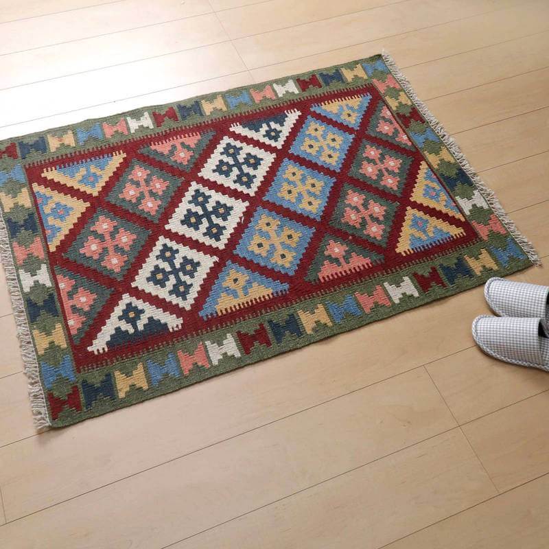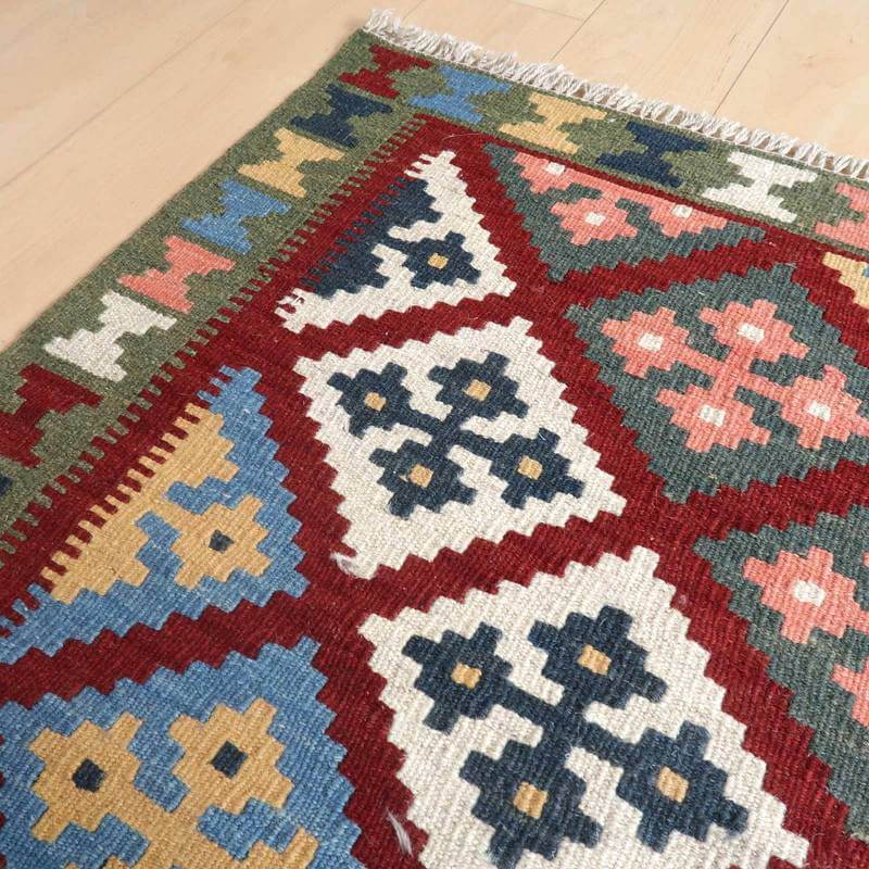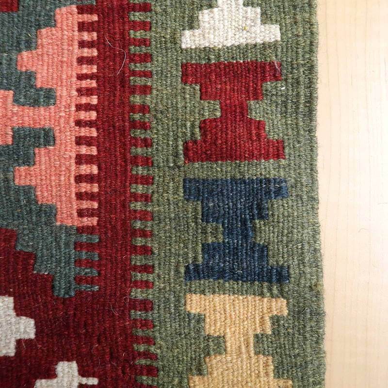 イラン南部シラーズ地方のキリムです。いくつかの色を使用した幾何学柄やギザギザ文様はリズムのある明るい雰囲気。使用している色はどれも、くすみのある落ち着いた色なので、目立たずインテリアに馴染みます。カシュガイの女性が昔ながらに織り上げたキリムなので、よく締まった丈夫な織り目で、早く仕上げる為、ゆるく粗く織られる商用生産のキリムには無い、誠実さが伝わってくる一枚です。また、平織り(ひらおり)という裏表の無い織り方で両面使えます。カシュガイ・キリムは遊牧のテント生活用の為、丈夫に織られ、洗濯も簡単、普段使いのラグとして扱いやすいキリムです。