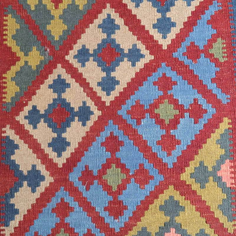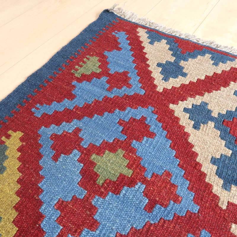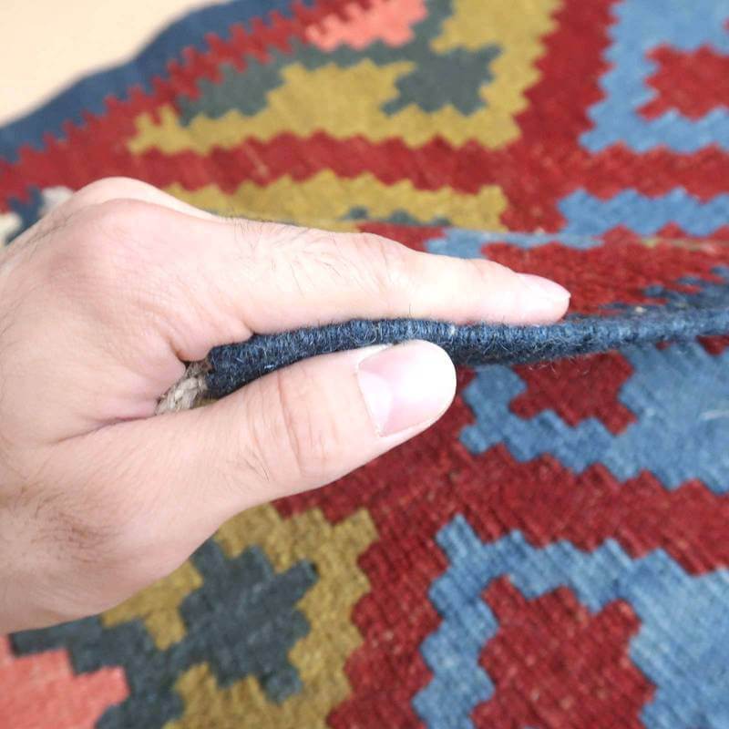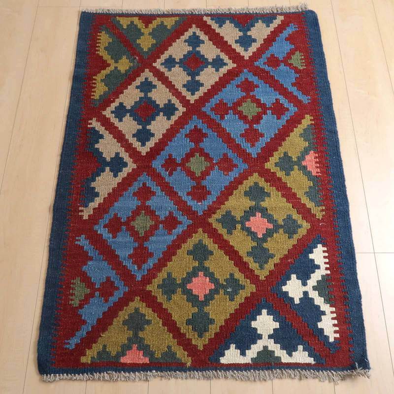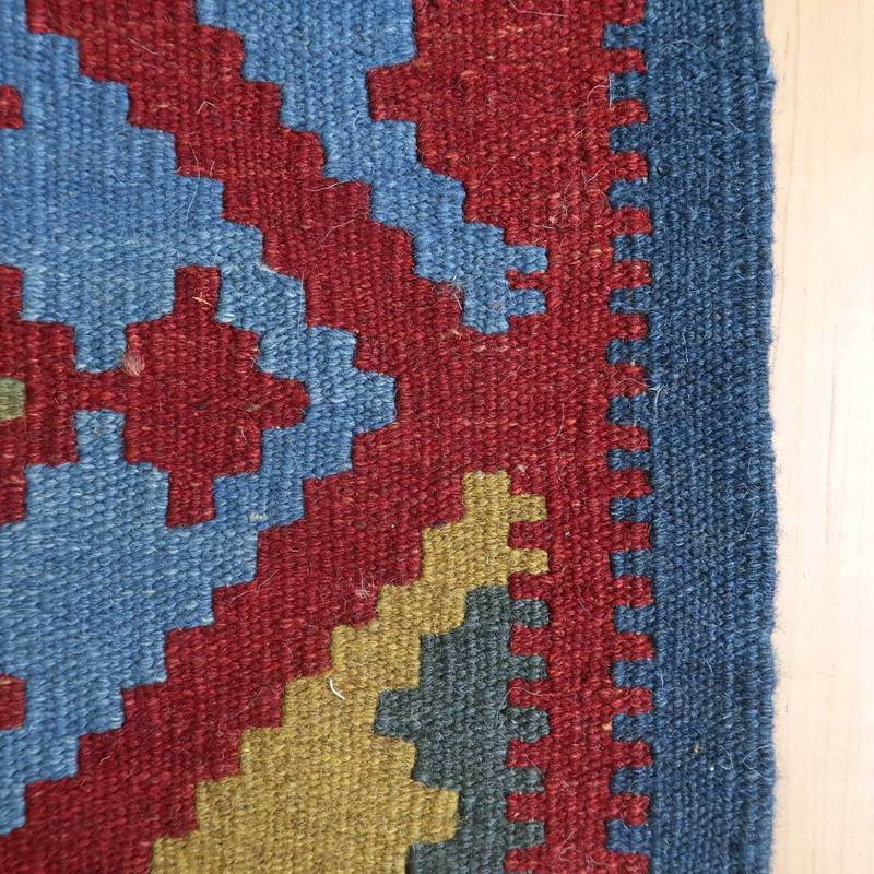 イラン南部シラーズ地方のキリムです。いくつかの色を使用した幾何学柄やギザギザ文様はリズムのある明るい雰囲気。使用している色はどれも、くすみのある落ち着いた色なので、目立たずインテリアに馴染みます。カシュガイの女性が昔ながらに織り上げたキリムなので、よく締まった丈夫な織り目で、早く仕上げる為、ゆるく粗く織られる商用生産のキリムには無い、誠実さが伝わってくる一枚です。また、平織り(ひらおり)という裏表の無い織り方で両面使えます。カシュガイ・キリムは遊牧のテント生活用の為、丈夫に織られ、洗濯も簡単、普段使いのラグとして扱いやすいキリムです。