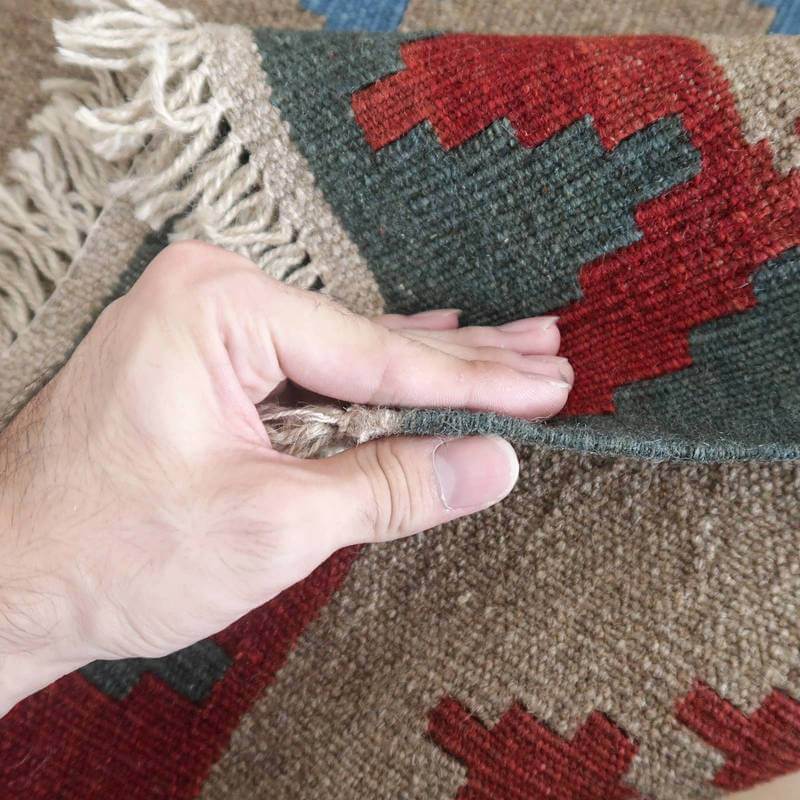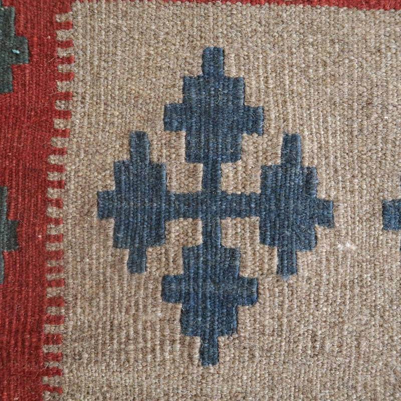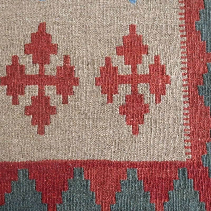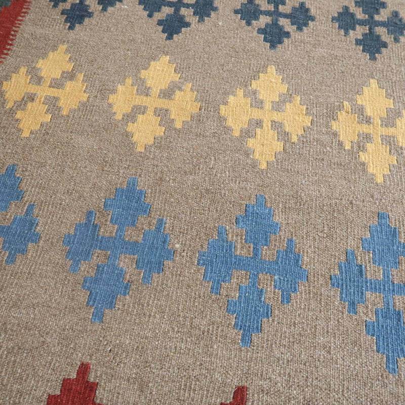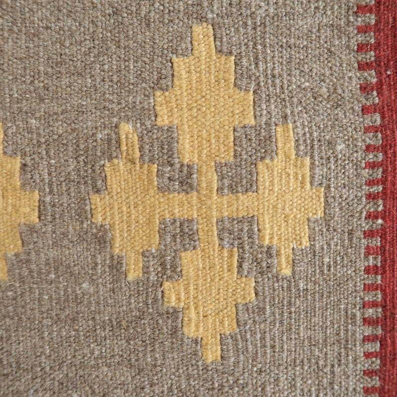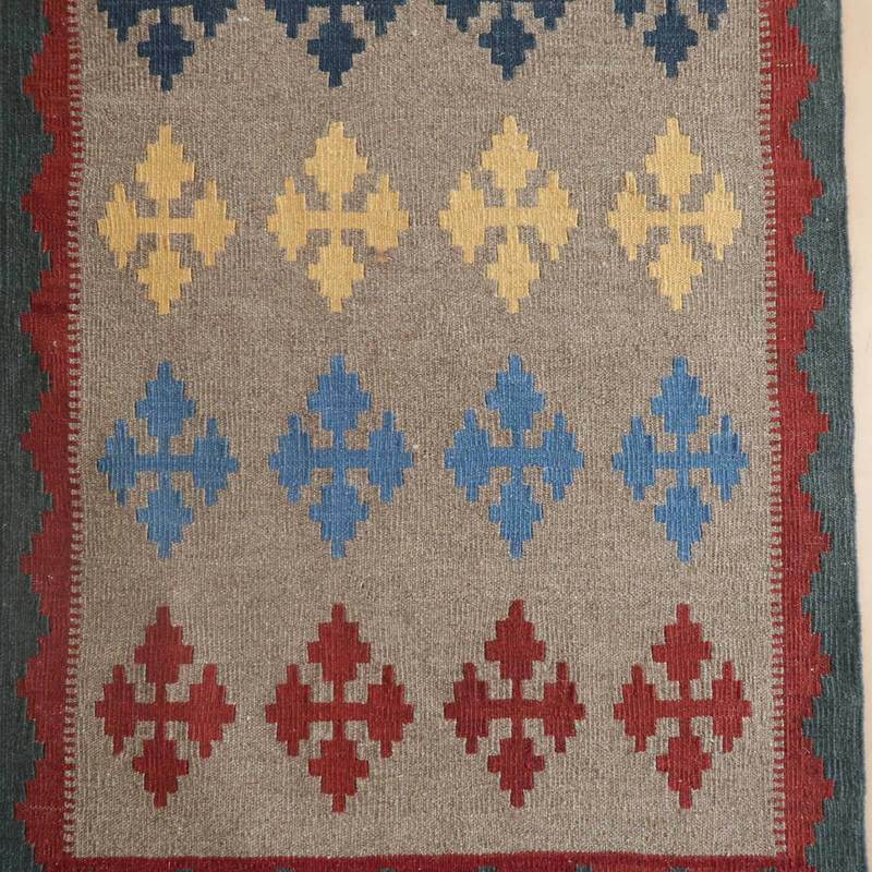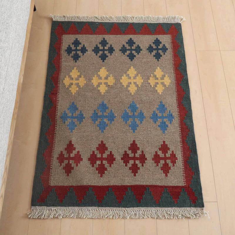 イラン南部シラーズ地方のキリムです。いくつかの色を使用した幾何学柄やギザギザ文様はリズムのある明るい雰囲気。使用している色はどれも、くすみのある落ち着いた色なので、目立たずインテリアに馴染みます。カシュガイの女性が昔ながらに織り上げたキリムなので、よく締まった丈夫な織り目で、早く仕上げる為、ゆるく粗く織られる商用生産のキリムには無い、誠実さが伝わってくる一枚です。また、平織り(ひらおり)という裏表の無い織り方で両面使えます。カシュガイ・キリムは遊牧のテント生活用の為、丈夫に織られ、洗濯も簡単、価格以上の価値を感じて頂けるキリムです。