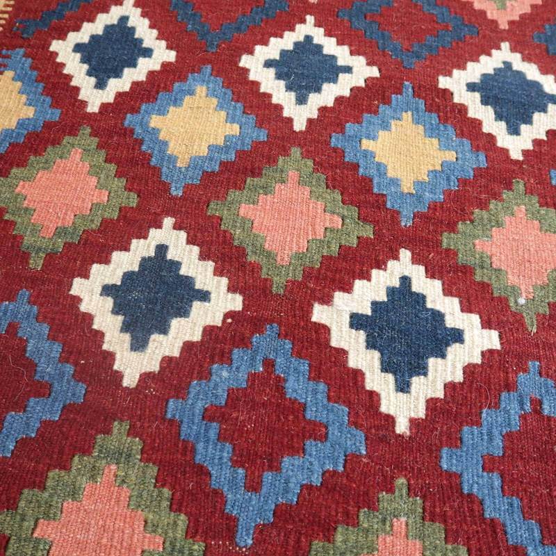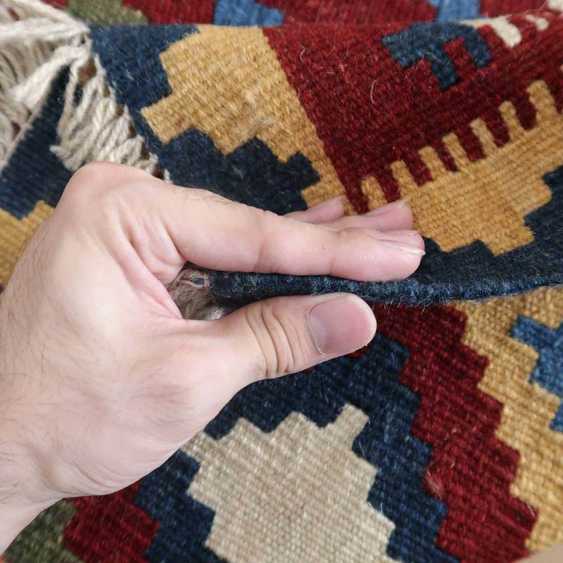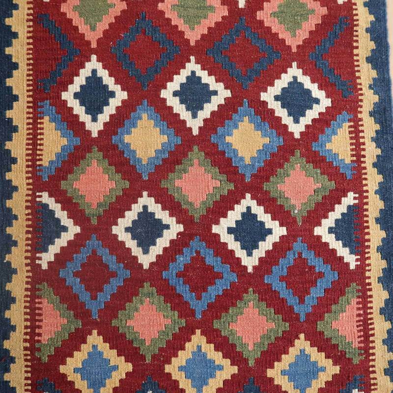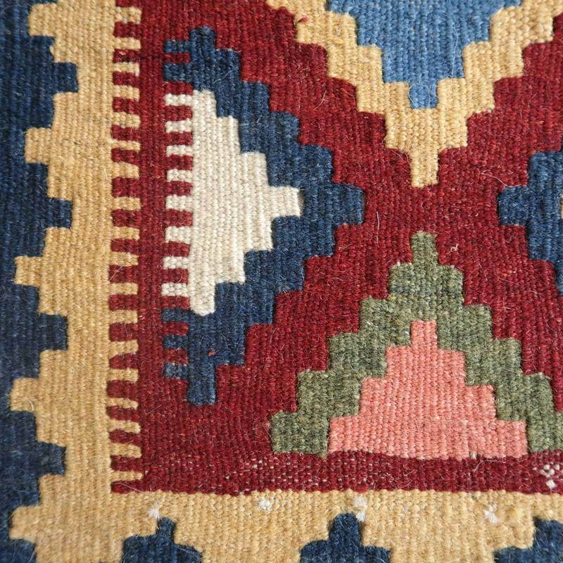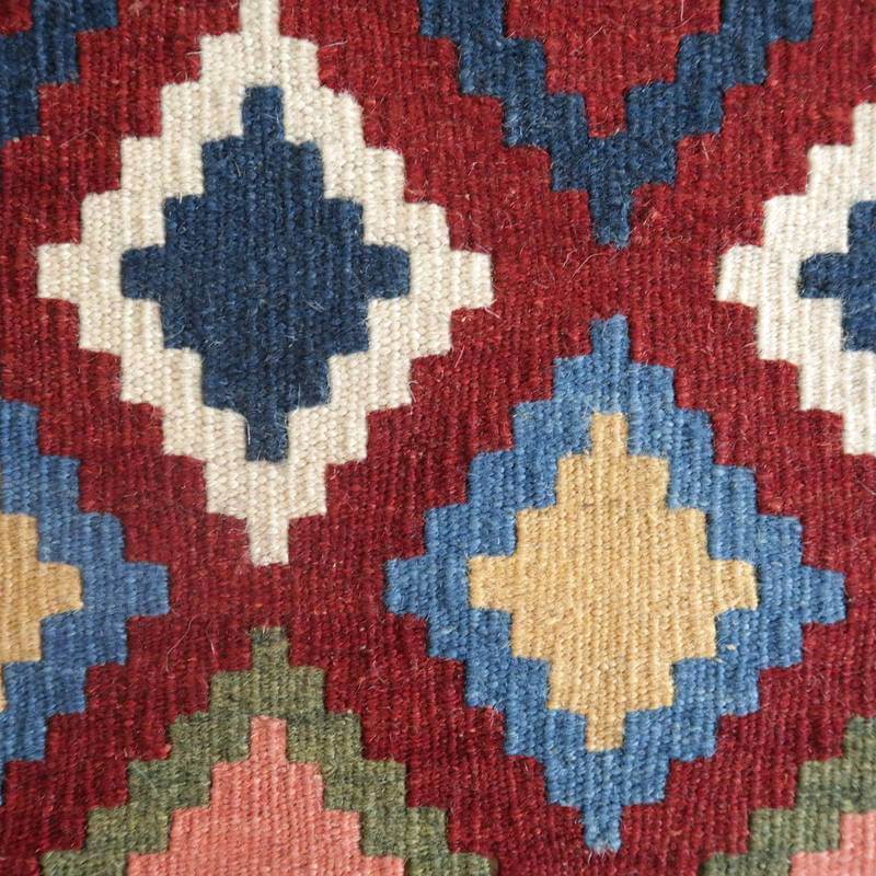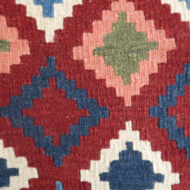 イラン南部シラーズ地方のキリムです。いくつかの色を使用した幾何学柄やギザギザ文様はリズムのある明るい雰囲気。使用している色はどれも、くすみのある落ち着いた色なので、目立たずインテリアに馴染みます。カシュガイの女性が昔ながらに織り上げたキリムなので、よく締まった丈夫な織り目で、早く仕上げる為、ゆるく粗く織られる商用生産のキリムには無い、誠実さが伝わってくる一枚です。また、平織り(ひらおり)という裏表の無い織り方で両面使えます。カシュガイ・キリムは遊牧のテント生活用の為、丈夫に織られ、洗濯も簡単、価格以上の価値を感じて頂けるキリムです。