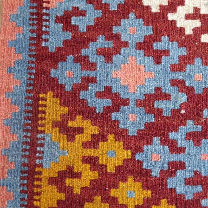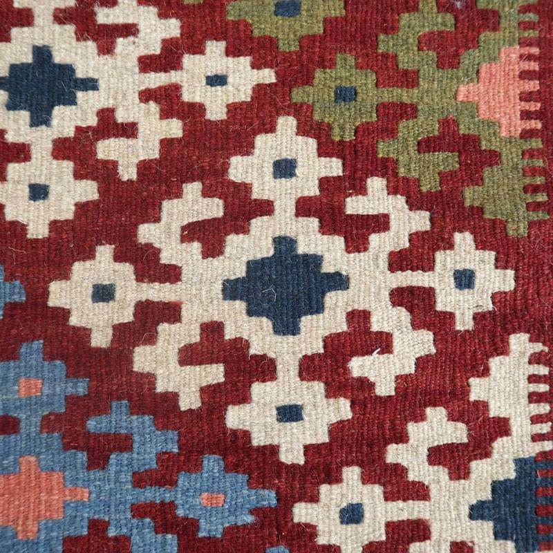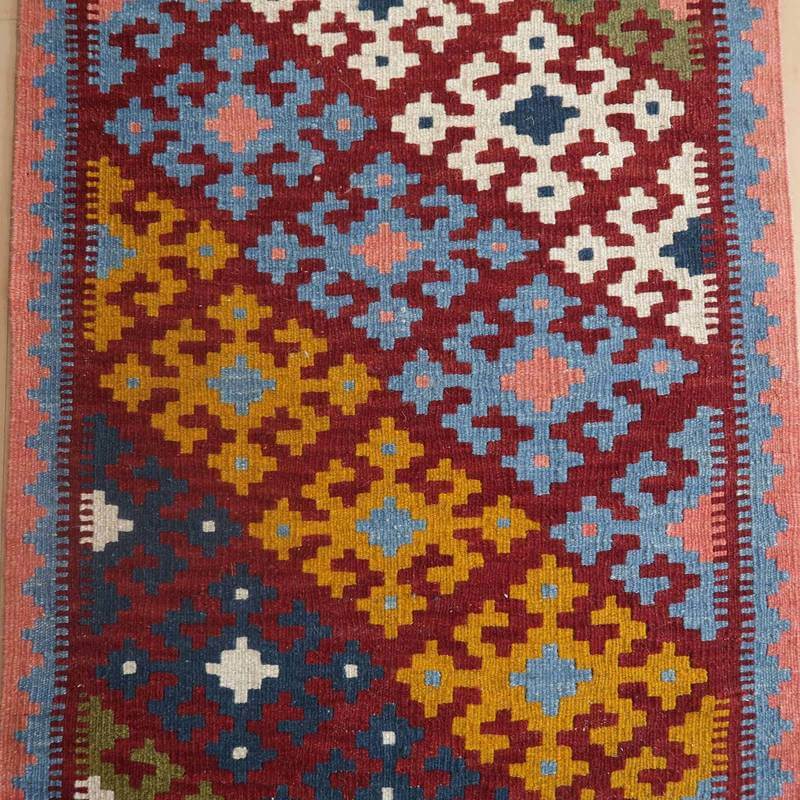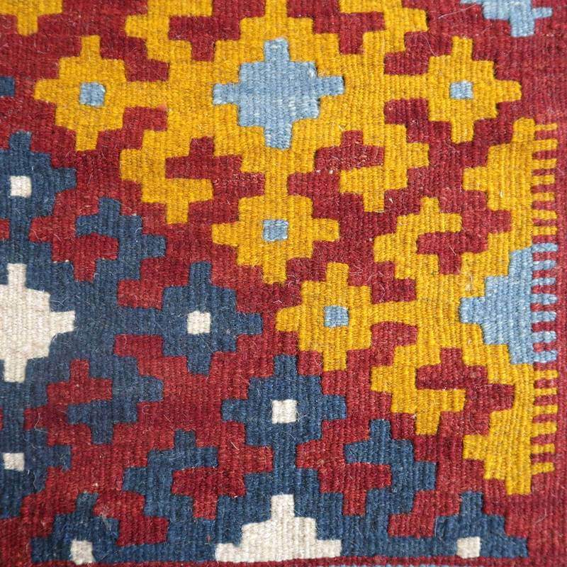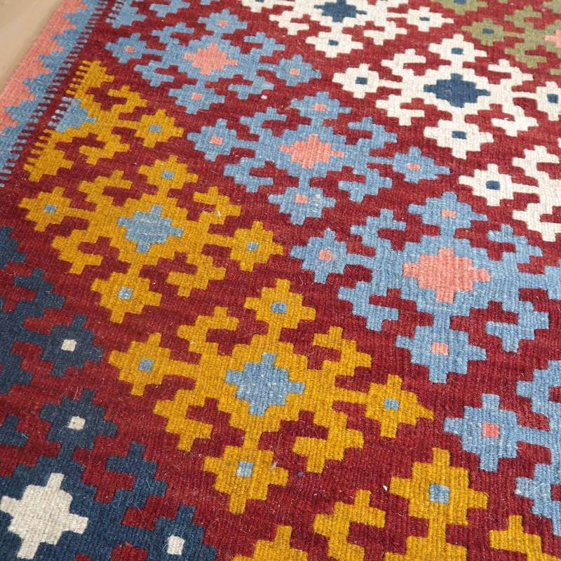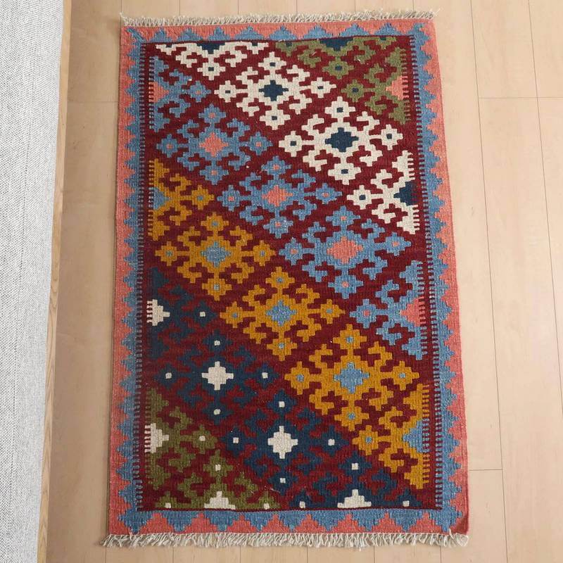 イラン南部シラーズ地方のキリムです。いくつかの色を使用した幾何学柄やギザギザ文様はリズムのある明るい雰囲気。使用している色はどれも、くすみのある落ち着いた色なので、目立たずインテリアに馴染みます。カシュガイの女性が昔ながらに織り上げたキリムなので、よく締まった丈夫な織り目で、早く仕上げる為、ゆるく粗く織られる商用生産のキリムには無い、誠実さが伝わってくる一枚です。また、平織り(ひらおり)という裏表の無い織り方で両面使えます。カシュガイ・キリムは遊牧のテント生活用の為、丈夫に織られ、洗濯も簡単、価格以上の価値を感じて頂けるキリムです。