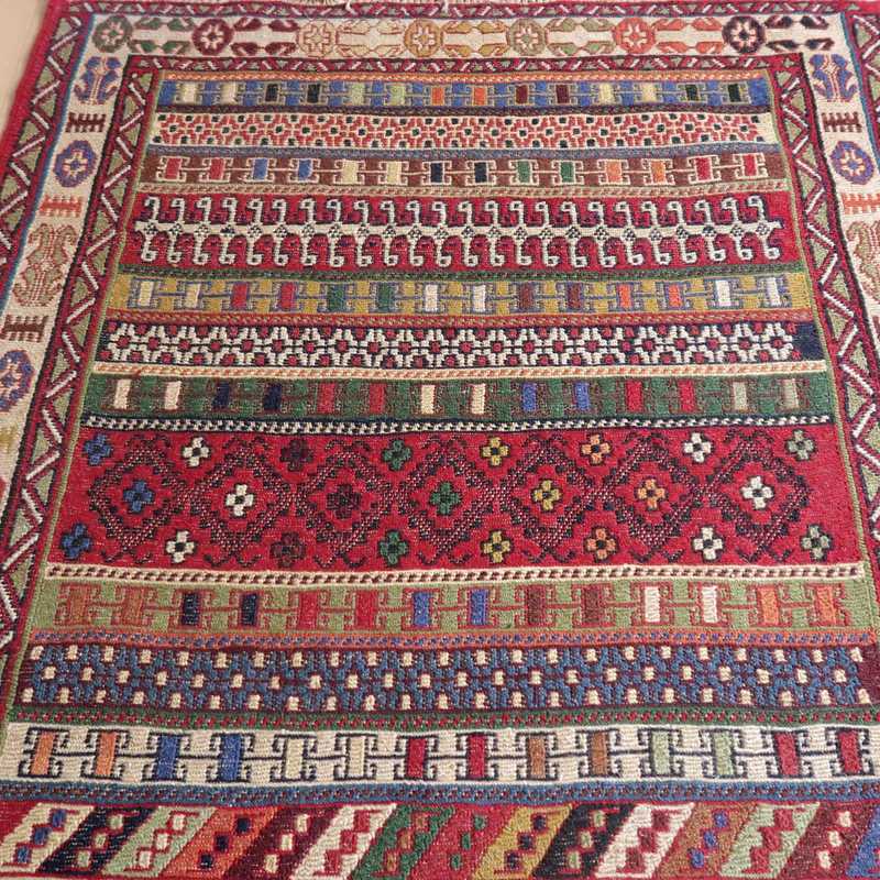刺繍のように細かな文様が全面に施された美しいスマック織りのキリム。赤を基調に薄ベージュの部分は茶渋がかったような渋みがあって多色使いながら落ち着きもあります。一目一目の模様をじっくり眺めて味わえるキリムでたいへん上質感があります。スマック織りは裏面に模様の糸を渡してあるので片面使いのキリムになります。右端で長さ105センチ、左端で長さ108センチと長さに少し差がございます。