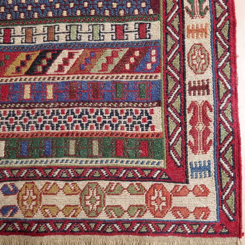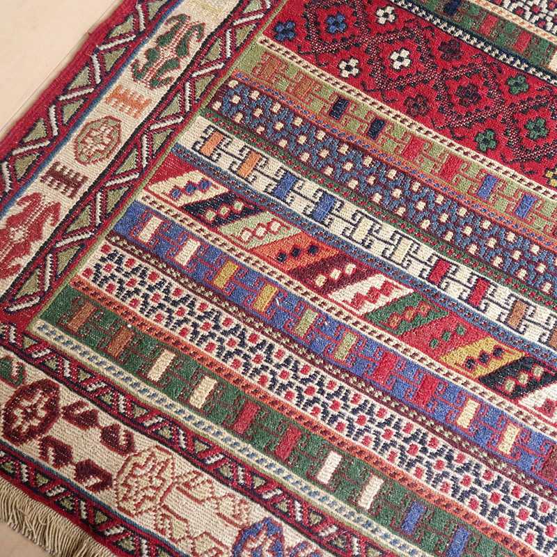 スマック織りとは、イランのキリムの織り方の技法です。生地は刺繍のような仕上がりですが、これは後から刺したものではなく、土台の縦糸と横糸の上にもう一本横糸を絡めるように巻き込んで織っていく高度なテクニックで、生地を二重に織るため通常の平織りのキリムより倍の手間ひまが掛かる分高価になりますが、非常に堅固で丈夫、また普通より細かなデザインを描けるという長所がありますので、価格以上の価値を感じて頂けるキリムです。
