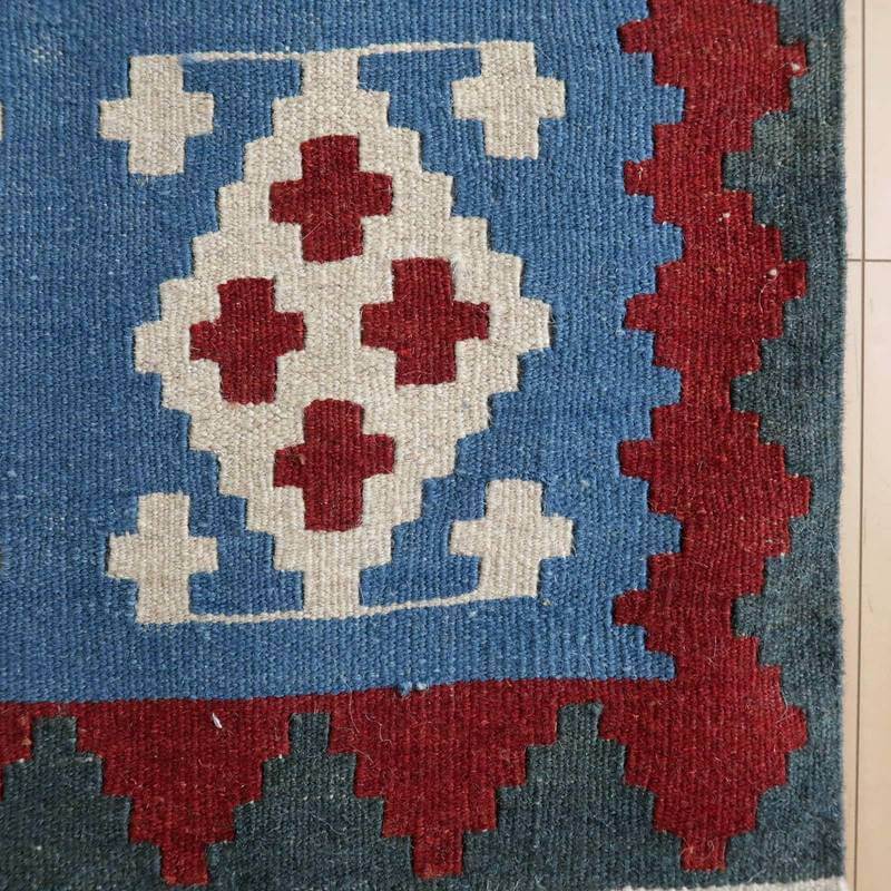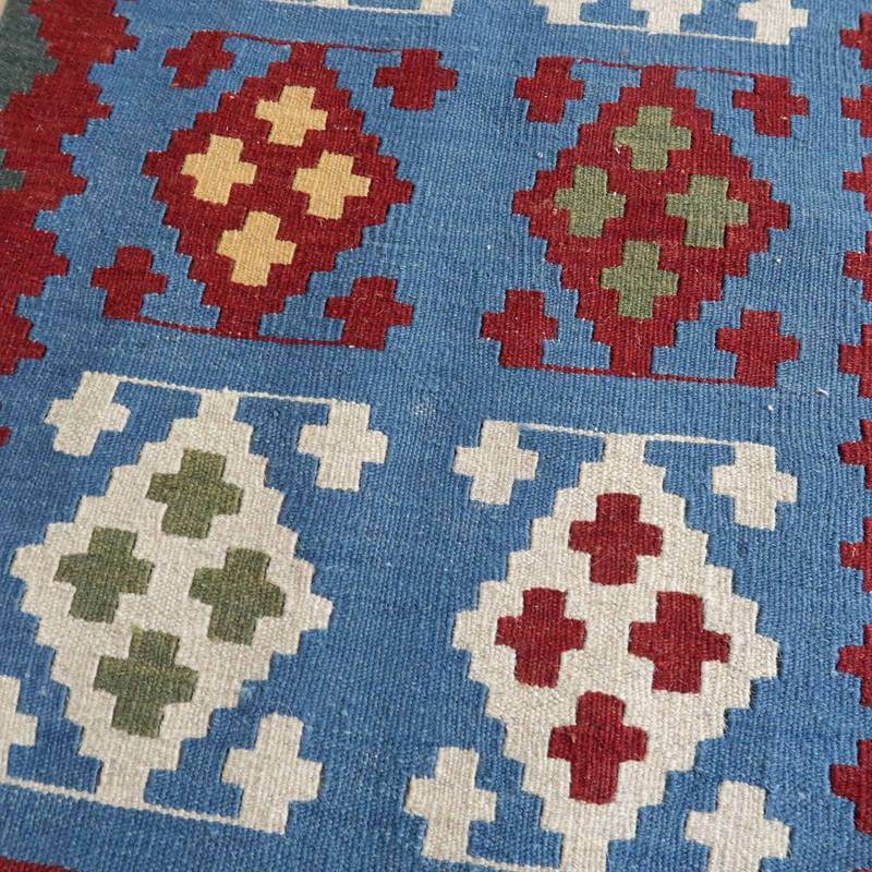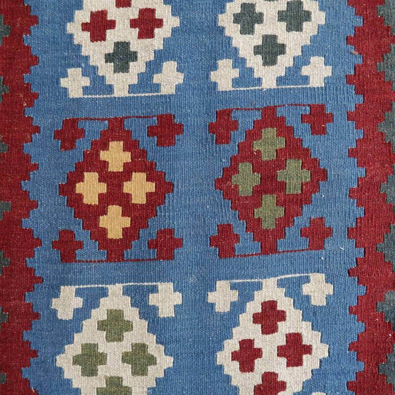 イラン南部シラーズ地方のキリムです。いくつかの色を使用した幾何学柄やギザギザ文様はリズムのある明るい雰囲気。使用している色はどれも、くすみのある落ち着いた色なので、目立たずインテリアに馴染みます。カシュガイの女性が昔ながらに織り上げたキリムなので、よく締まった丈夫な織り目で、早く仕上げる為、ゆるく粗く織られる商用生産のキリムには無い、誠実さが伝わってくる一枚です。また、平織り(ひらおり)という裏表の無い織り方で両面使えます。カシュガイ・キリムは遊牧のテント生活用の為、丈夫に織られ、洗濯も簡単、普段使いのラグとして扱いやすいキリムです。