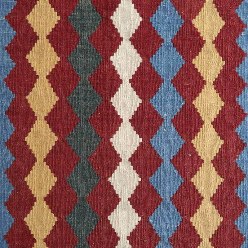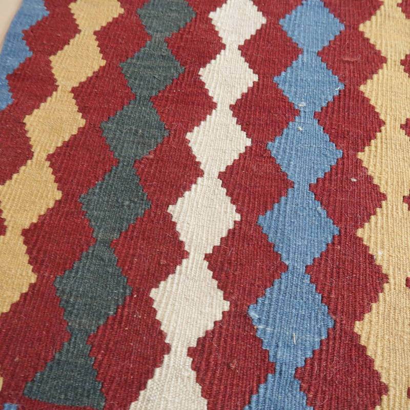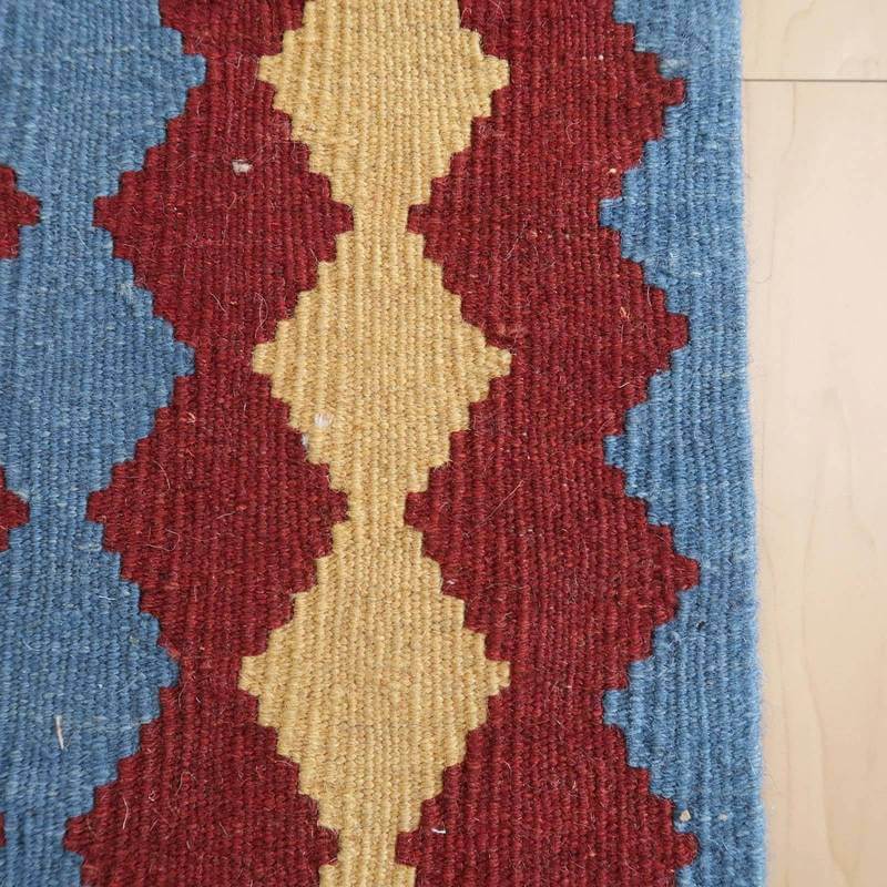 イラン南部シラーズ地方のキリムです。いくつかの色を使用した幾何学柄やギザギザ文様はリズムのある明るい雰囲気。使用している色はどれも、くすみのある落ち着いた色なので、目立たずインテリアに馴染みます。カシュガイの女性が昔ながらに織り上げたキリムなので、よく締まった丈夫な織り目で、早く仕上げる為、ゆるく粗く織られる商用生産のキリムには無い、誠実さが伝わってくる一枚です。また、平織り(ひらおり)という裏表の無い織り方で両面使えます。カシュガイ・キリムは遊牧のテント生活用の為、丈夫に織られ、洗濯も簡単、普段使いのラグとして扱いやすいキリムです。