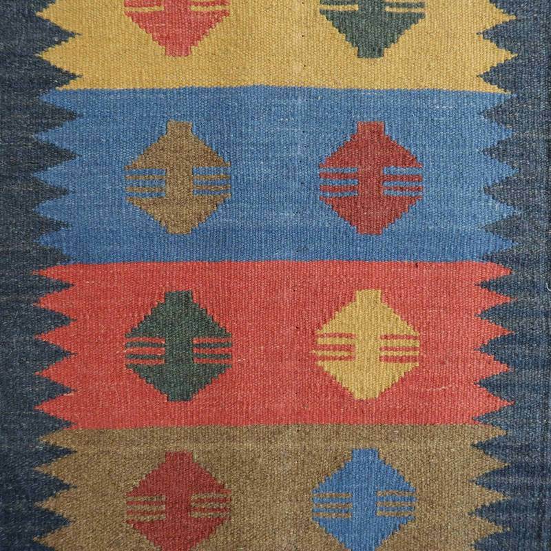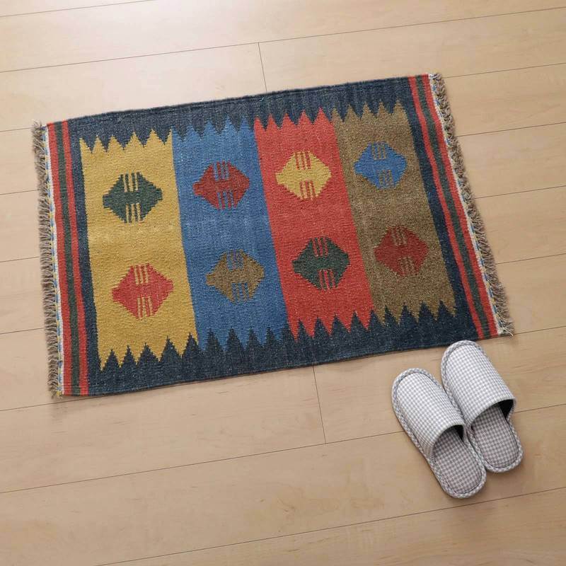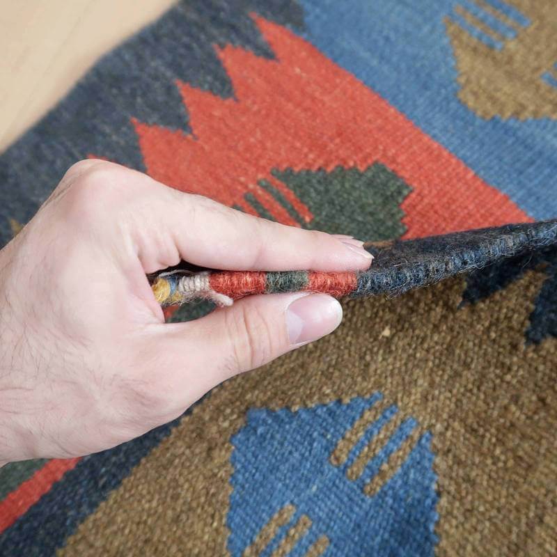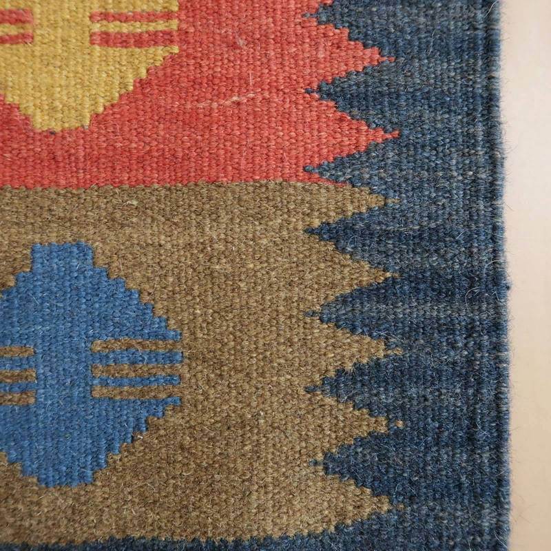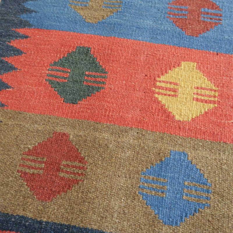 イラン南部シラーズ地方のキリムです。いくつかの色を使用した幾何学柄やギザギザ文様はリズムのある明るい雰囲気。使用している色はどれも、くすみのある落ち着いた色なので、目立たずインテリアに馴染みます。カシュガイの女性が昔ながらに織り上げたキリムなので、よく締まった丈夫な織り目で、早く仕上げる為、ゆるく粗く織られる商用生産のキリムには無い、誠実さが伝わってくる一枚です。また、平織り(ひらおり)という裏表の無い織り方で両面使えます。カシュガイ・キリムは遊牧のテント生活用の為、丈夫に織られ、洗濯も簡単、普段使いのラグとして扱いやすいキリムです。
