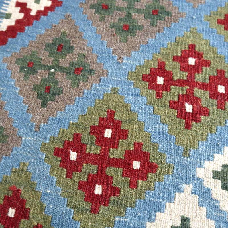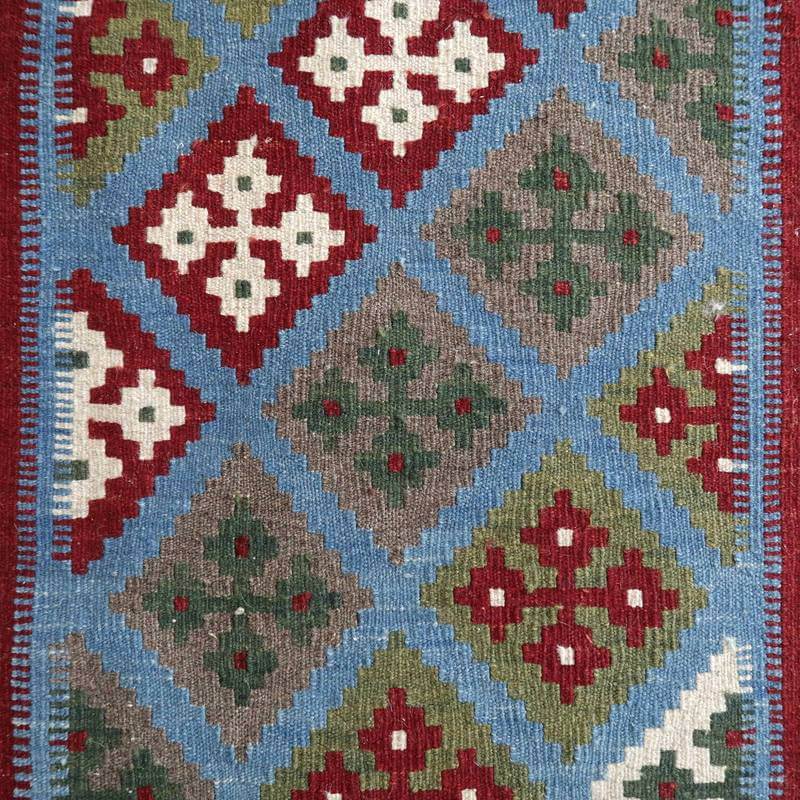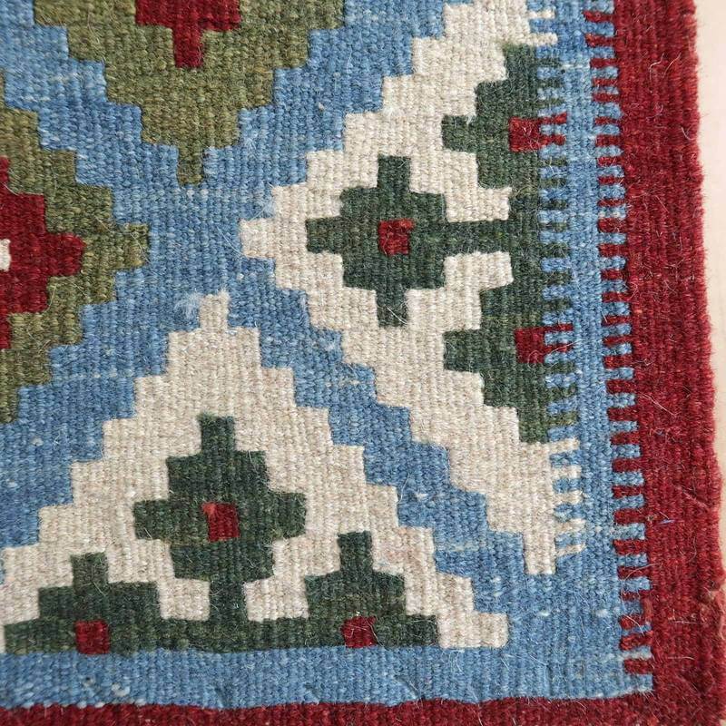 イラン南部シラーズ地方のキリムです。いくつかの色を使用した幾何学柄やギザギザ文様はリズムのある明るい雰囲気。使用している色はどれも、くすみのある落ち着いた色なので、目立たずインテリアに馴染みます。カシュガイの女性が昔ながらに織り上げたキリムなので、よく締まった丈夫な織り目で、早く仕上げる為、ゆるく粗く織られる商用生産のキリムには無い、誠実さが伝わってくる一枚です。また、平織り(ひらおり)という裏表の無い織り方で両面使えます。カシュガイ・キリムは遊牧のテント生活用の為、丈夫に織られ、洗濯も簡単、普段使いのラグとして扱いやすいキリムです。