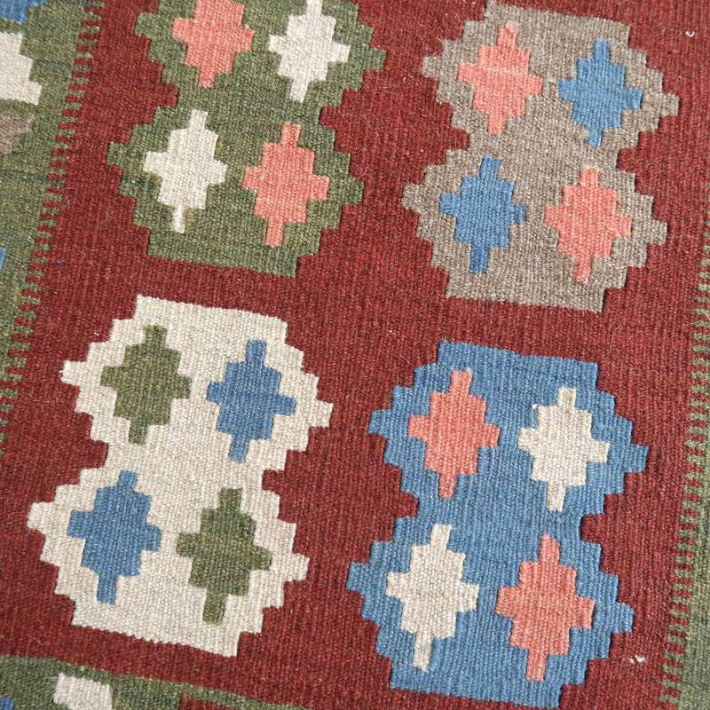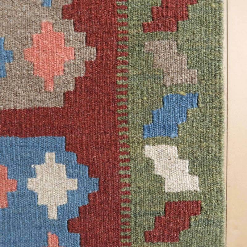 イラン南部シラーズ地方のキリムです。いくつかの色を使用した幾何学柄やギザギザ文様はリズムのある明るい雰囲気。使用している色はどれも、くすみのある落ち着いた色なので、目立たずインテリアに馴染みます。カシュガイの女性が昔ながらに織り上げたキリムなので、よく締まった丈夫な織り目で、早く仕上げる為、ゆるく粗く織られる商用生産のキリムには無い、誠実さが伝わってくる一枚です。また、平織り(ひらおり)という裏表の無い織り方で両面使えます。カシュガイ・キリムは遊牧のテント生活用の為、丈夫に織られ、洗濯も簡単、普段使いのラグとして扱いやすいキリムです。