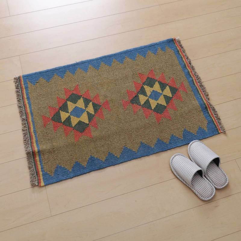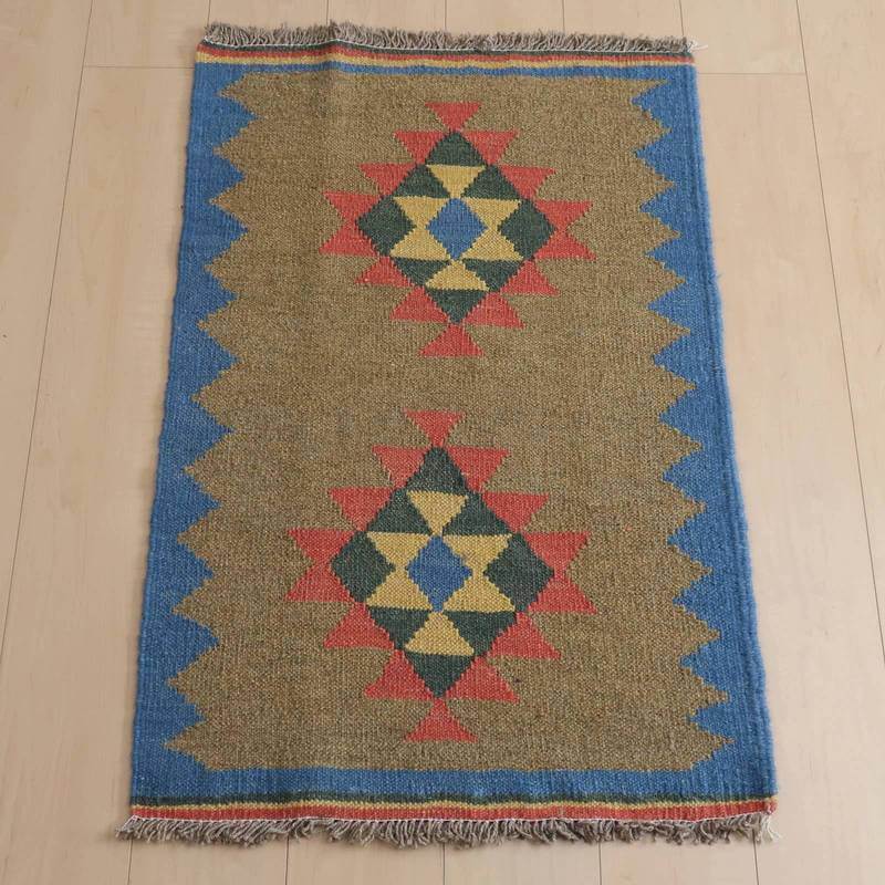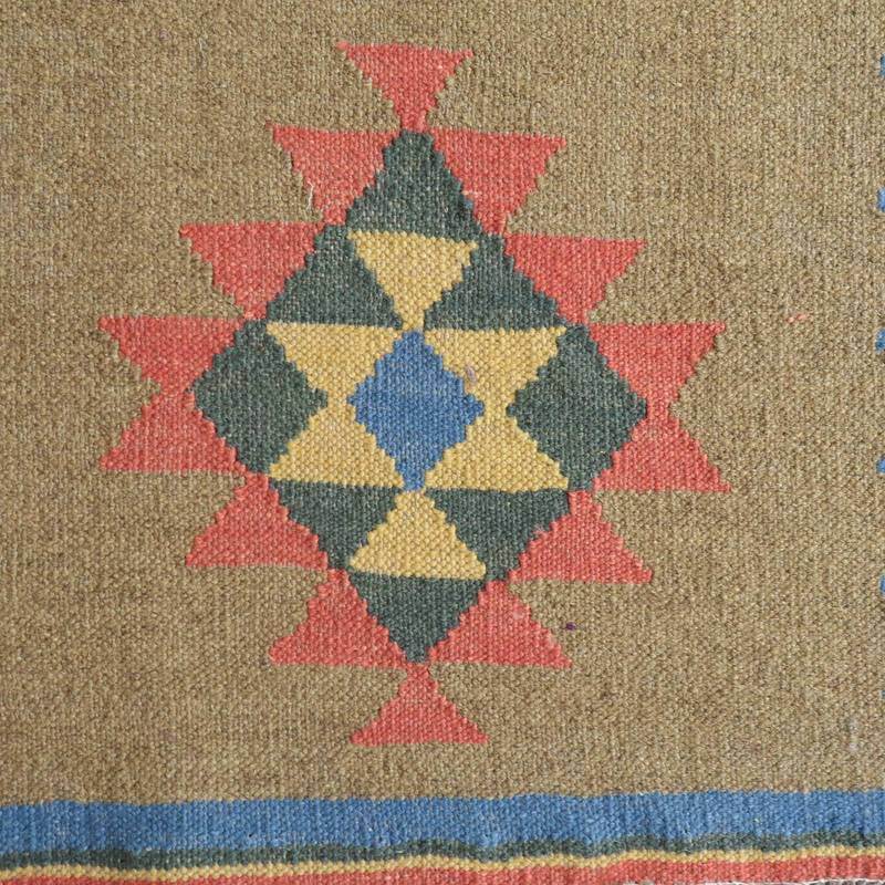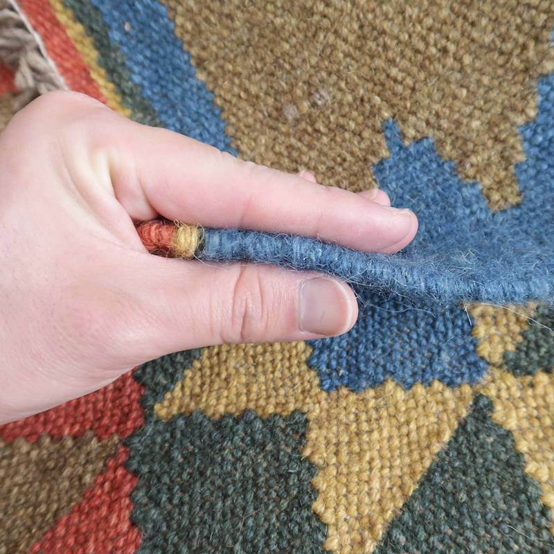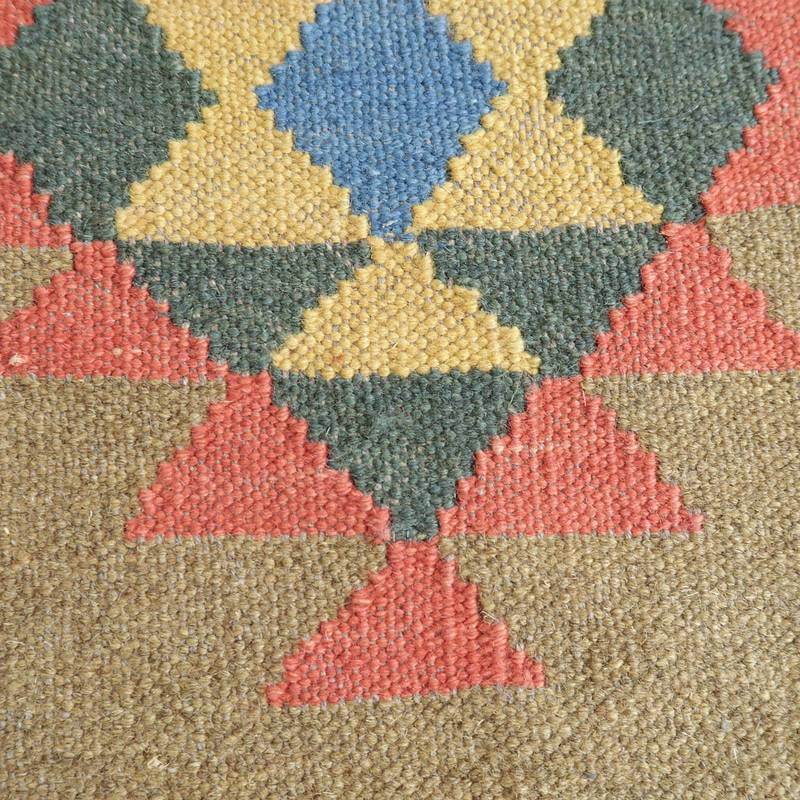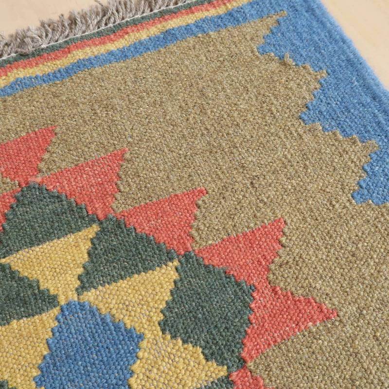 イラン南部シラーズ地方のキリムです。いくつかの色を使用した幾何学柄やギザギザ文様はリズムのある明るい雰囲気。使用している色はどれも、くすみのある落ち着いた色なので、目立たずインテリアに馴染みます。カシュガイの女性が昔ながらに織り上げたキリムなので、よく締まった丈夫な織り目で、早く仕上げる為、ゆるく粗く織られる商用生産のキリムには無い、誠実さが伝わってくる一枚です。また、平織り(ひらおり)という裏表の無い織り方で両面使えます。カシュガイ・キリムは遊牧のテント生活用の為、丈夫に織られ、洗濯も簡単、普段使いのラグとして扱いやすいキリムです。