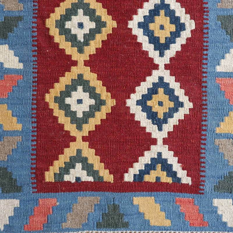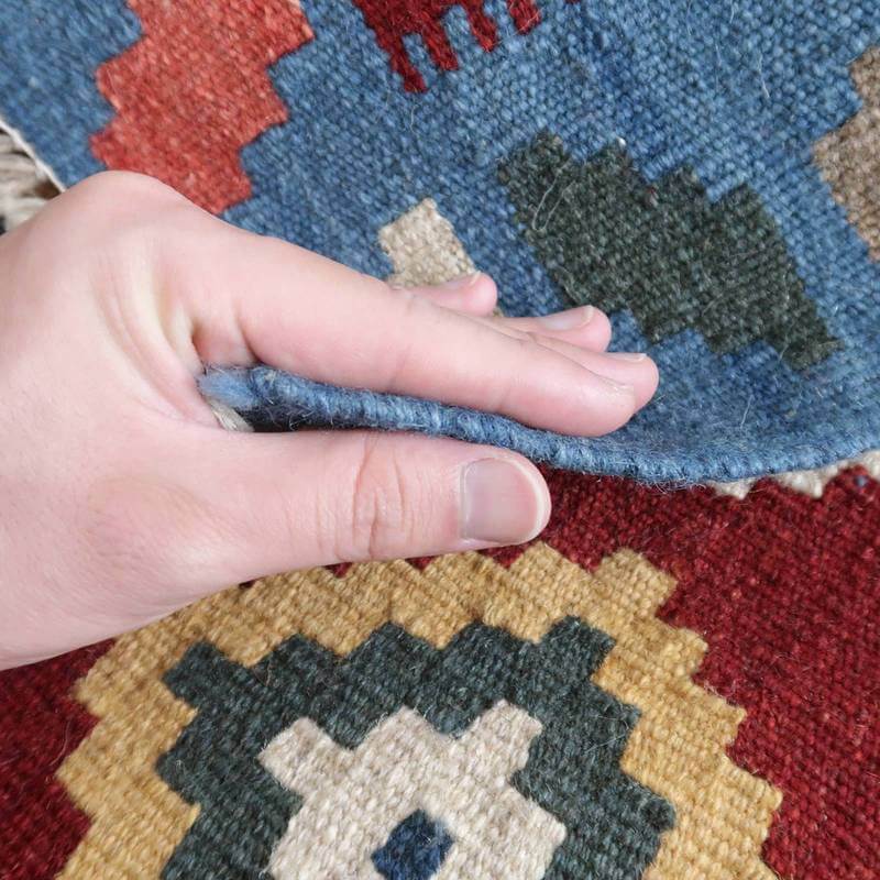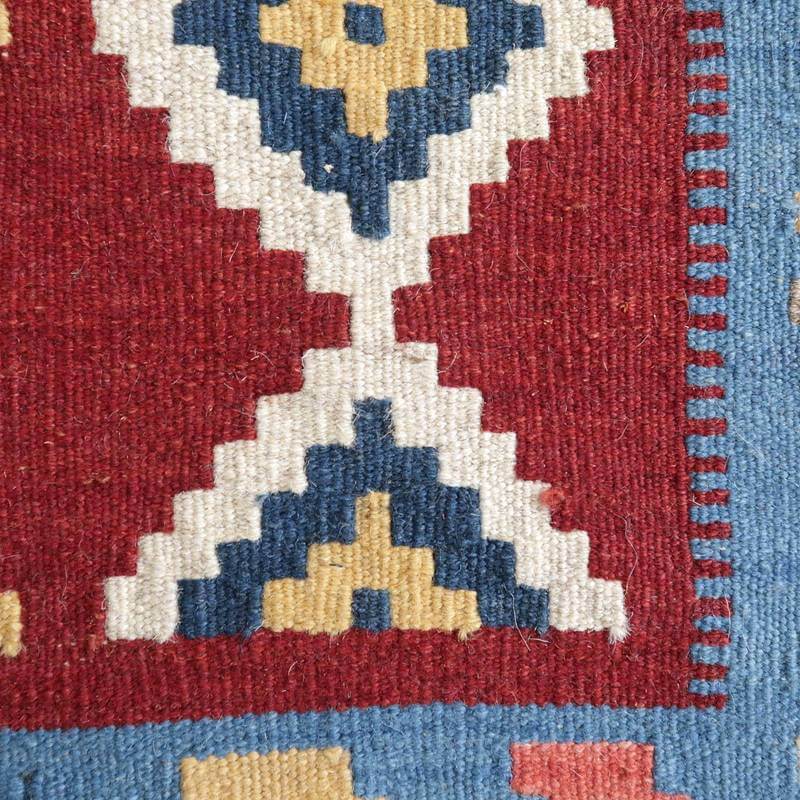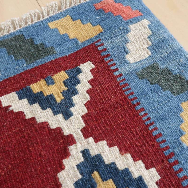 イラン南部シラーズ地方のキリムです。いくつかの色を使用した幾何学柄やギザギザ文様はリズムのある明るい雰囲気。使用している色はどれも、くすみのある落ち着いた色なので、目立たずインテリアに馴染みます。カシュガイの女性が昔ながらに織り上げたキリムなので、よく締まった丈夫な織り目で、早く仕上げる為、ゆるく粗く織られる商用生産のキリムには無い、誠実さが伝わってくる一枚です。また、平織り(ひらおり)という裏表の無い織り方で両面使えます。カシュガイ・キリムは遊牧のテント生活用の為、丈夫に織られ、洗濯も簡単、普段使いのラグとして扱いやすいキリムです。