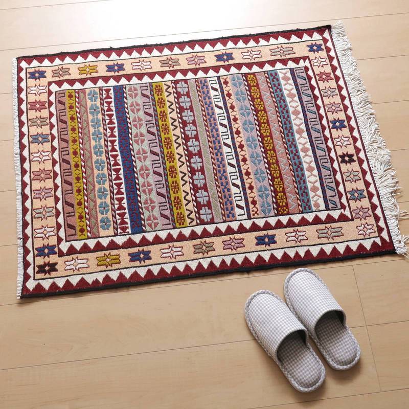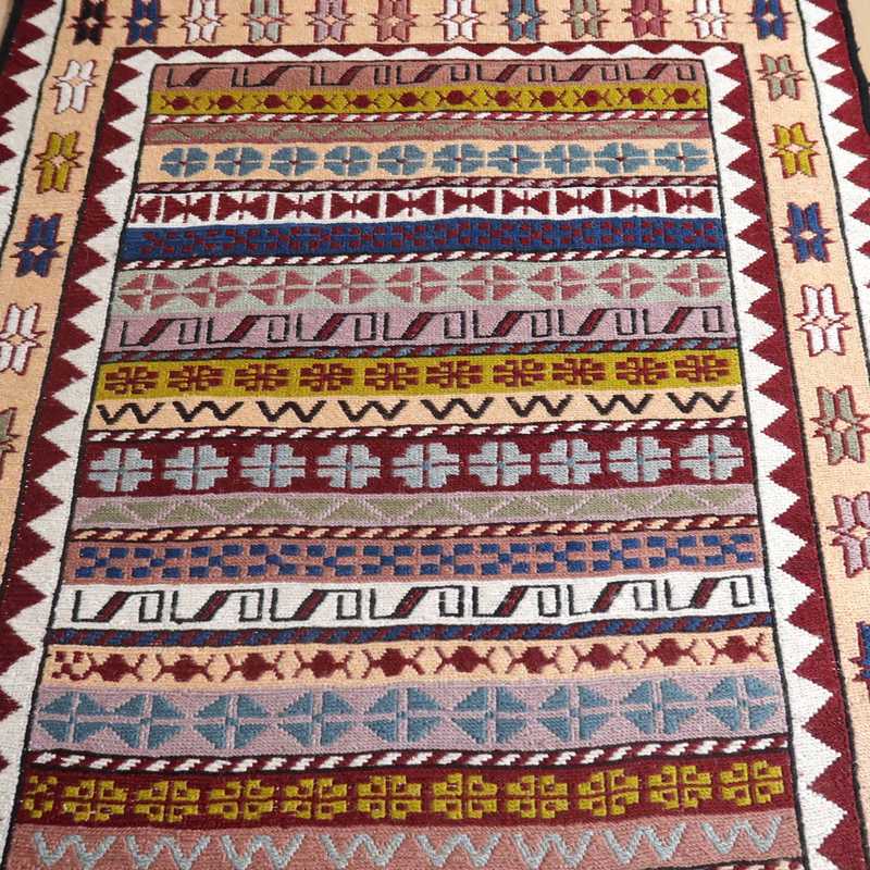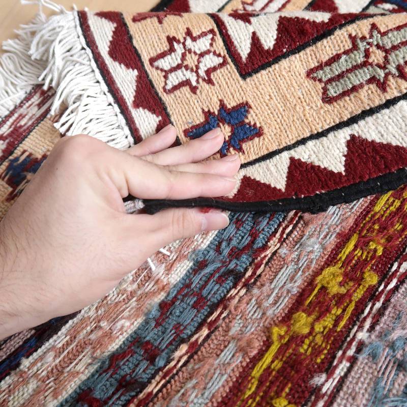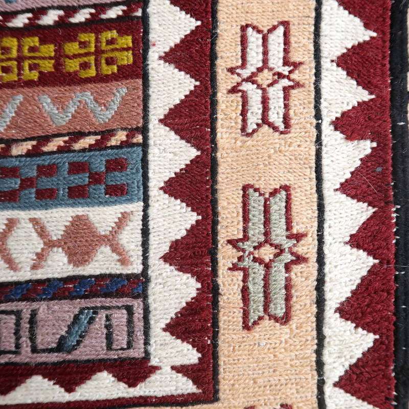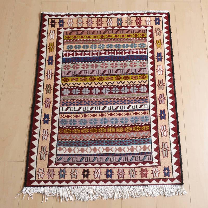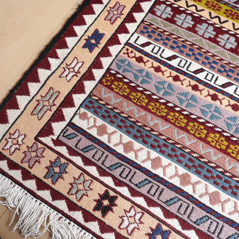 刺繍のように細かな文様が全面に施された美しいスマック織りのキリム。明るくはっきりした色合いです。一目一目の模様をじっくり眺めて味わえるキリムでたいへん上質感があります。スマック織りは裏面に模様の糸を渡してあるので片面使いのキリムになります。対角を引っ張ったようなひし形っぽ歪みがわずかに感じられます。