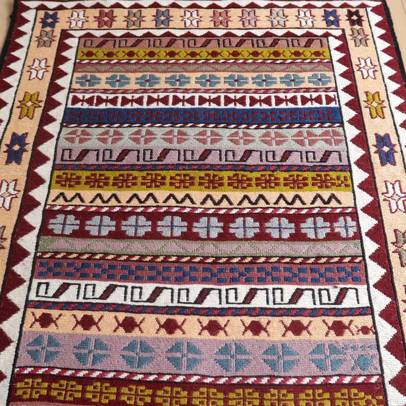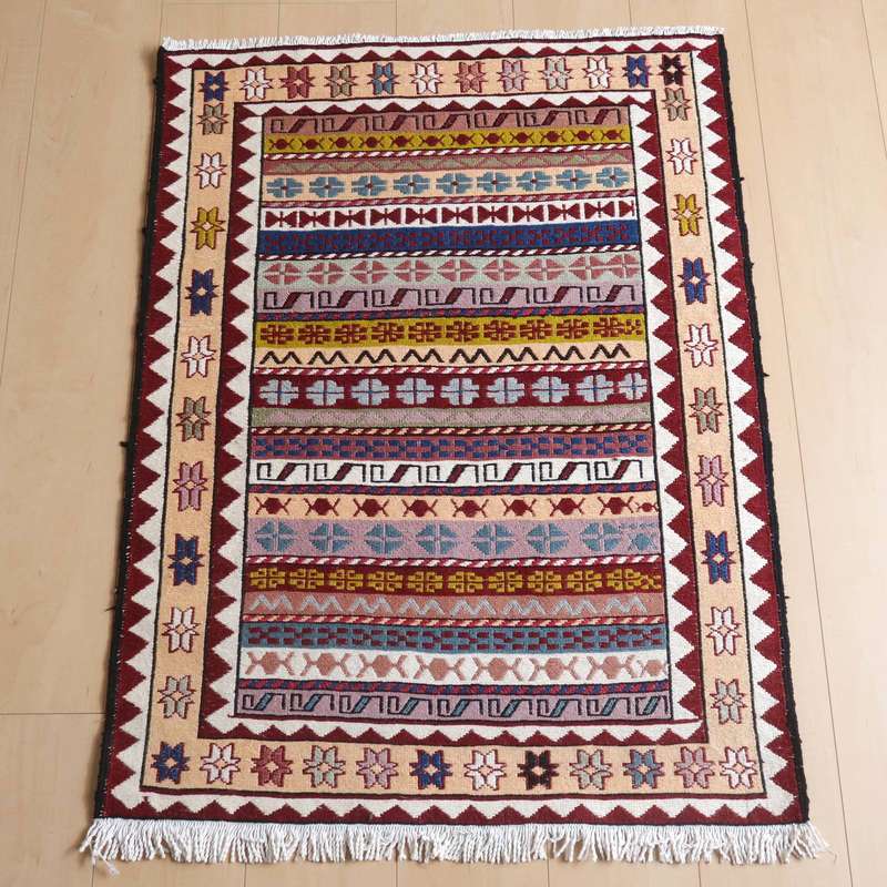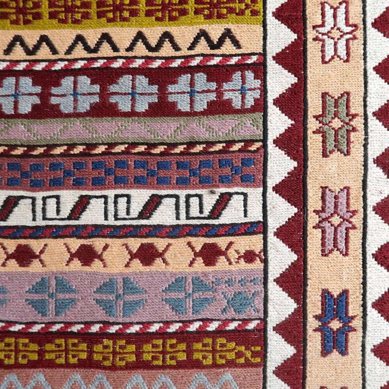 刺繍のように細かな文様が全面に施された美しいスマック織りのキリム。明るくはっきりした色合いです。一目一目の模様をじっくり眺めて味わえるキリムでたいへん上質感があります。スマック織りは裏面に模様の糸を渡してあるので片面使いのキリムになります。