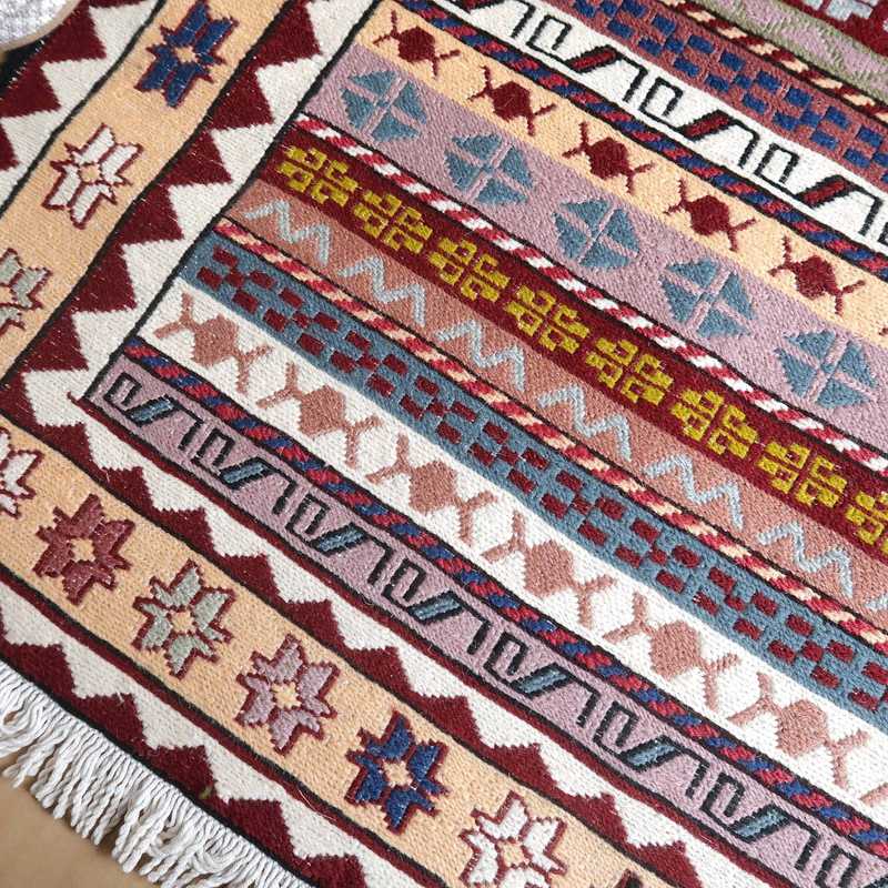 スマック織りとは、イランのキリムの織り方の技法です。生地は刺繍のような仕上がりですが、これは後から刺したものではなく、土台の縦糸と横糸の上にもう一本横糸を絡めるように巻き込んで織っていく高度なテクニックで、生地を二重に織るため通常の平織りのキリムより倍の手間ひまが掛かる分高価になりますが、非常に堅固で丈夫、また普通より細かなデザインを描けるという長所がありますので、価格以上の価値を感じて頂けるキリムです。