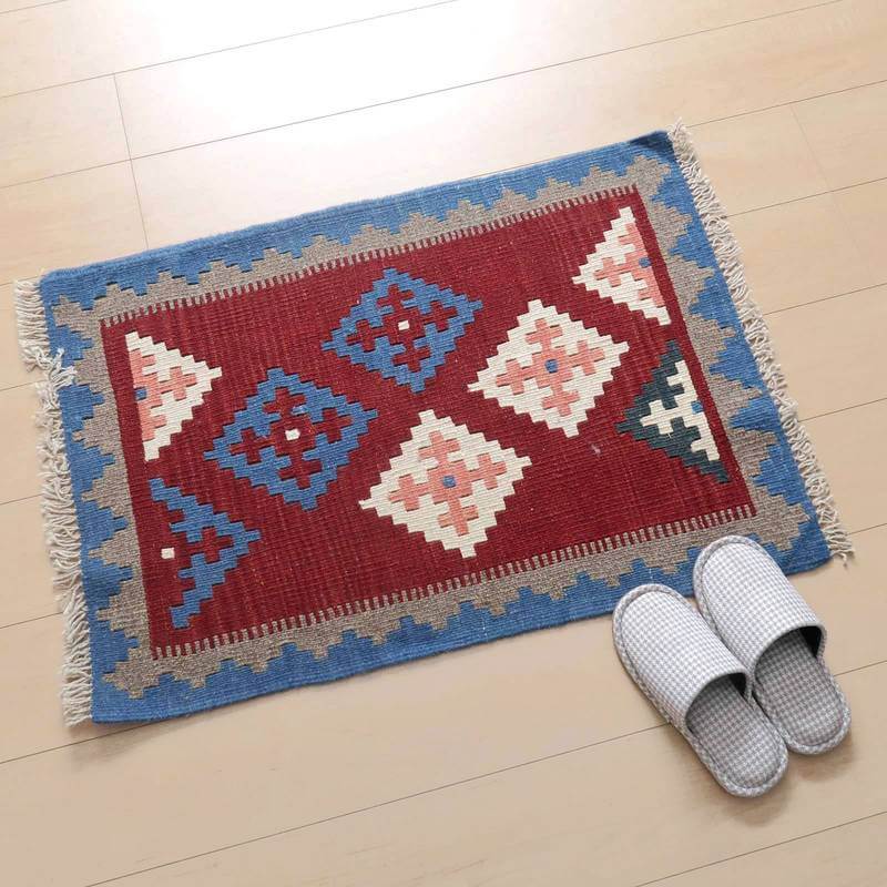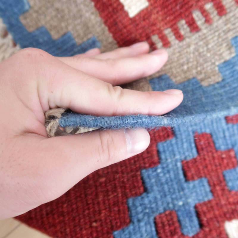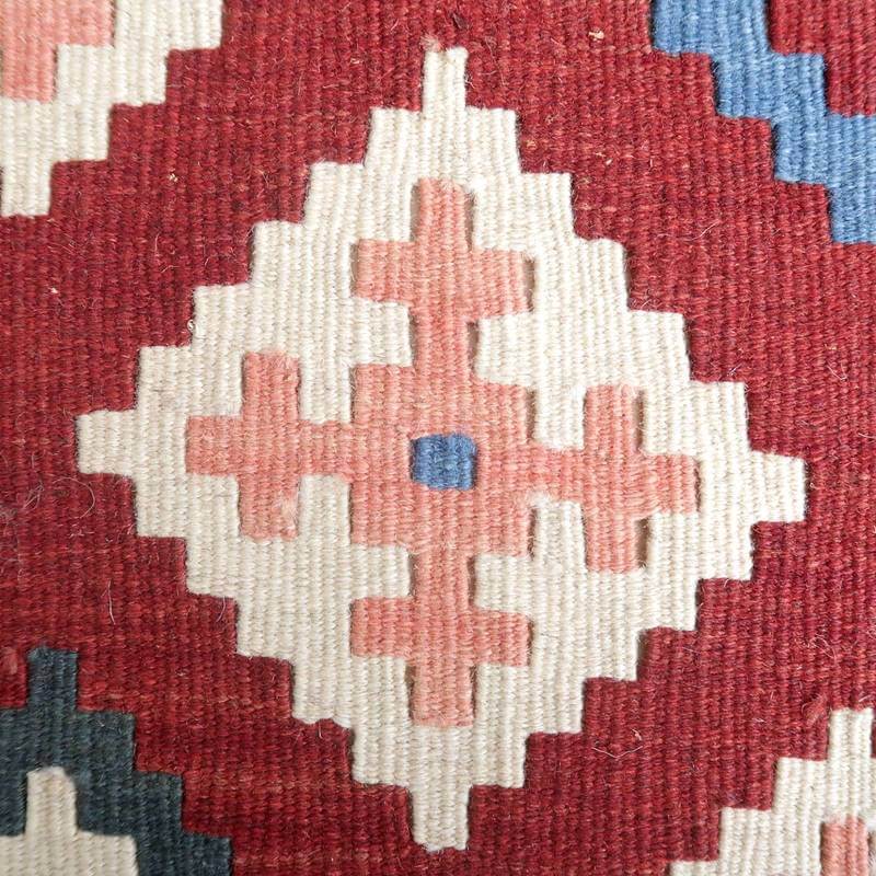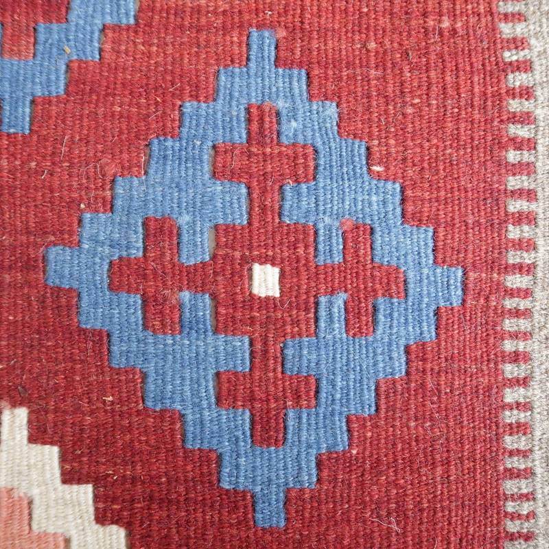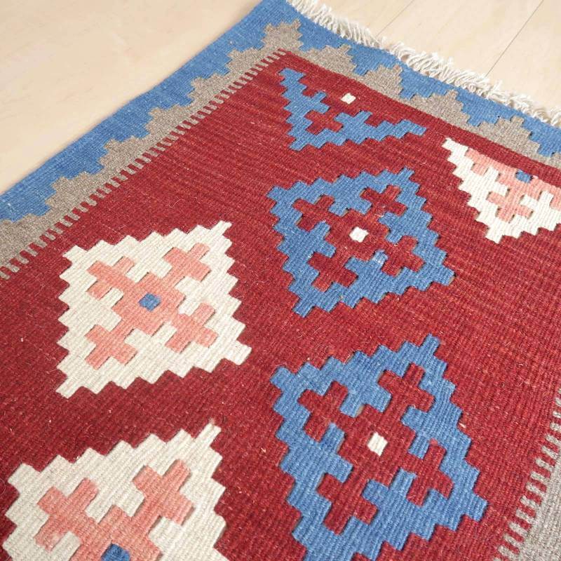 イラン南部シラーズ地方のキリムです。いくつかの色を使用した幾何学柄やギザギザ文様はリズムのある明るい雰囲気。使用している色はどれも、くすみのある落ち着いた色なので、目立たずインテリアに馴染みます。カシュガイの女性が昔ながらに織り上げたキリムなので、よく締まった丈夫な織り目で、早く仕上げる為、ゆるく粗く織られる商用生産のキリムには無い、誠実さが伝わってくる一枚です。また、平織り(ひらおり)という裏表の無い織り方で両面使えます。カシュガイ・キリムは遊牧のテント生活用の為、丈夫に織られ、洗濯も簡単、普段使いのラグとして扱いやすいキリムです。上端で63センチ、下端で60センチと横幅に手織りならではの違いがございます。