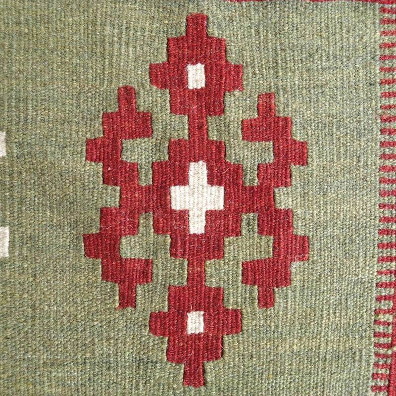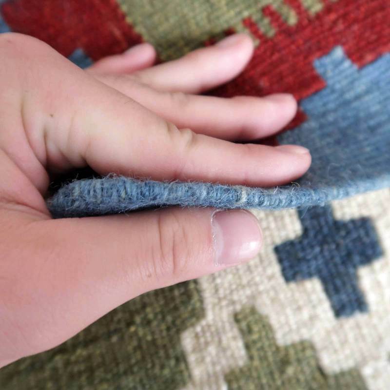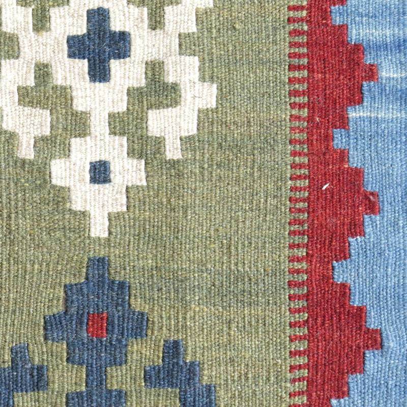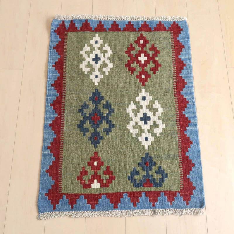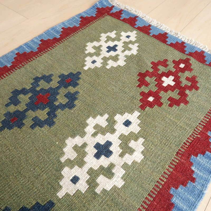 イラン南部シラーズ地方のキリムです。いくつかの色を使用した幾何学柄やギザギザ文様はリズムのある明るい雰囲気。使用している色はどれも、くすみのある落ち着いた色なので、目立たずインテリアに馴染みます。カシュガイの女性が昔ながらに織り上げたキリムなので、よく締まった丈夫な織り目で、早く仕上げる為、ゆるく粗く織られる商用生産のキリムには無い、誠実さが伝わってくる一枚です。また、平織り(ひらおり)という裏表の無い織り方で両面使えます。カシュガイ・キリムは遊牧のテント生活用の為、丈夫に織られ、洗濯も簡単、普段使いのラグとして扱いやすいキリムです。