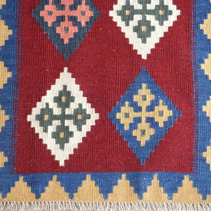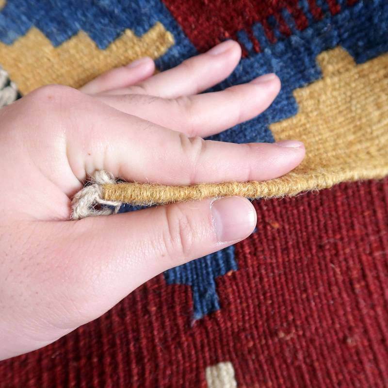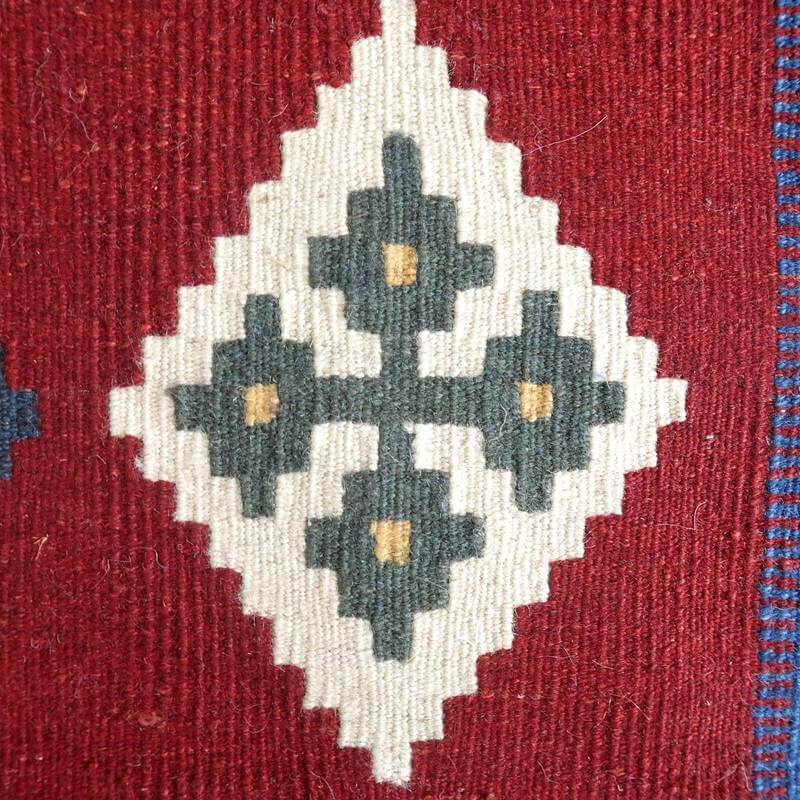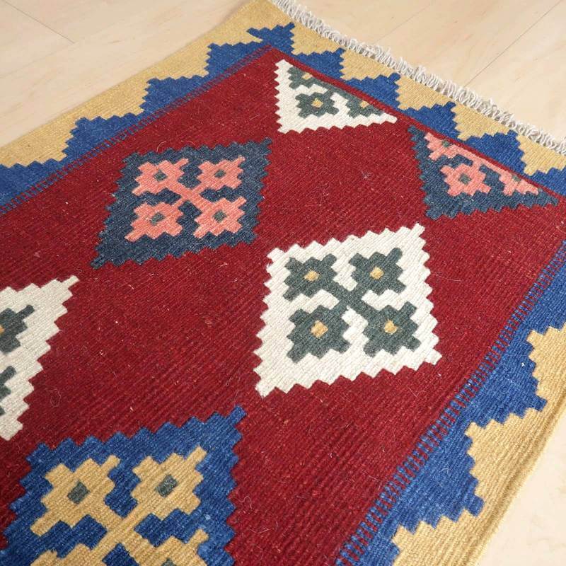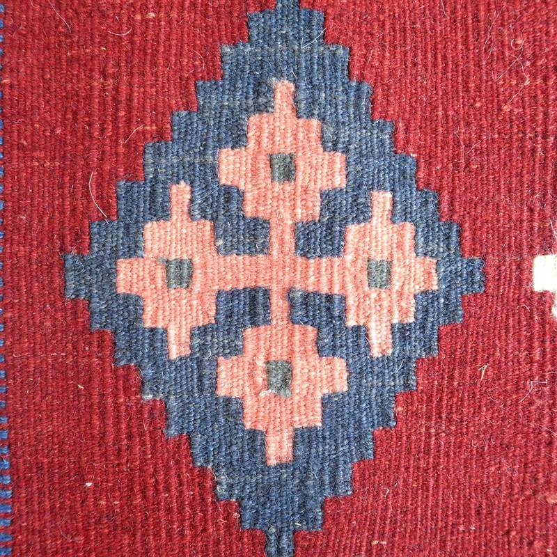 イラン南部シラーズ地方のキリムです。いくつかの色を使用した幾何学柄やギザギザ文様はリズムのある明るい雰囲気。使用している色はどれも、くすみのある落ち着いた色なので、目立たずインテリアに馴染みます。カシュガイの女性が昔ながらに織り上げたキリムなので、よく締まった丈夫な織り目で、早く仕上げる為、ゆるく粗く織られる商用生産のキリムには無い、誠実さが伝わってくる一枚です。また、平織り(ひらおり)という裏表の無い織り方で両面使えます。カシュガイ・キリムは遊牧のテント生活用の為、丈夫に織られ、洗濯も簡単、普段使いのラグとして扱いやすいキリムです。