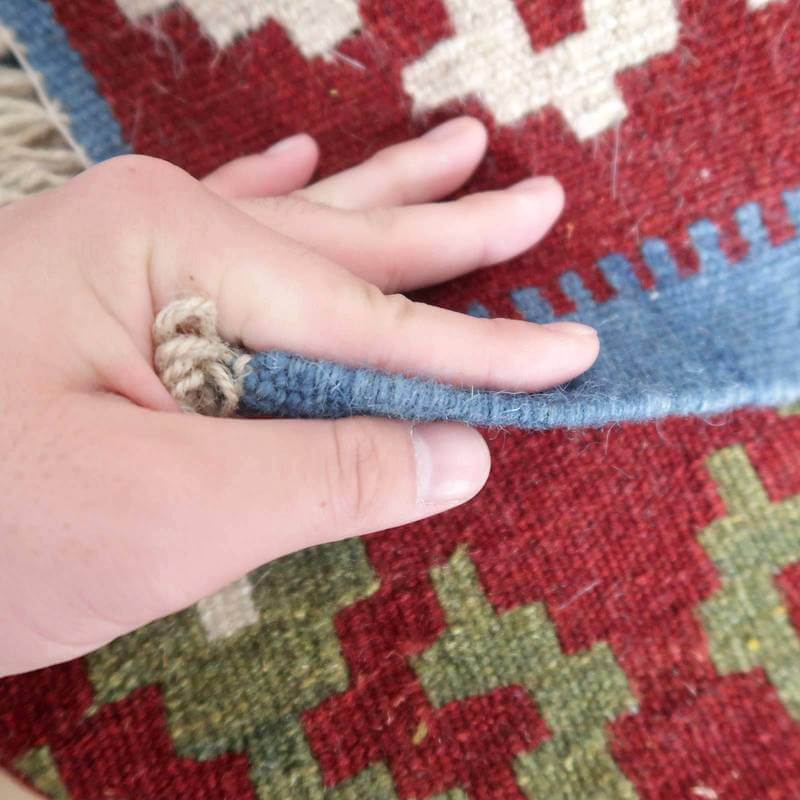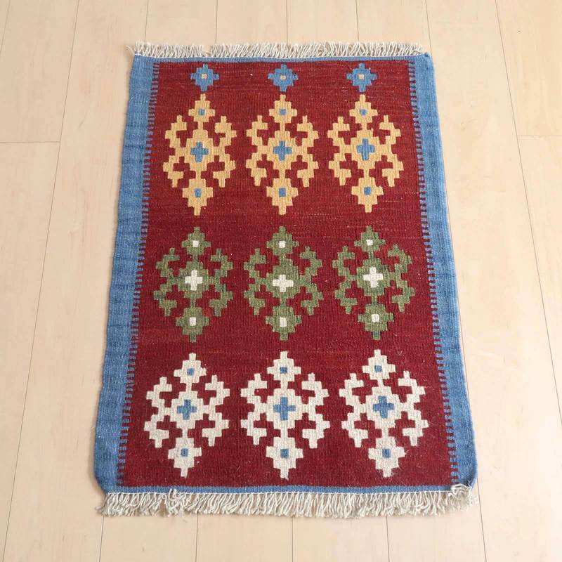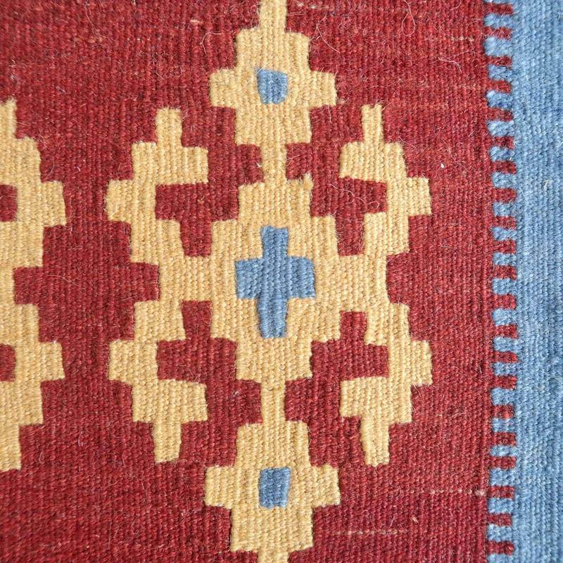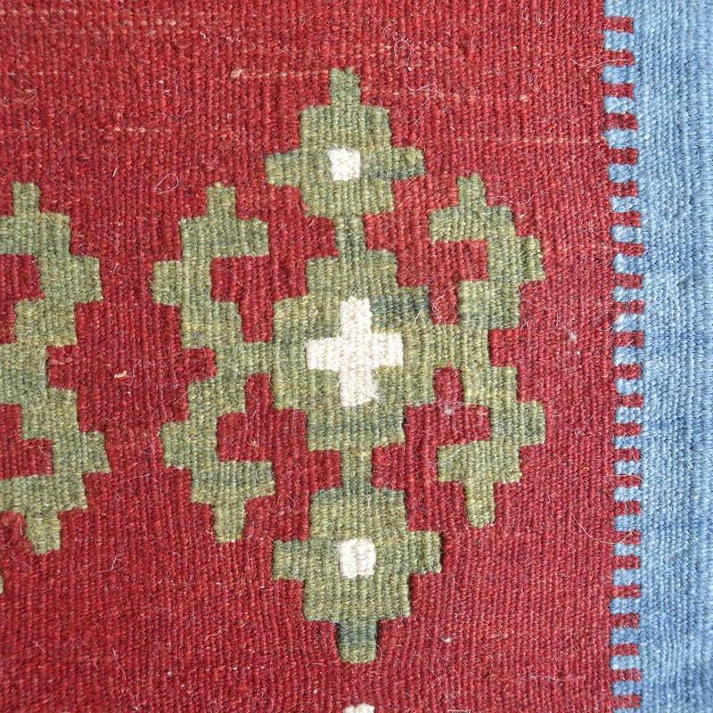 イラン南部シラーズ地方のキリムです。いくつかの色を使用した幾何学柄やギザギザ文様はリズムのある明るい雰囲気。使用している色はどれも、くすみのある落ち着いた色なので、目立たずインテリアに馴染みます。カシュガイの女性が昔ながらに織り上げたキリムなので、よく締まった丈夫な織り目で、早く仕上げる為、ゆるく粗く織られる商用生産のキリムには無い、誠実さが伝わってくる一枚です。また、平織り(ひらおり)という裏表の無い織り方で両面使えます。カシュガイ・キリムは遊牧のテント生活用の為、丈夫に織られ、洗濯も簡単、普段使いのラグとして扱いやすいキリムです。
