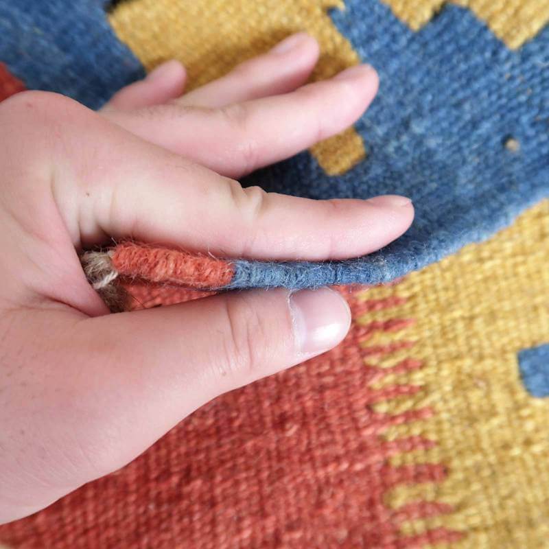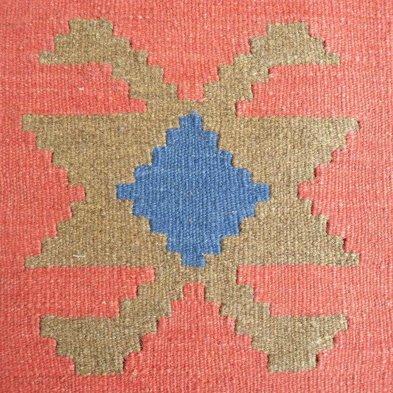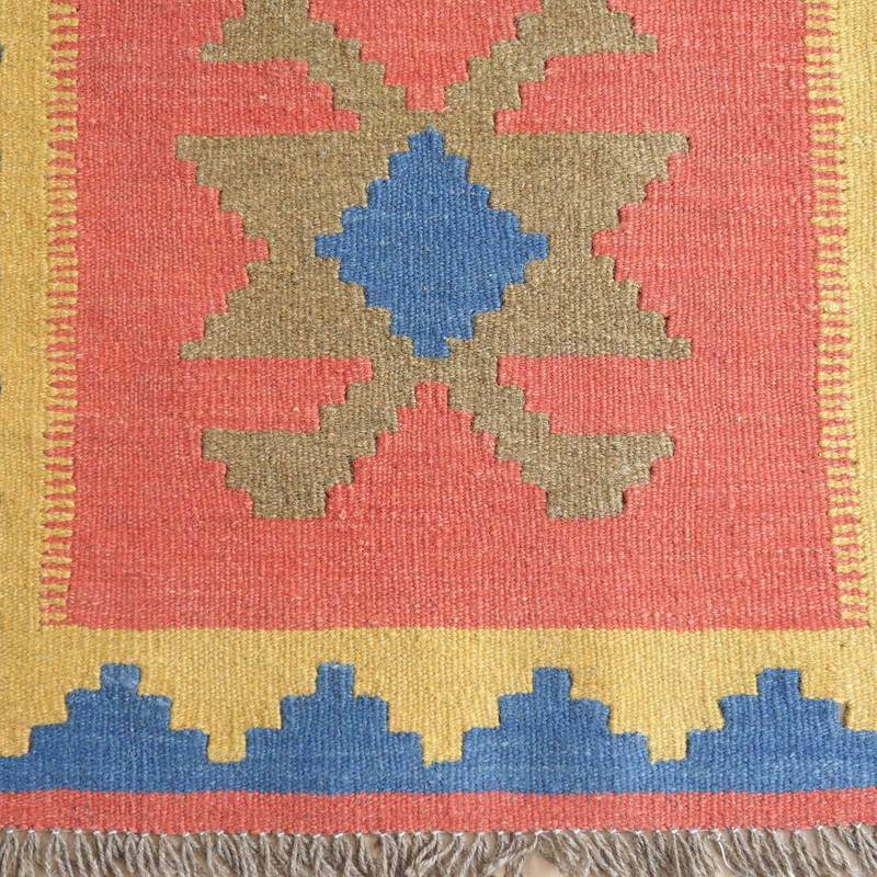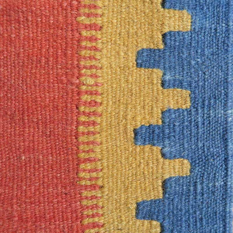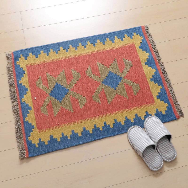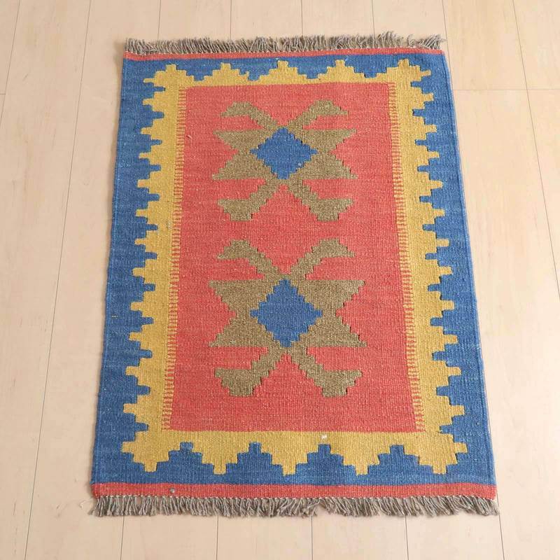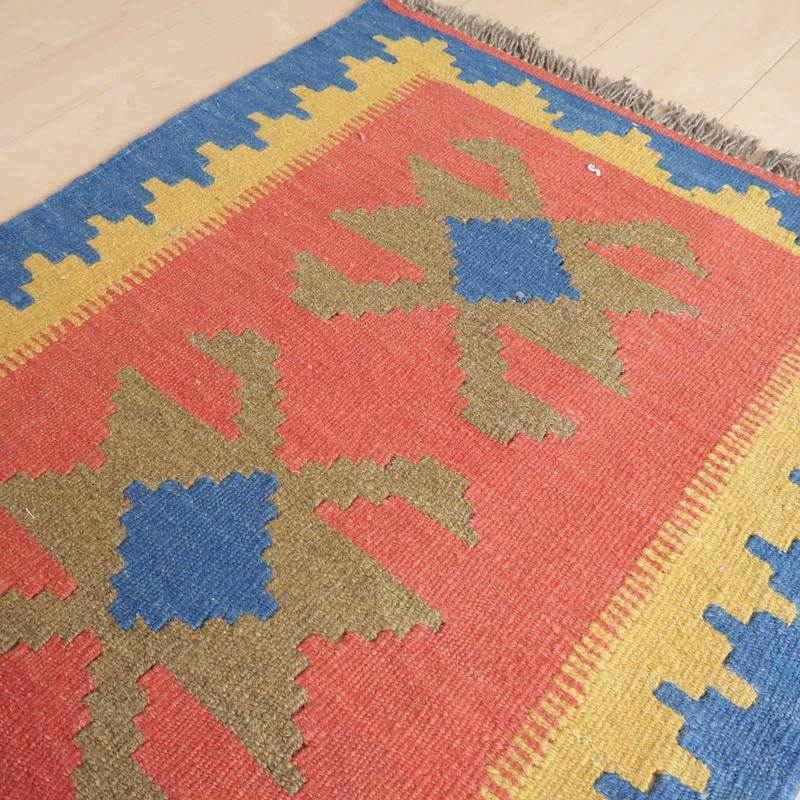 イラン南部シラーズ地方のキリムです。いくつかの色を使用した幾何学柄やギザギザ文様はリズムのある明るい雰囲気。使用している色はどれも、くすみのある落ち着いた色なので、目立たずインテリアに馴染みます。カシュガイの女性が昔ながらに織り上げたキリムなので、よく締まった丈夫な織り目で、早く仕上げる為、ゆるく粗く織られる商用生産のキリムには無い、誠実さが伝わってくる一枚です。また、平織り(ひらおり)という裏表の無い織り方で両面使えます。カシュガイ・キリムは遊牧のテント生活用の為、丈夫に織られ、洗濯も簡単、普段使いのラグとして扱いやすいキリムです。