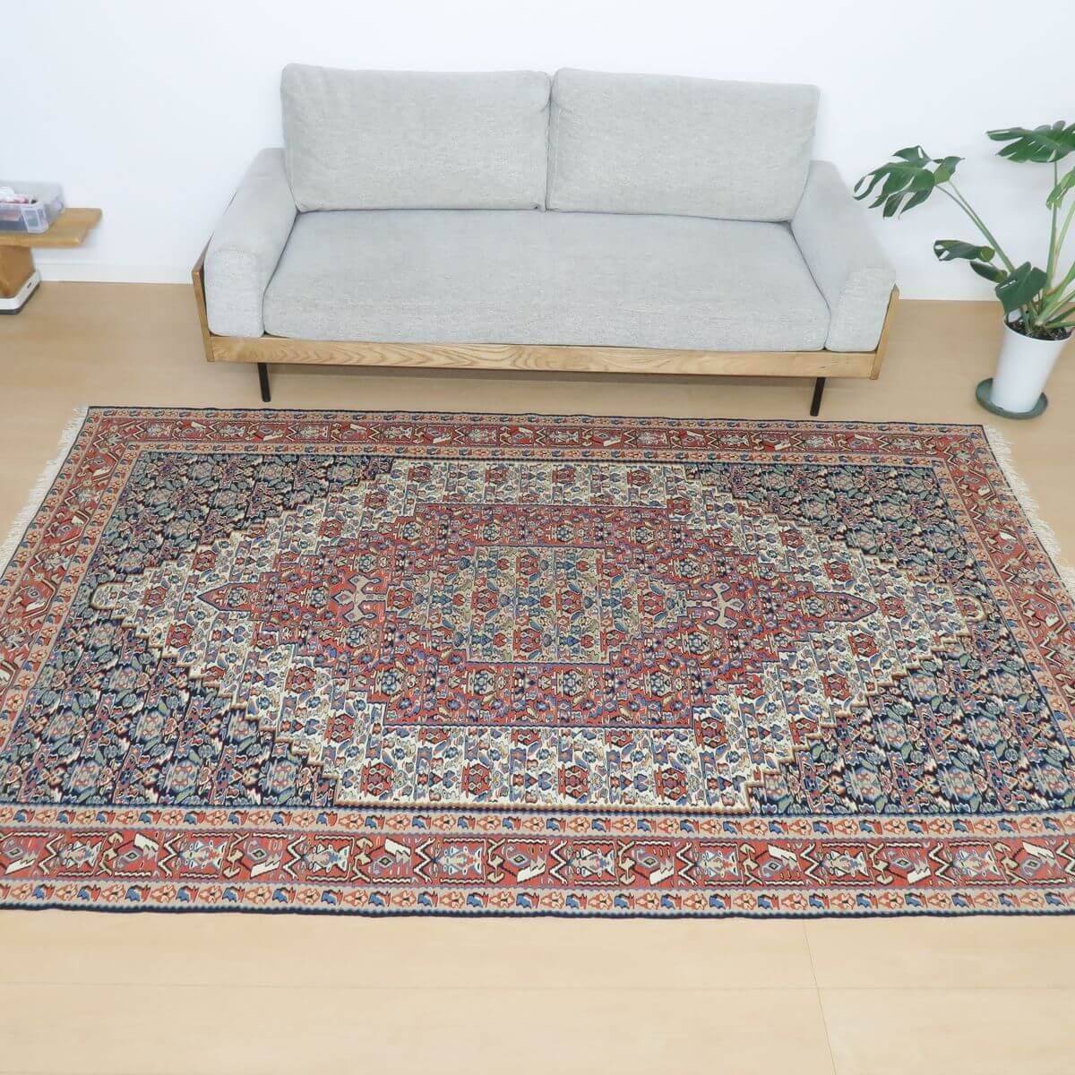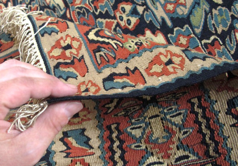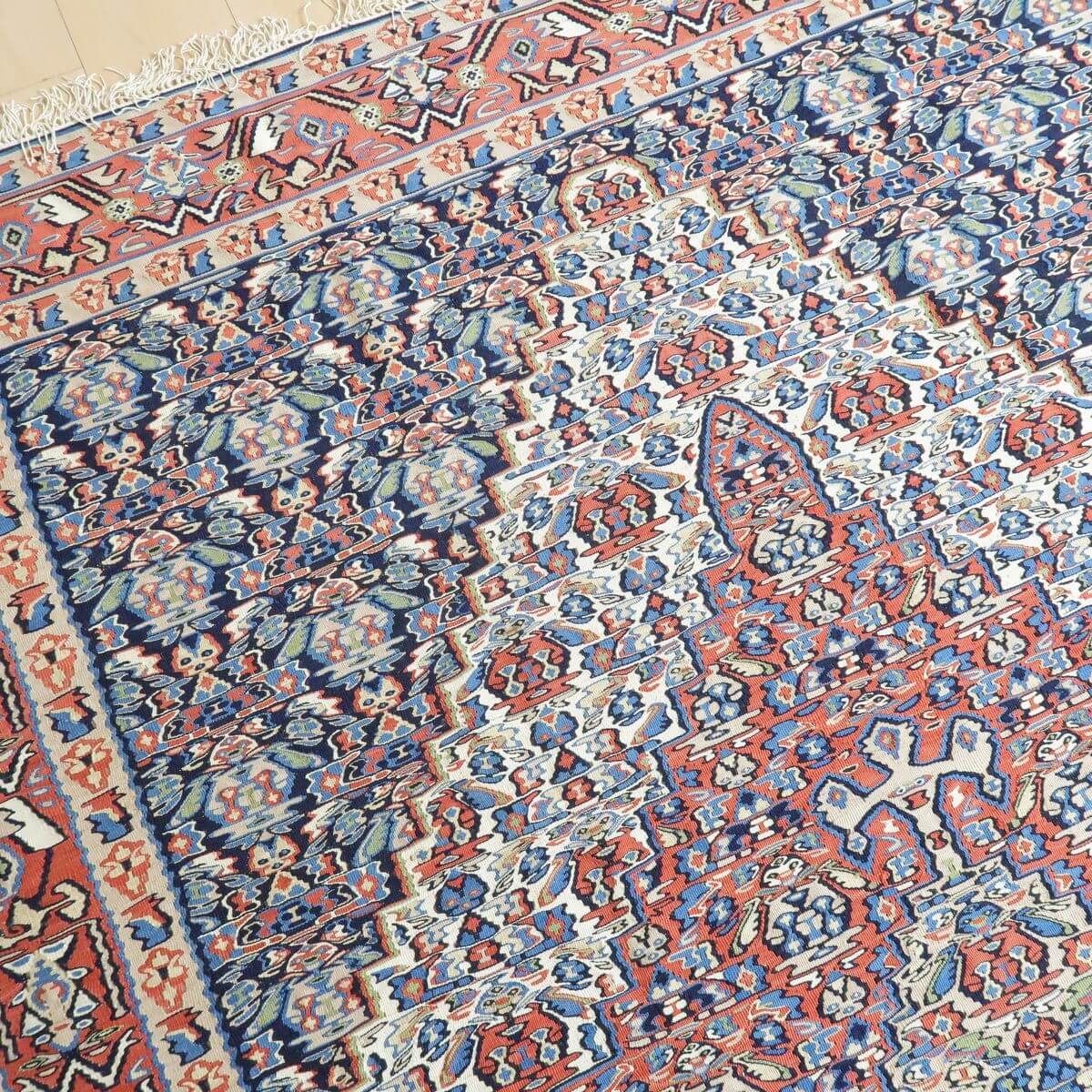 濃紺・朱オレンジ・白・ベージュがベースで枠は朱オレンジとベージュ、落ち着きのあるアンティクの草木染キリムです。 くにゃっとカーブした曲線的な文様のラインは、この地方だけの固有の曲線織り技法を用いた伝統柄ですが、その中でもこちらは最高級レベルの作りのキリムで、緻密に入り組んだ模様を編み出す技術には本当に驚嘆せずにはいられません。縦糸にシルクを使用して、非常に細い織糸を使った厚さ5ミリ弱ほどの布のような生地なので、ラグ用途以外にタペストリーや椅子・テーブルに掛けても素敵です。裏表の無い両面とも使える作りのキリムとなります。最近ではこのような手間の掛かるものは作られる数が少なくなってきています。長さ(縦)が、真ん中で4cmくらい短くなっています。