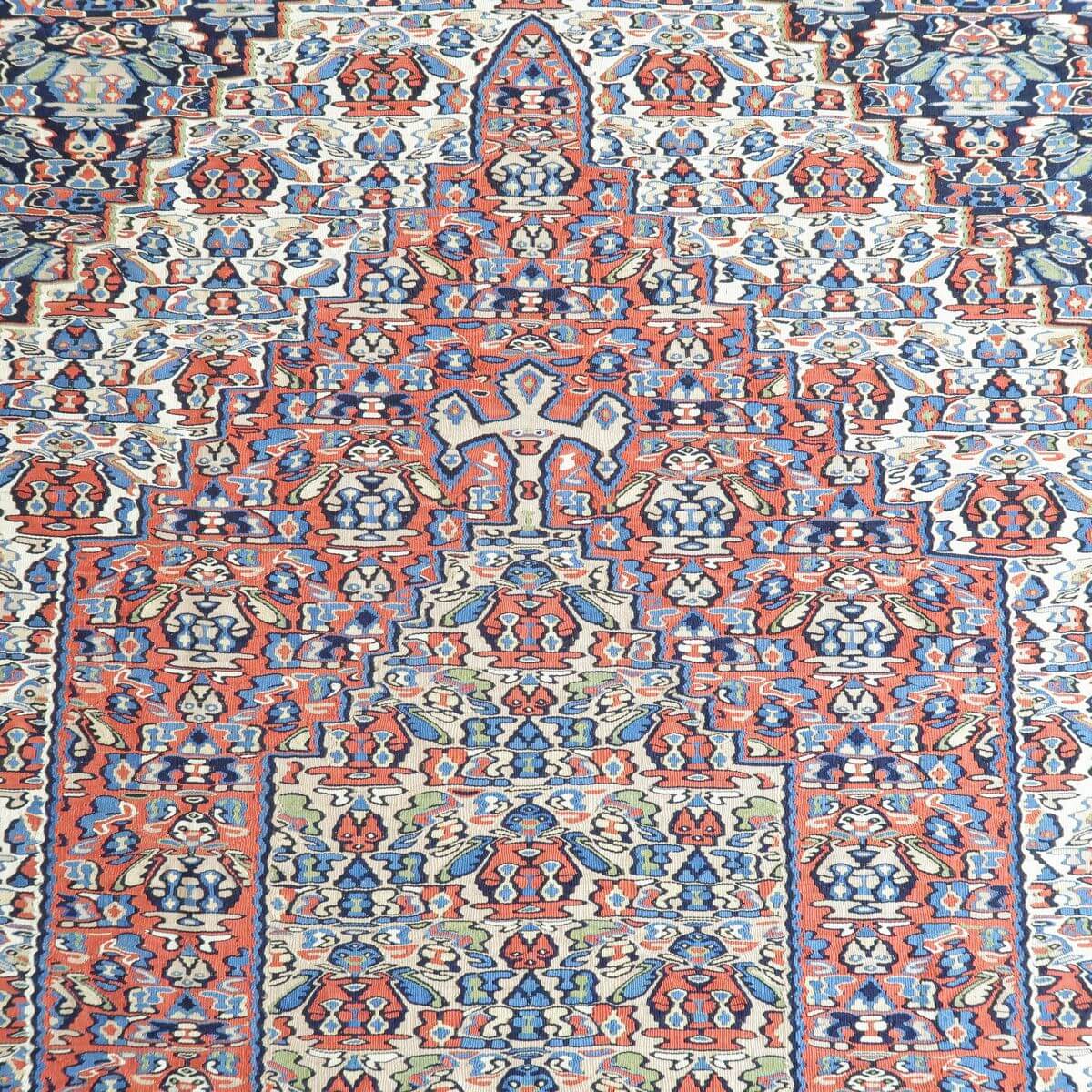 サナンダジ(セネ、ビジャー)地方のキリムは、織りの細かな薄手のものが比較的多く、曲線織りと呼ばれる丸みのある模様のラインを出す為の高度なテクニックが伝統的に受け継がれています。押し潰されたようなモチーフは、この産地のキリムの独自のデザイン。配色やデザインを遠目に眺めても、また近くで草花や人などのモチーフを一つ一つ眺めて見るのも楽しいです。