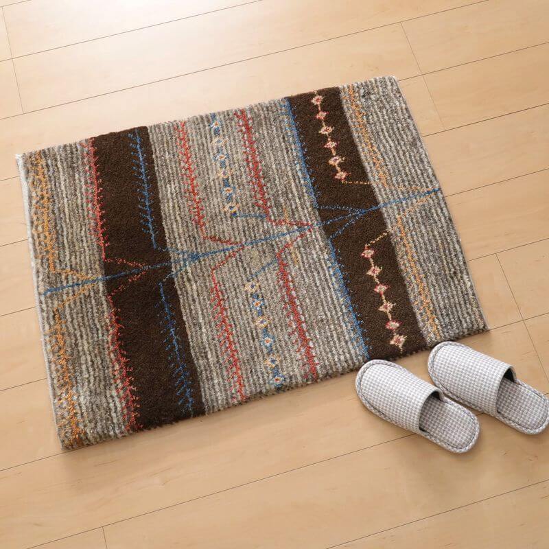照明の違いで色合いが多少違って見えます。また、ギャッベは毛足に向きがあるので、見る方向で、明るかったり暗かったりも見えます。