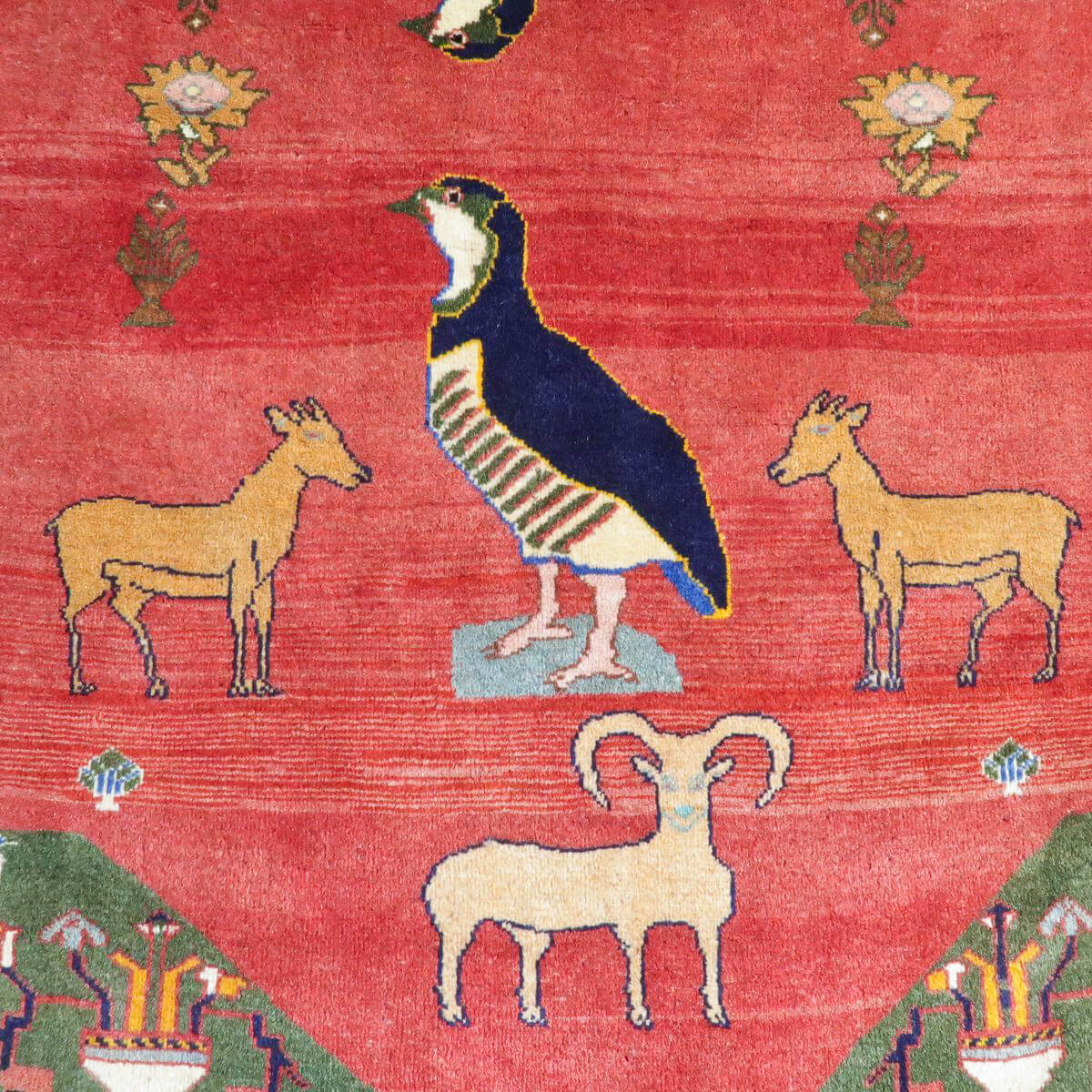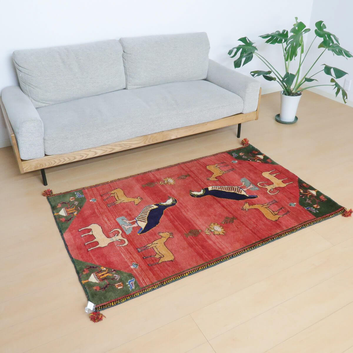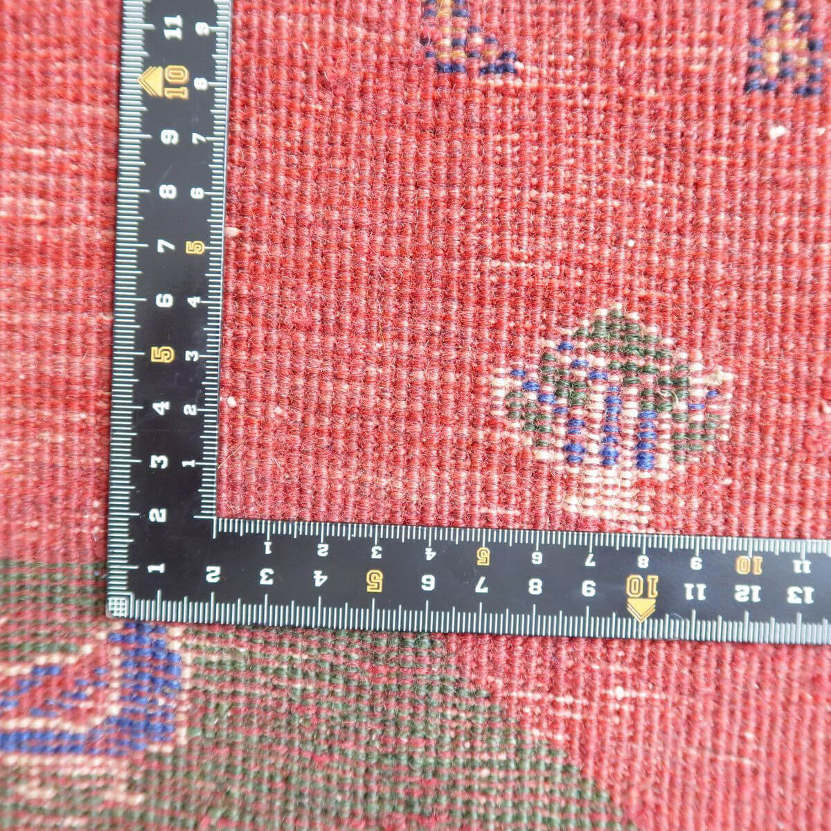 朱色とモスグリーンが調和した枯れ感のある雰囲気。家庭用として作られたギャッベ本来の野性味溢れるこのようなトラディショナル・ギャッベは、特に、類似した品がめったになく、「世界に一枚」というユニーク性とその年代ならではの物という希少価値が高い品です。やんわり沈み込む踏み心地で、ツヤのある滑らかなウール素材。細かな織りです。