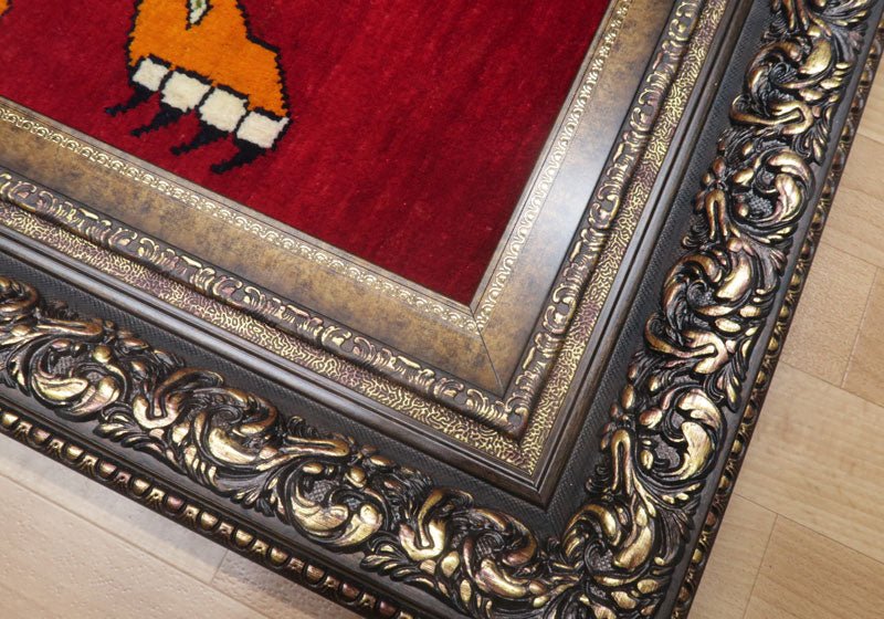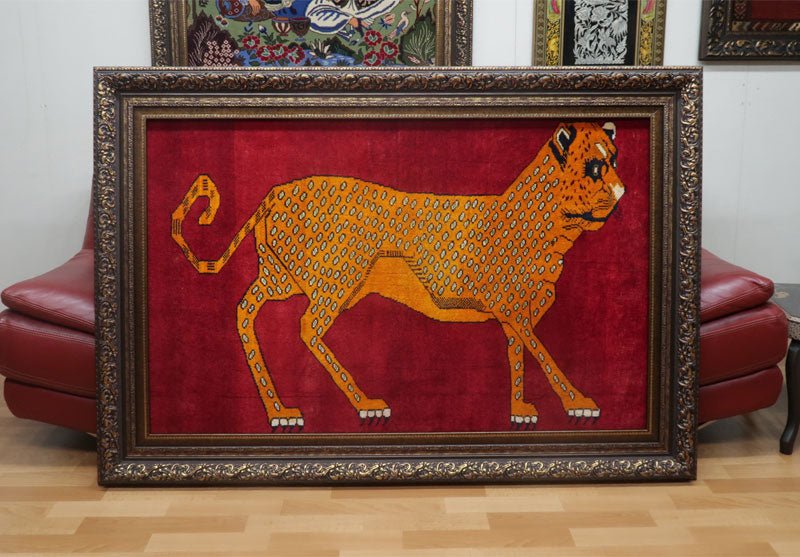 赤い背景にくっきり描かれたオレンジの大きなヒョウは、リアルな描写で存在感があります。家庭用として作られた、野性味溢れるこのようなトラディショナル・ギャッベは、特に、類似した品がめったになく、「世界に一枚」というユニーク性に価値があります。絨毯のような細かな織りなので、模様の表情は繊細です。艶めき感のある滑らかなウール素材。こちらは50年以上前に作られたアンティク品の表面を薄くシャーリングすることによって作られた当初の鮮やかな色を蘇らせており、新品のようなコンデションです。