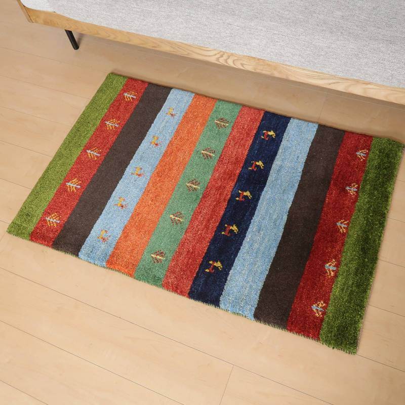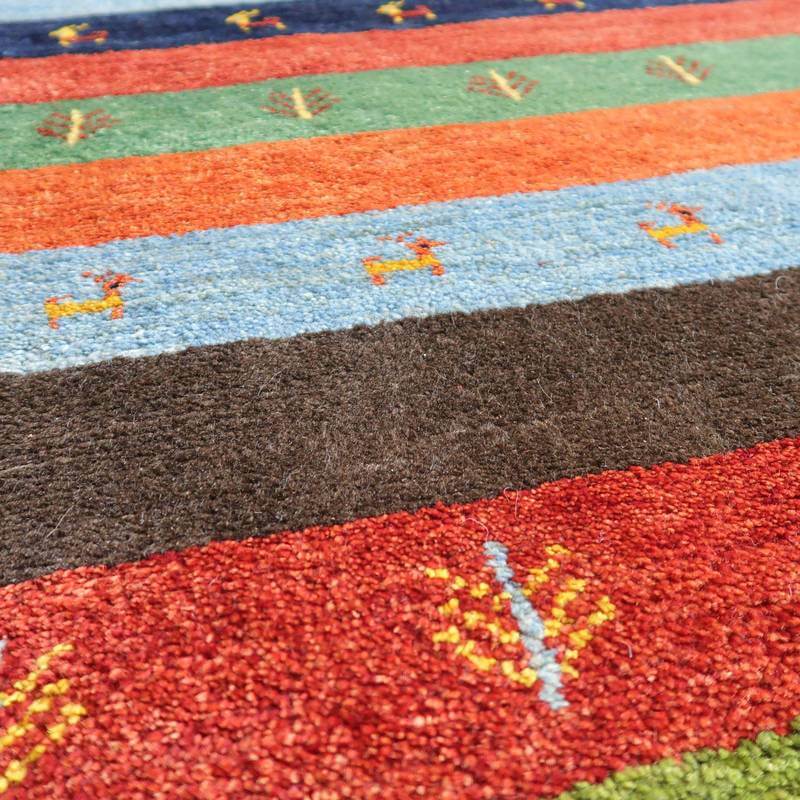 緑、紺、水色、赤、こげ茶色のボーダーデザインは多色使いながら落ち着きがあり、調和のとれた色合いです。ギャッベでおなじみ動物と生命の木のモチーフがほのぼのと並んだモダンなデザインです。目の詰まった艶のある毛足です。