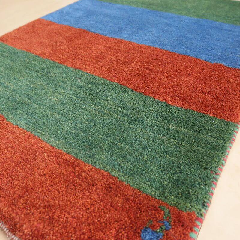 開封すぐの撮影でシワが見える写真があります。照明の違いで色合いが多少違って見えます。また、ギャッベは毛足に向きがあるので、見る方向で、明るかったり暗かったりも見えます。