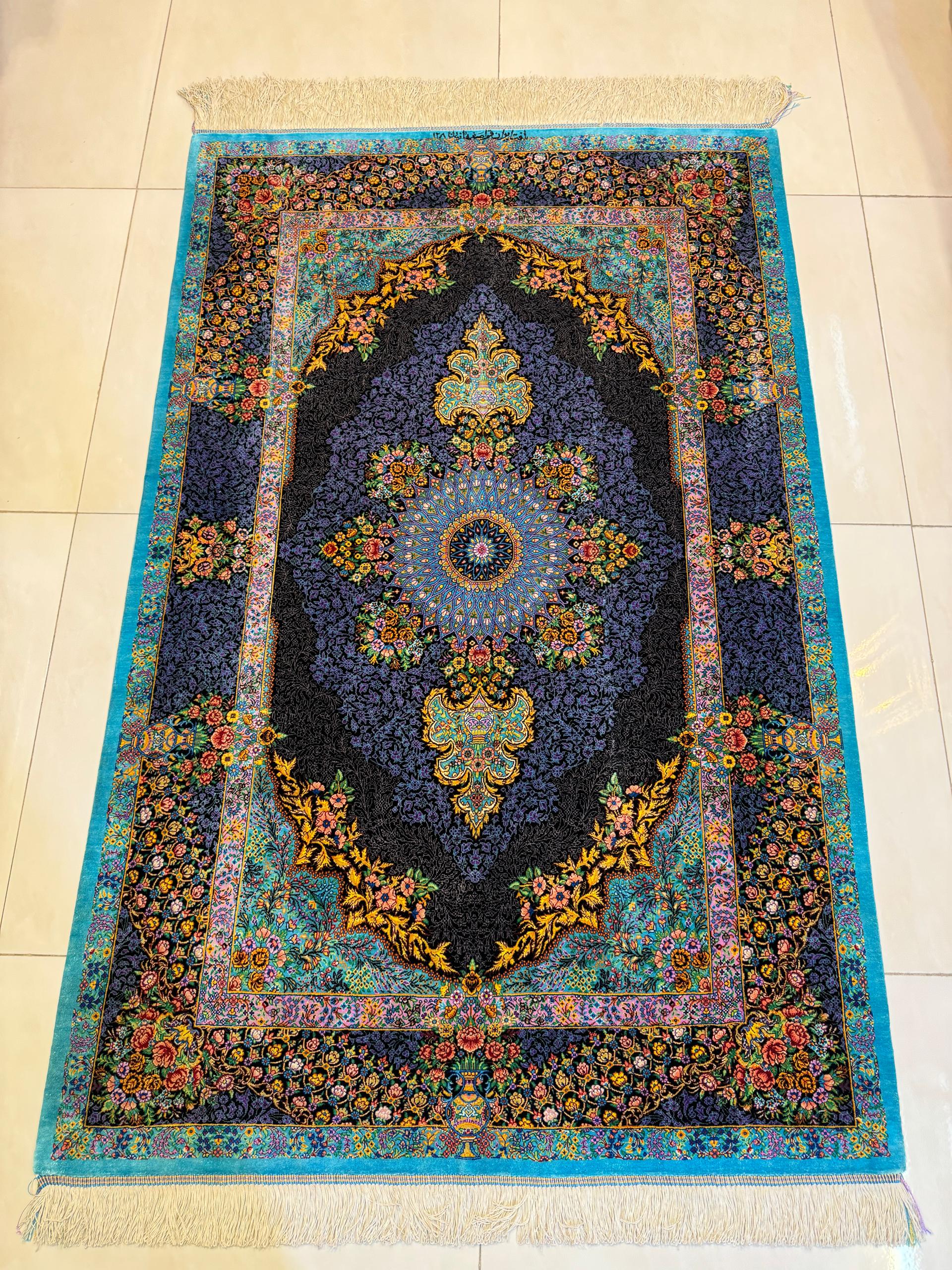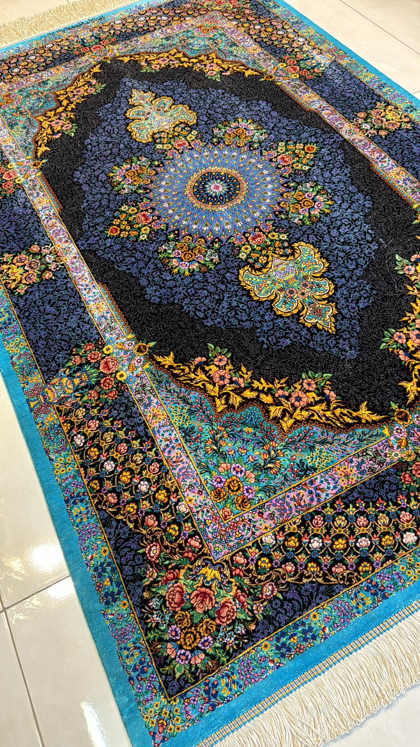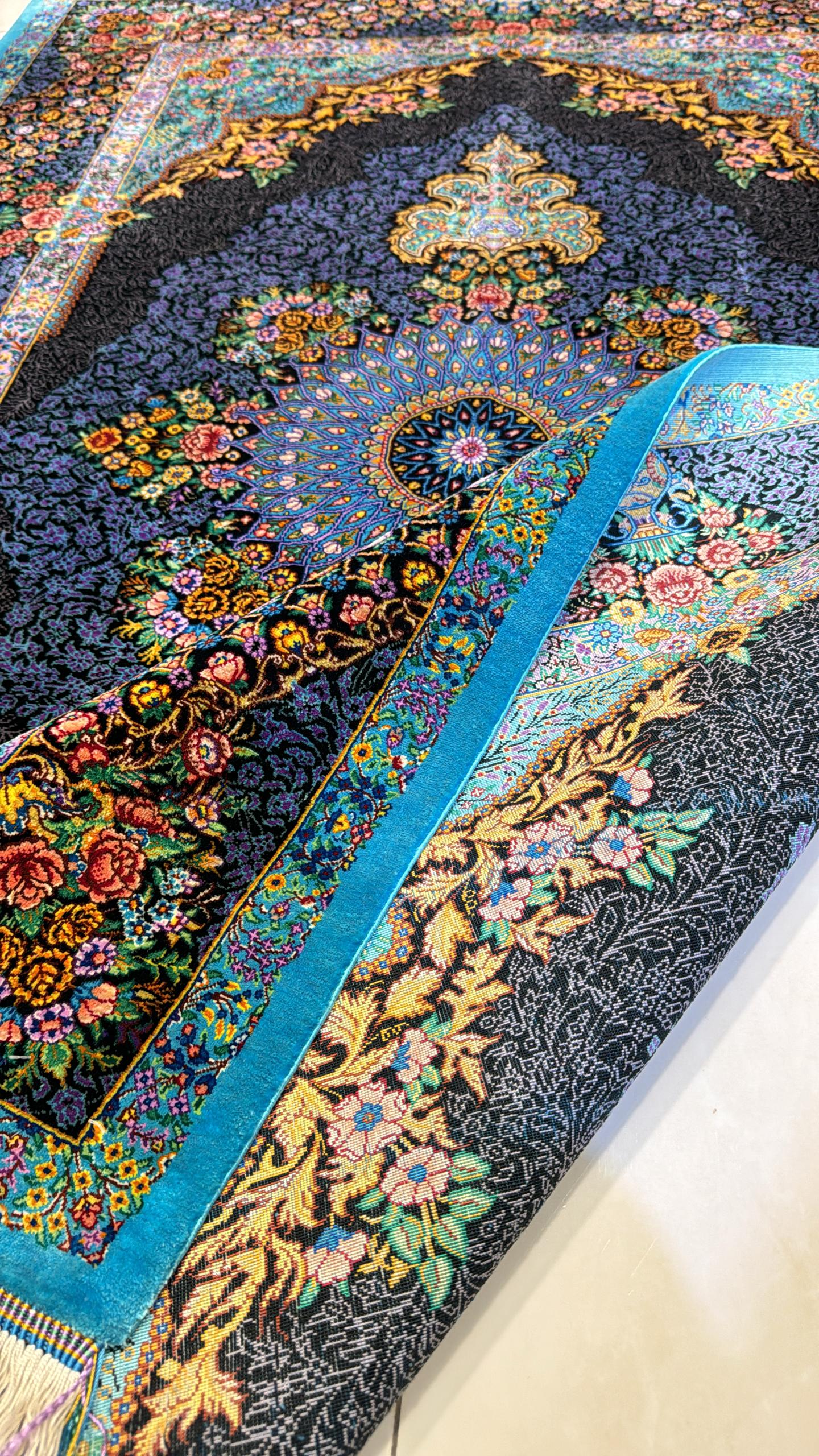 青を基調に、中央には精緻な円形のモチーフが描かれ、その周囲を華やかな花々や蔓模様が彩っています。絨毯全体にカラフルな色合いが施され、伝統的なデザインと調和しています。縁取りには植物や花瓶をモチーフにした複雑な模様が織り込まれ、細部にまでこだわりが感じられます。華やかさの中に落ち着きもあり、お部屋の雰囲気をぐっと格調高くする一枚です。