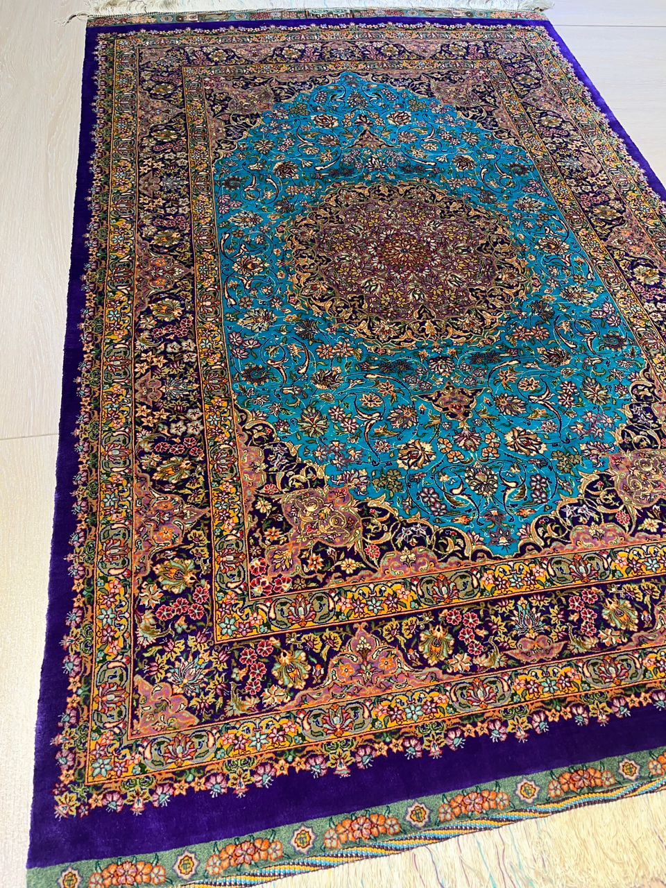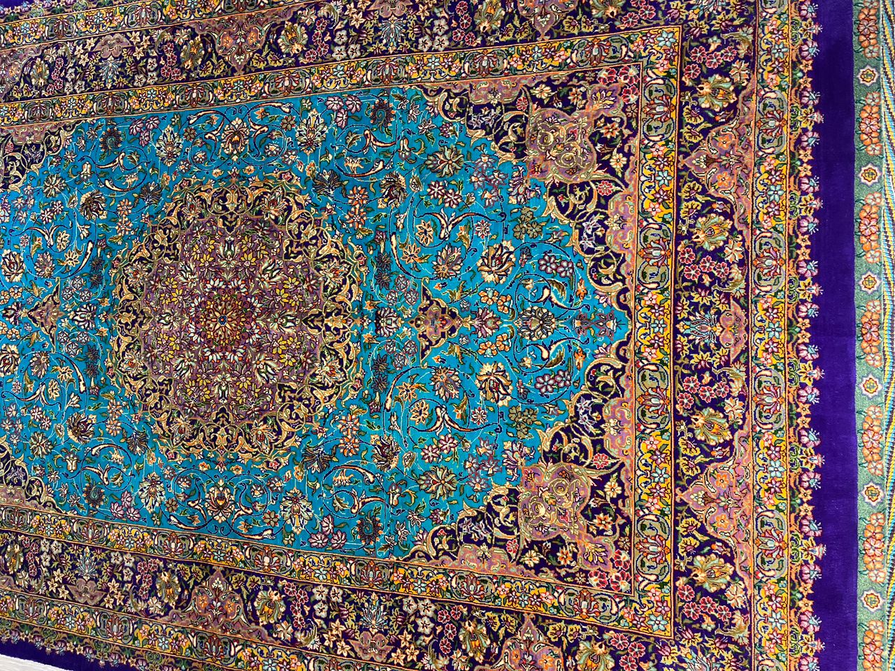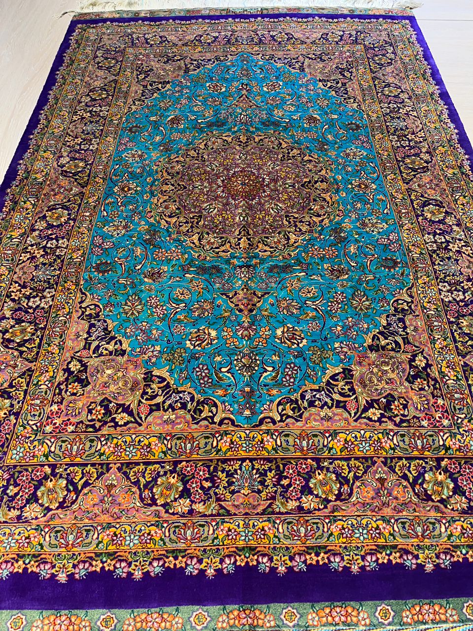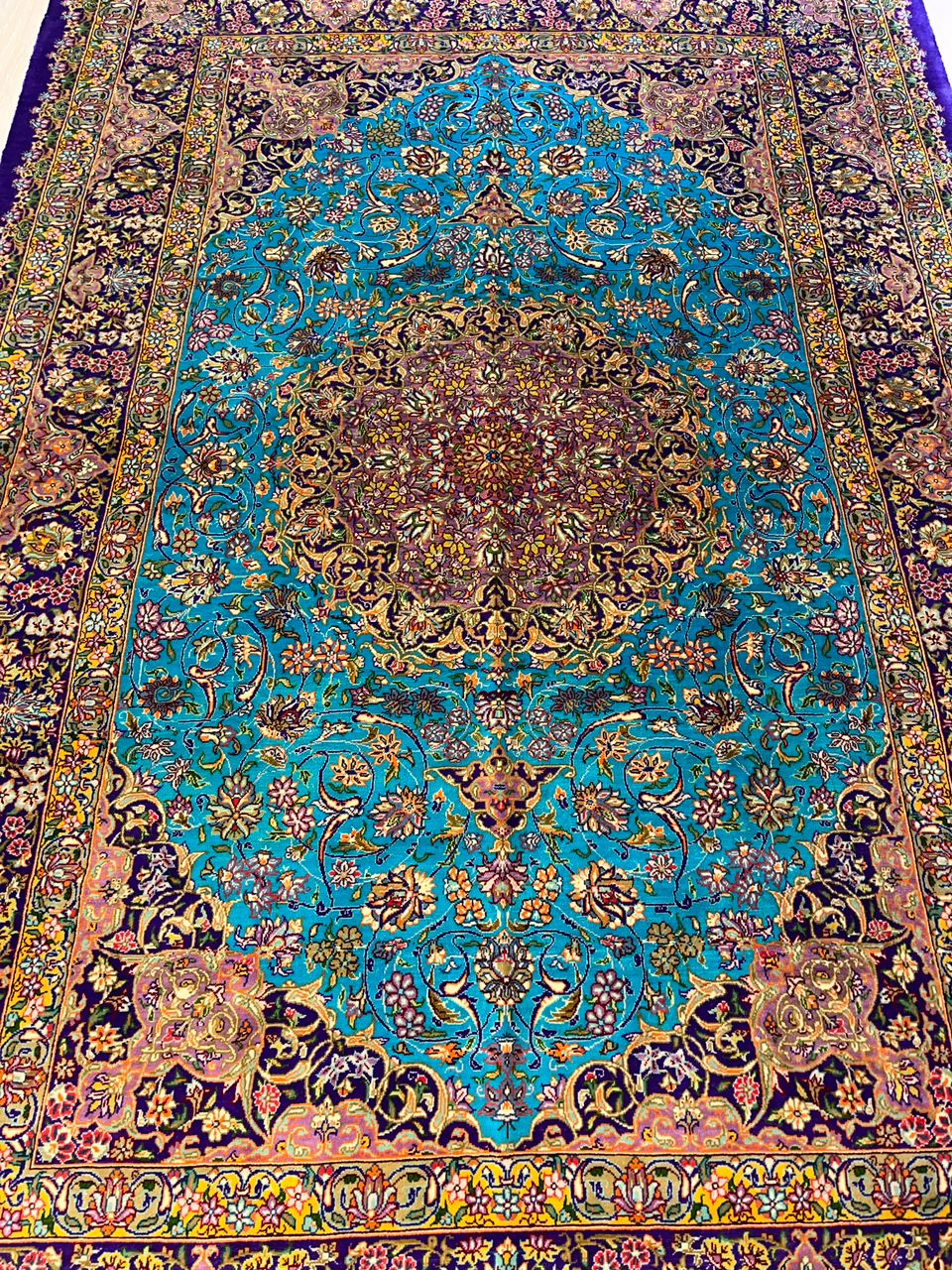 鮮やかなターコイズブルーを基調とした華やかなデザインが特徴のペルシャ絨毯です。中央には繊細なモチーフが円形に描かれ、その周囲を取り巻くようにカラフルな花々や植物のパターンが丁寧に織り込まれています。絨毯の縁には深みのある紫がアクセントとなり、全体のデザインを引き締めています。伝統的な美しさと現代的な色彩が調和し、高級感あふれる雰囲気を感じさせる一枚です。