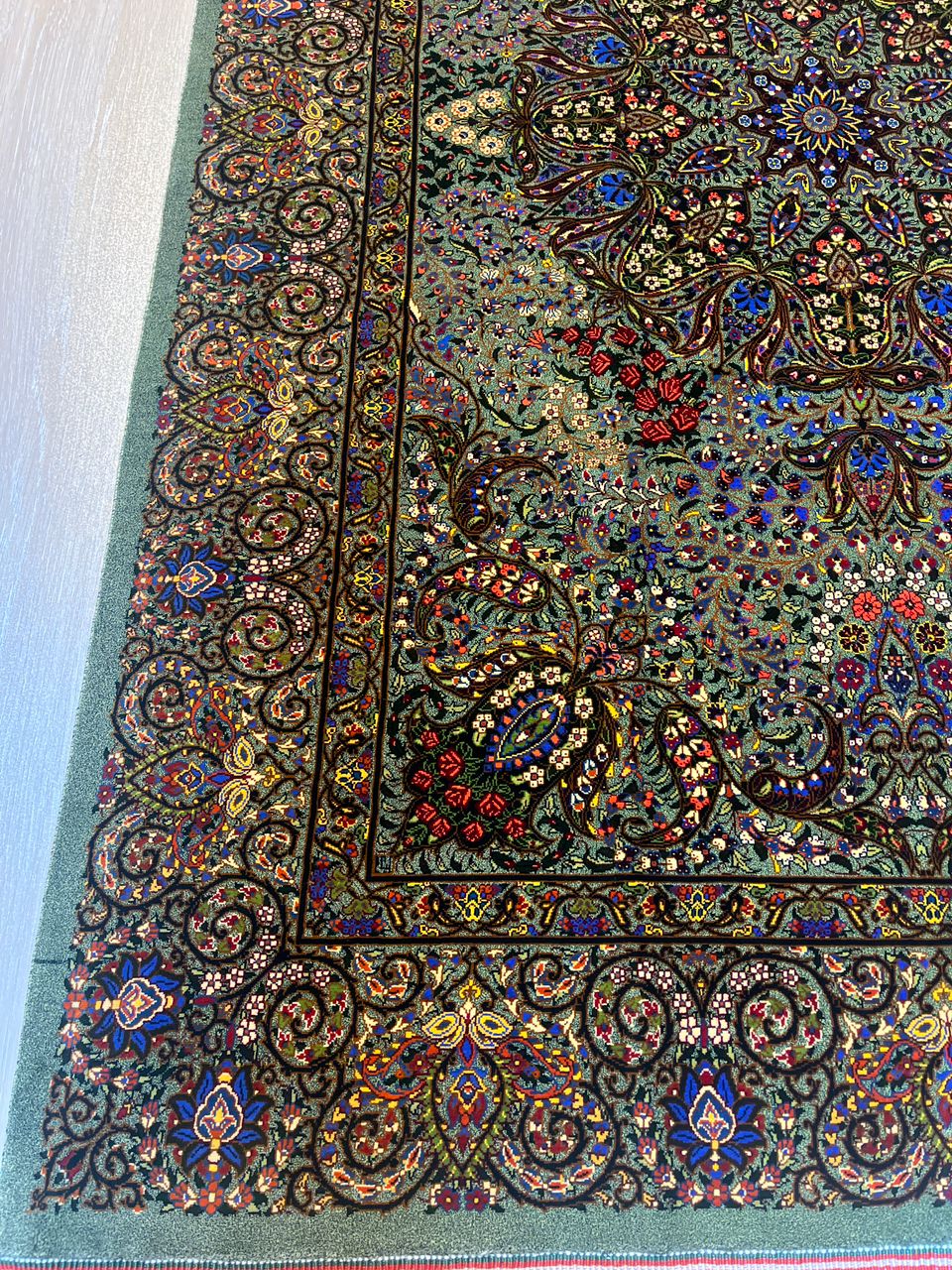 驚くような細かな織り目とビロードのような生地、肌に吸い付くようなシルクの艶やかな光沢感が豪華絢爛。まさに、「The ペルシャ絨毯」と言うべき最高峰のペルシャ絨毯は、もはや工芸品ではなく美術品としての価値となります。アッバス・ジャムシディのサイン入り。シルクの絨毯は毛足の光沢が見る向きによってまったく趣の異なる色合いになりますので、敷く際は向きを調整してください。