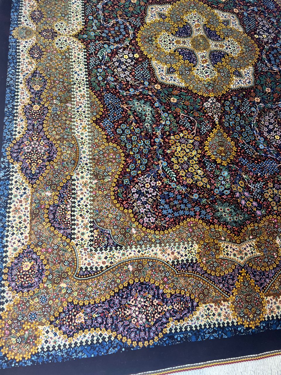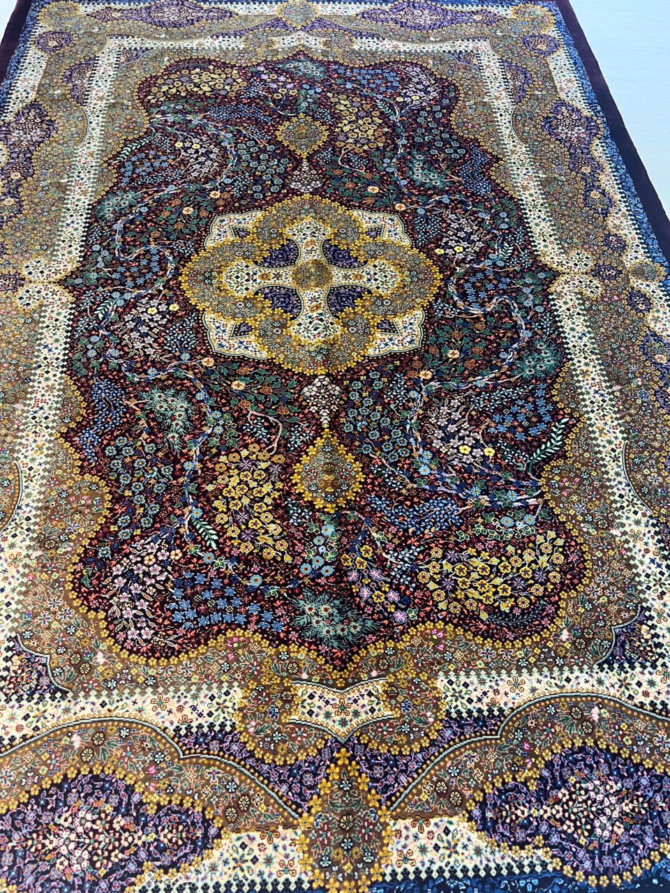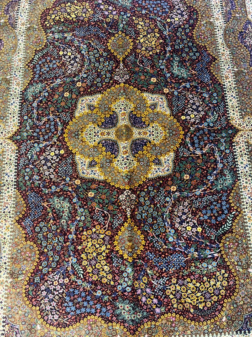 驚くような細かな織り目とビロードのような生地、肌に吸い付くようなシルクの艶やかな光沢感が豪華絢爛。まさに、「The ペルシャ絨毯」と言うべき最高峰のペルシャ絨毯は、もはや工芸品ではなく美術品としての価値となります。サデグザデ工房のサイン入り。シルクの絨毯は毛足の光沢が見る向きによってまったく趣の異なる色合いになりますので、敷く際は向きを調整してください。