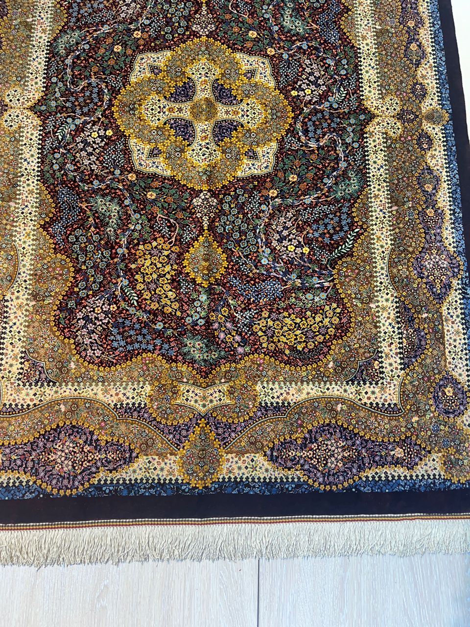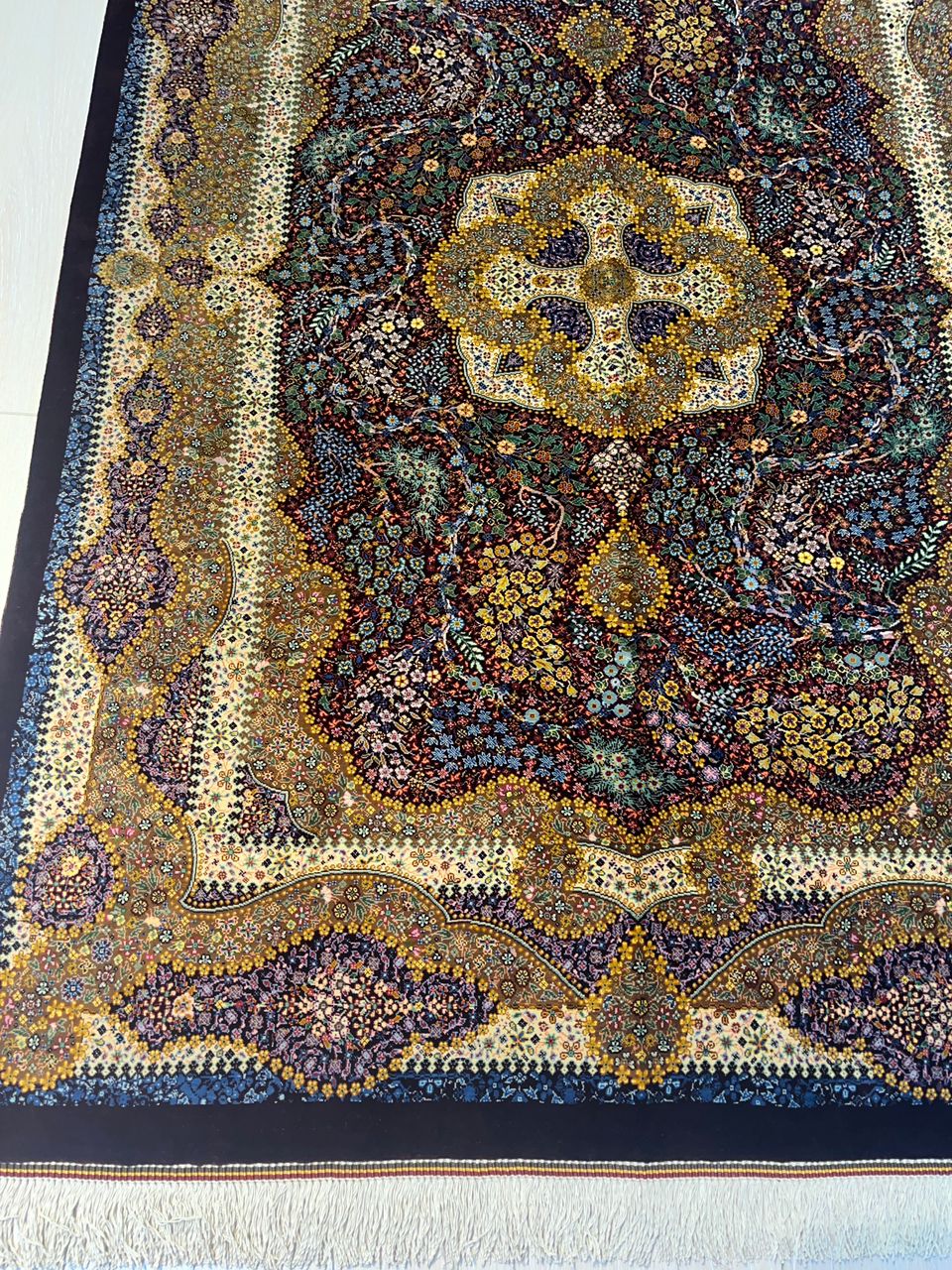 クラシックなペルシャデザインが映える一枚です。深いネイビーを基調とし、中央には幾何学的な模様と植物をモチーフにした装飾が配置されています。縁取りには優美な曲線と細やかな花模様が描かれ、全体にカラフルな色彩が調和しています。この絨毯は、伝統の職人技術による繊細な仕上がりが特徴で、空間に上品さと温かみをもたらします。