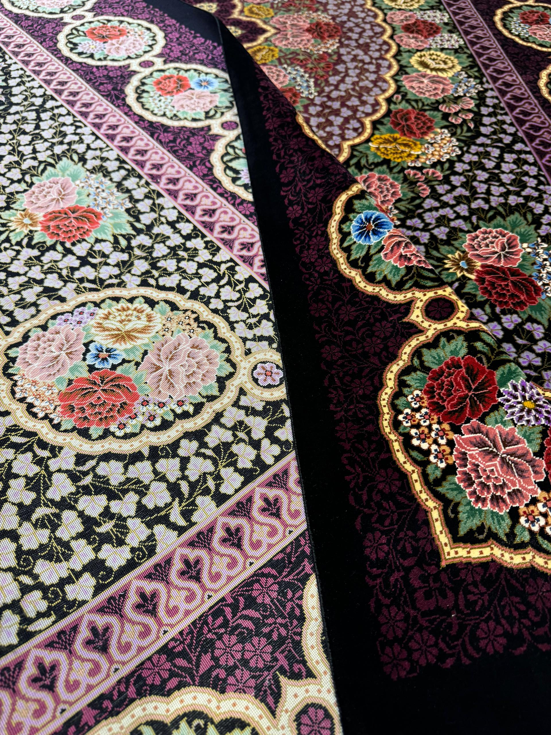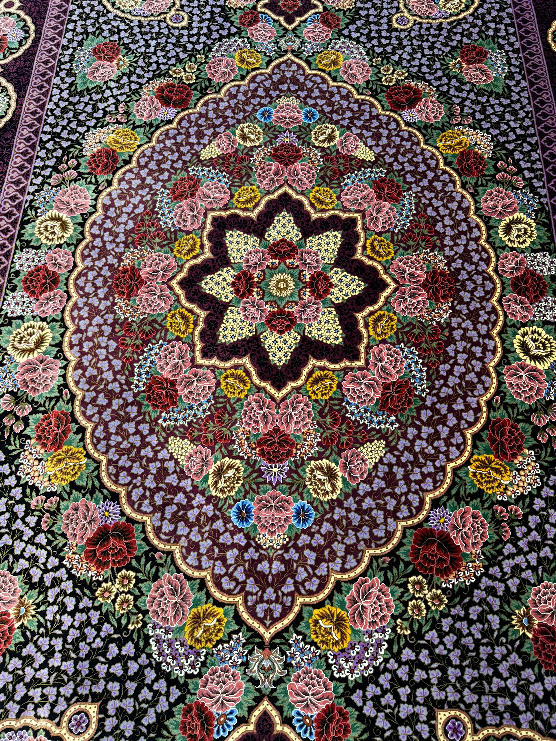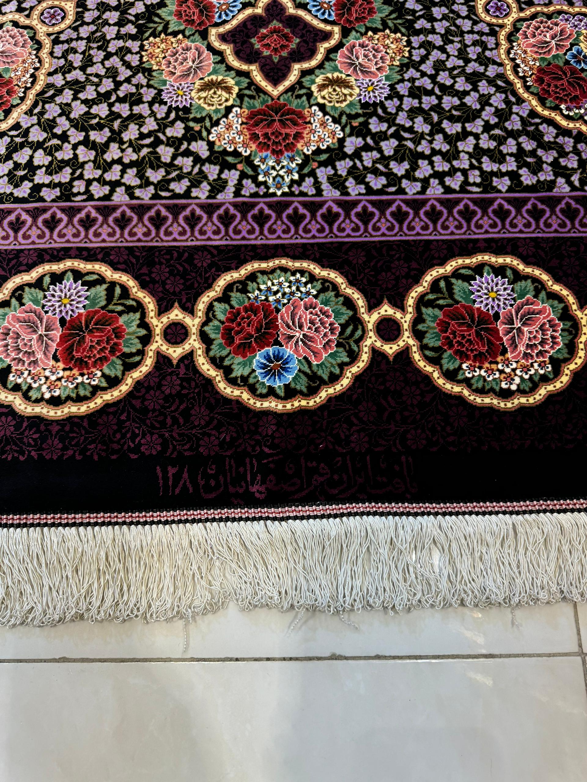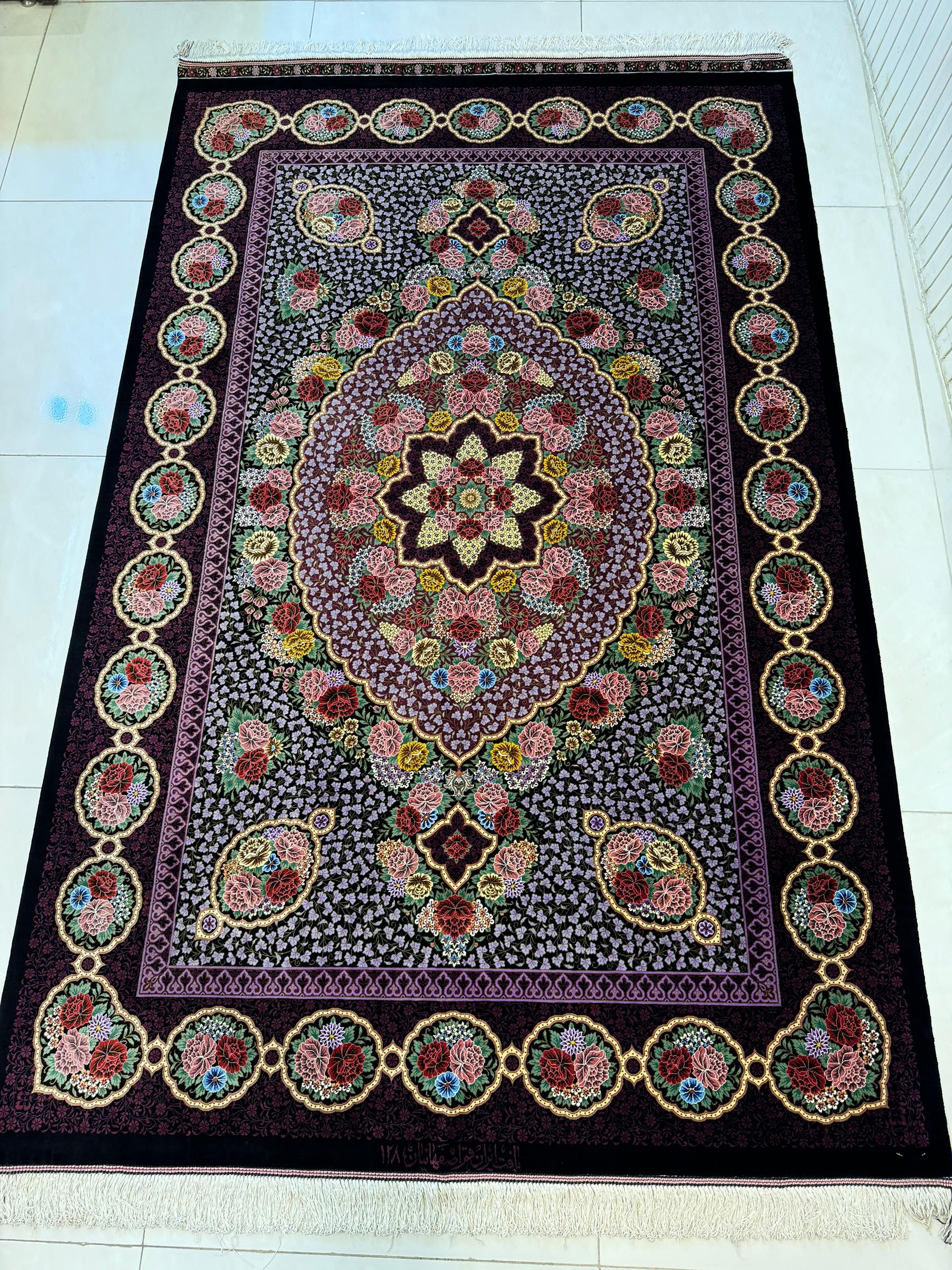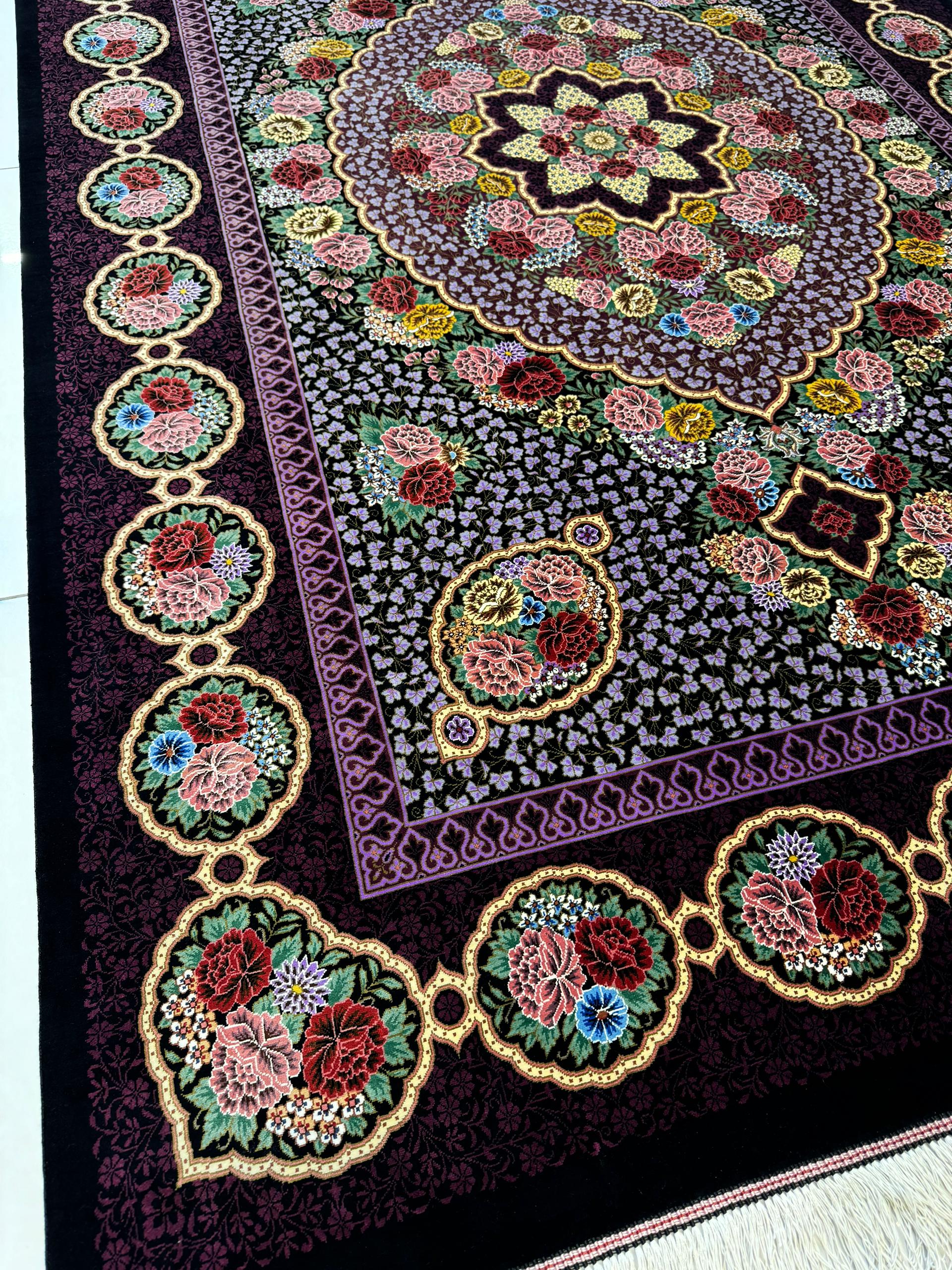 黒と紫を基調にしたエレガントな配色が魅力のペルシャ絨毯です。中央には花をモチーフにした複雑なメダリオンが描かれ、その周囲にはバラを中心とした繊細な花模様が丁寧に織り込まれています。縁取り部分にはカラフルな円形の花模様が連なり、デザイン全体に調和をもたらしています。