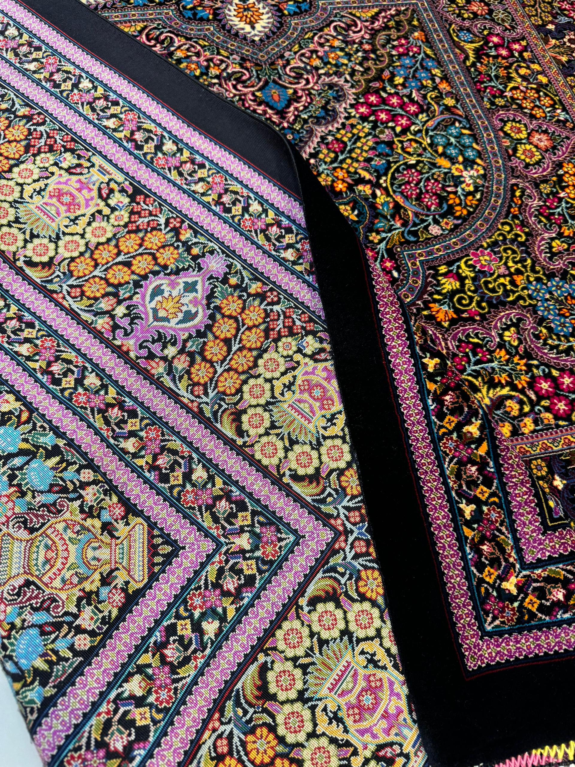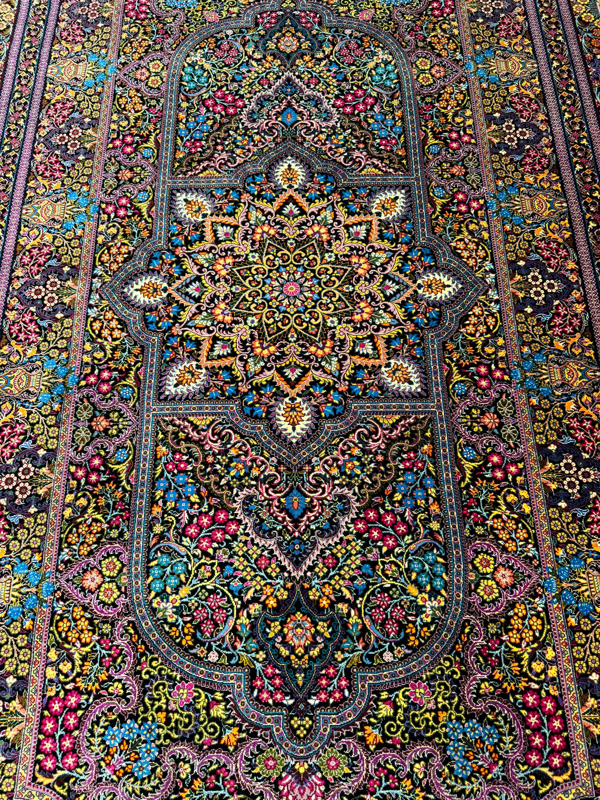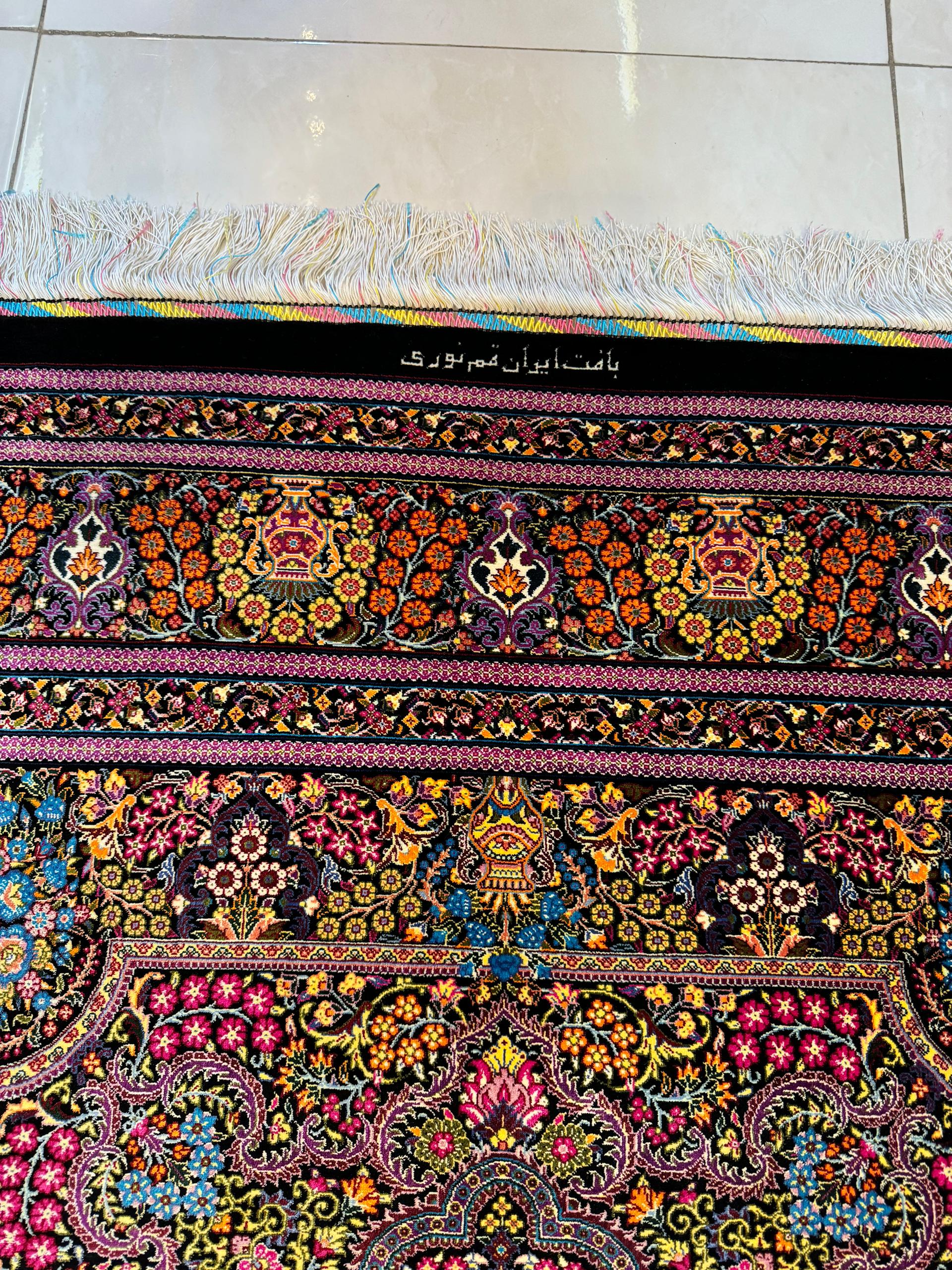 繊細なデザインが特徴のペルシャ絨毯です。深みのある黒を基調にした色彩が高級感を引き立て、中央の華やかなモチーフが空間に優雅さを添えます。周囲を囲む花模様や装飾は、カラフルな色彩で緻密に描かれており、伝統とモダンが調和した逸品です。