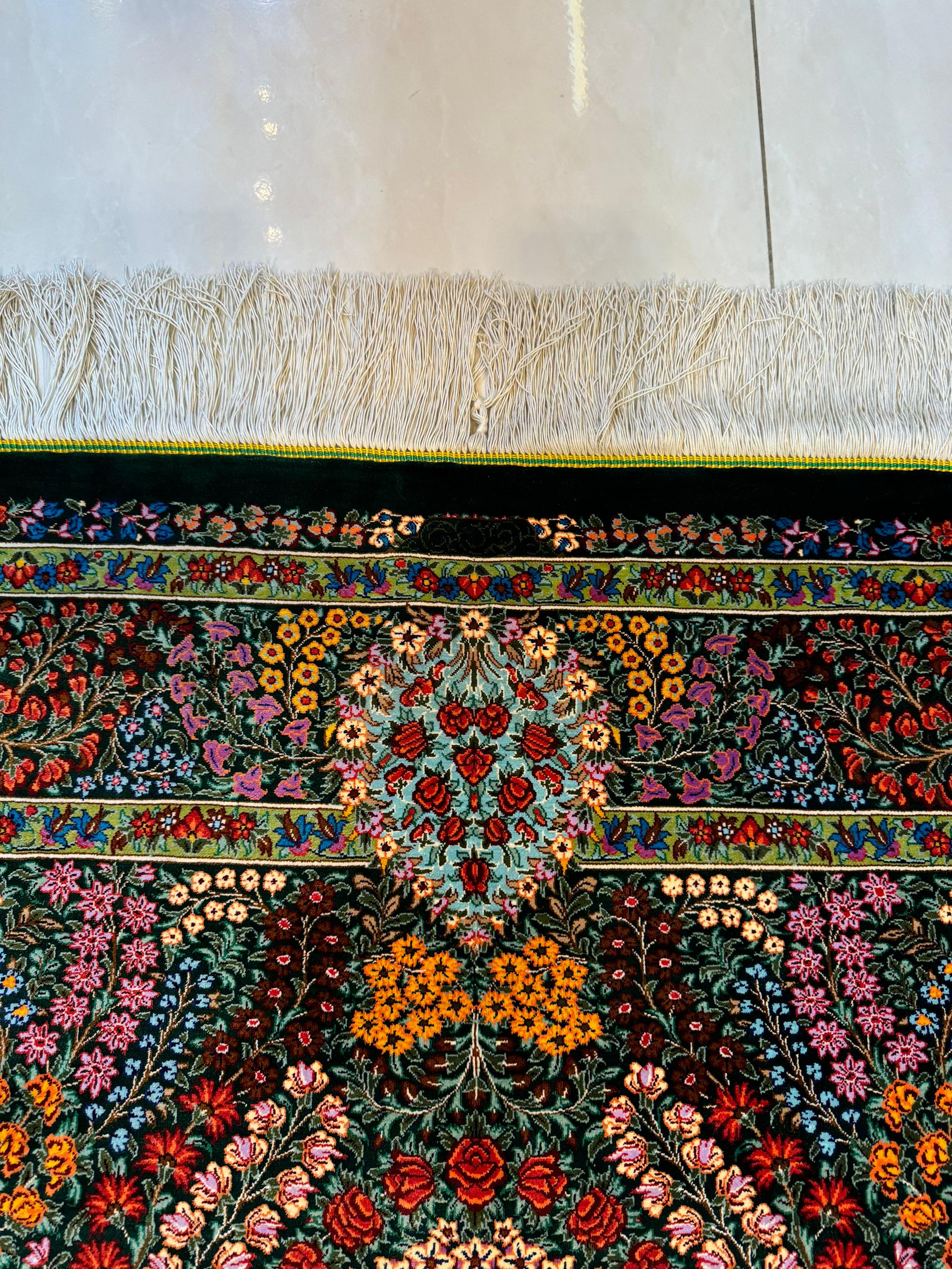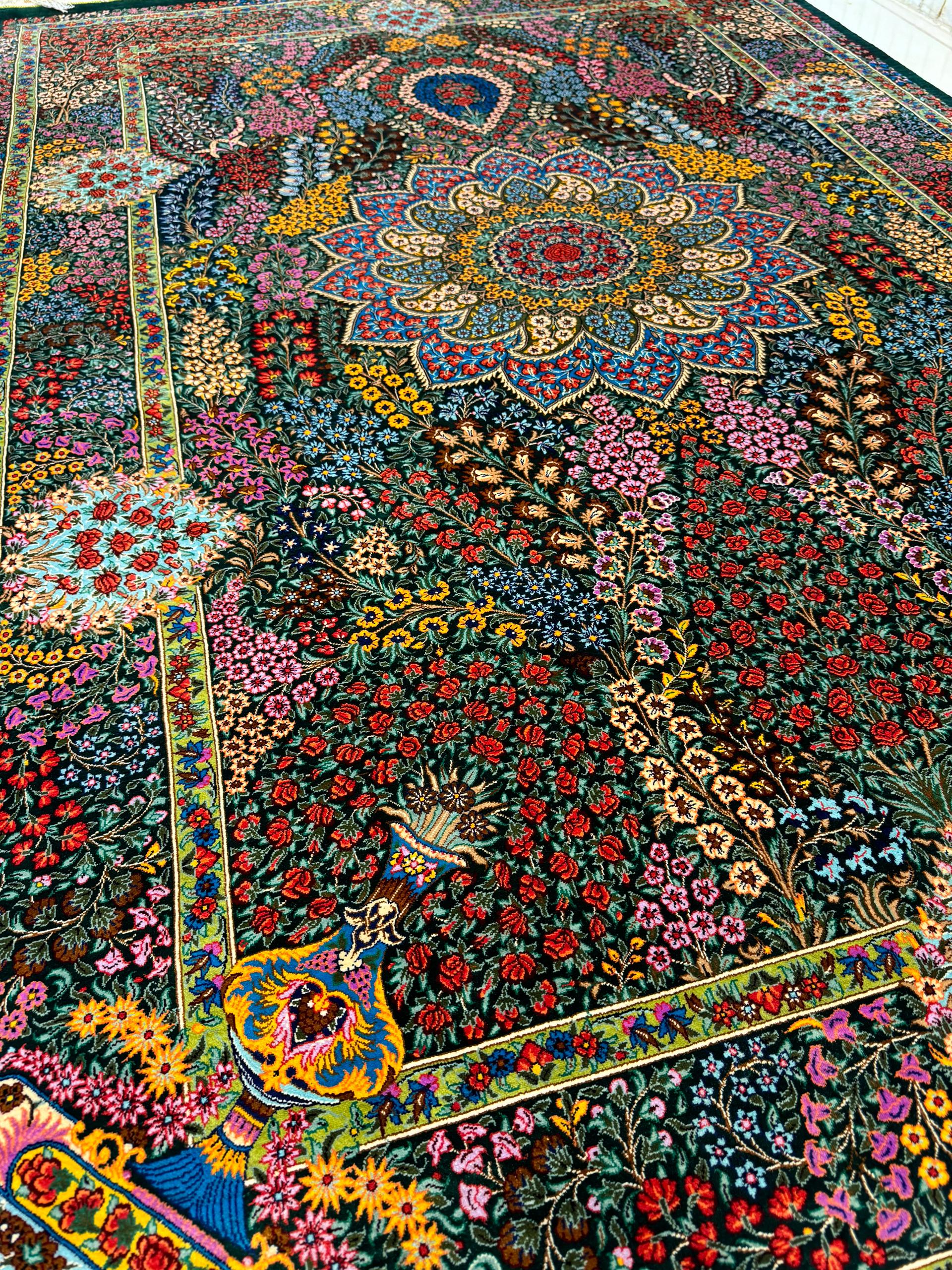 緻密な花柄デザインが特徴の美しいペルシャ絨毯です。深みのあるグリーンを基調に、赤、青、黄色などカラフルな色彩で描かれた花々が贅沢に散りばめられています。中央の花模様は豪華な大輪のデザインで、繊細なタッチが魅力です。周囲には色鮮やかな小花や植物が優雅に配置され、全体に洗練された調和が感じられます。