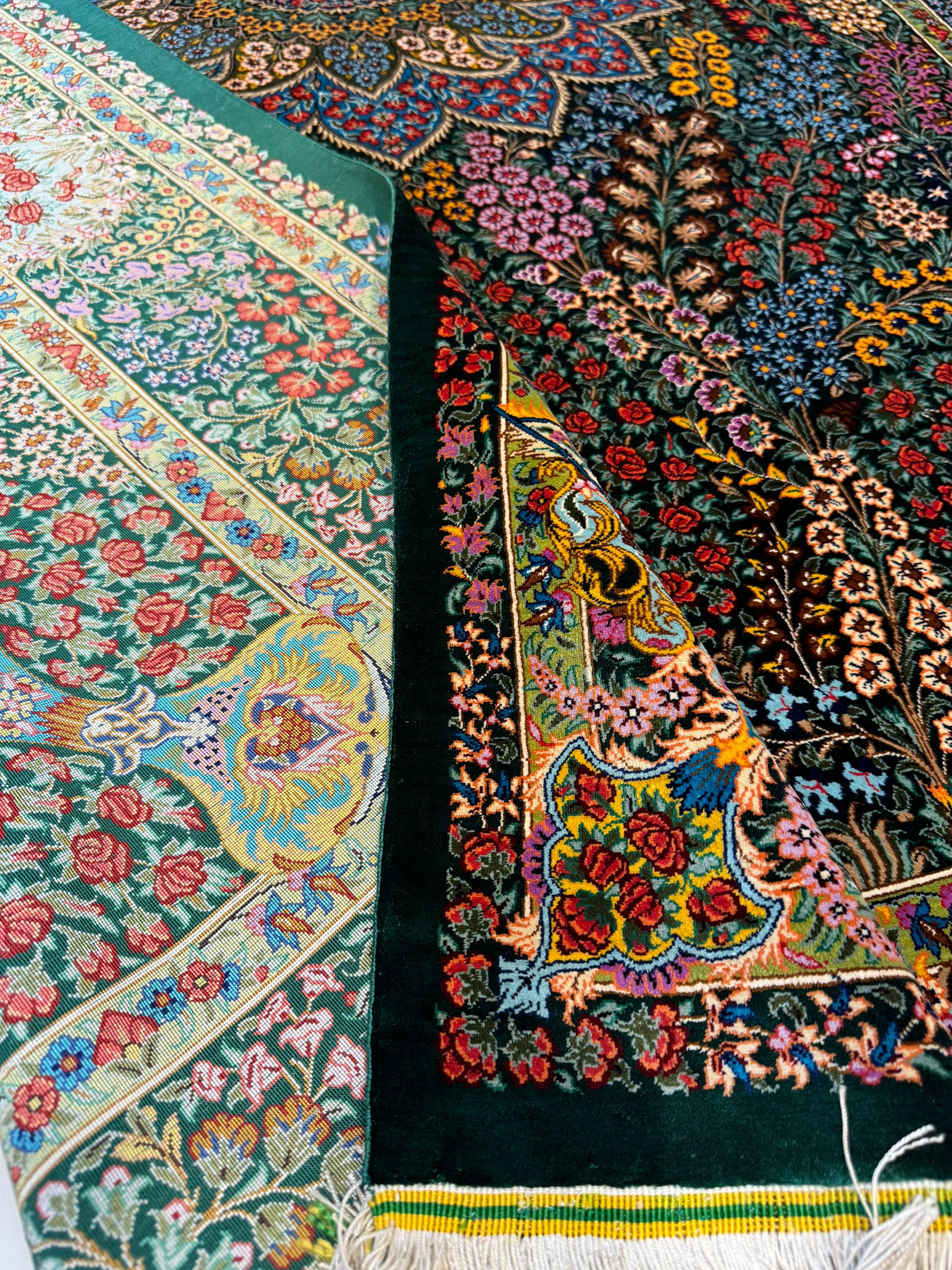 驚くような細かな織り目とビロードのような生地、肌に吸い付くようなシルクの艶やかな光沢感が豪華絢爛。まさに、「The ペルシャ絨毯」と言うべき最高峰のペルシャ絨毯は、もはや工芸品ではなく美術品としての価値となります。シルクの絨毯は毛足の光沢が見る向きによってまったく趣の異なる色合いになりますので、敷く際は向きを調整してください。