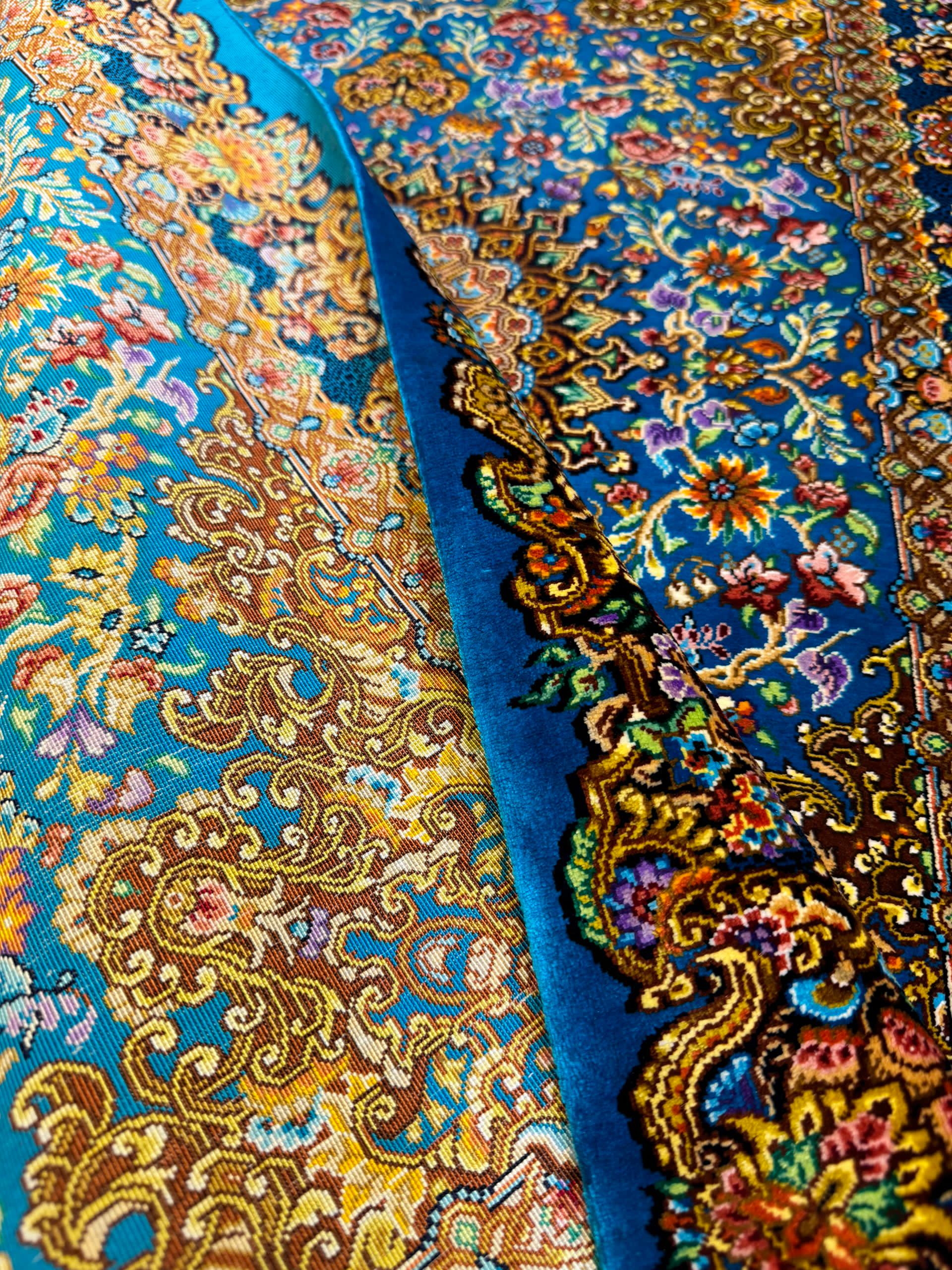 鮮やかな青色を基調にした絨毯で、緻密なフローラルモチーフが美しく描かれています。伝統的な技法で仕上げられ、どんな空間にもエレガントな雰囲気を加えます。縁取りには金色の模様がアクセントとして施され、全体に華やかさと高級感を演出しています。