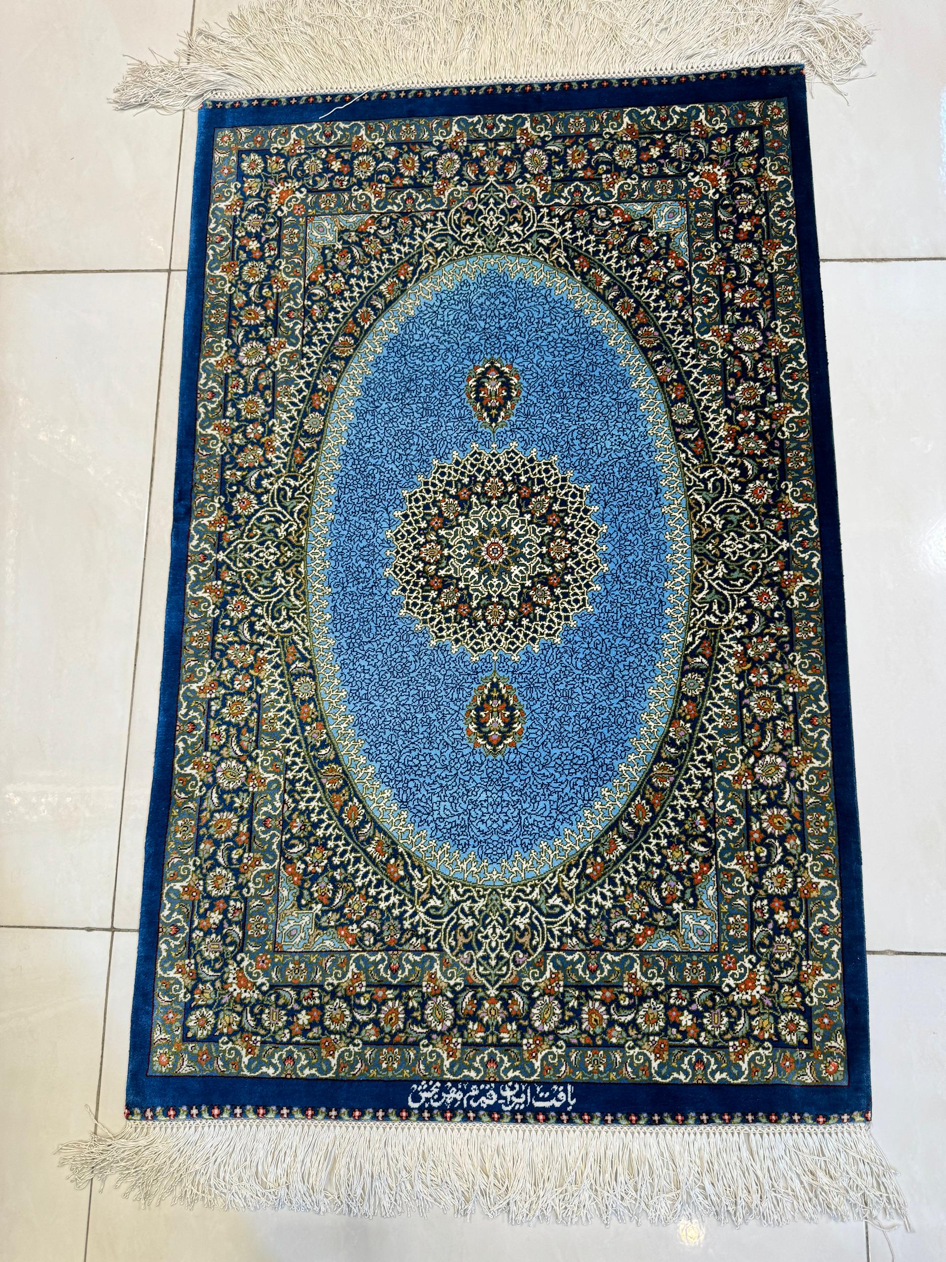 高級ペルシャ絨毯クム産シルク100% メフルバフ工房 92×58cm(FN-10037)